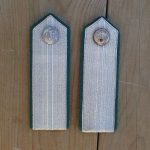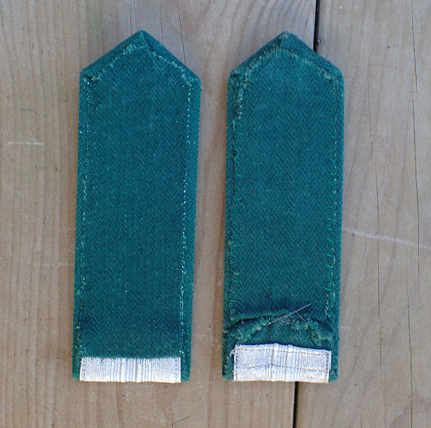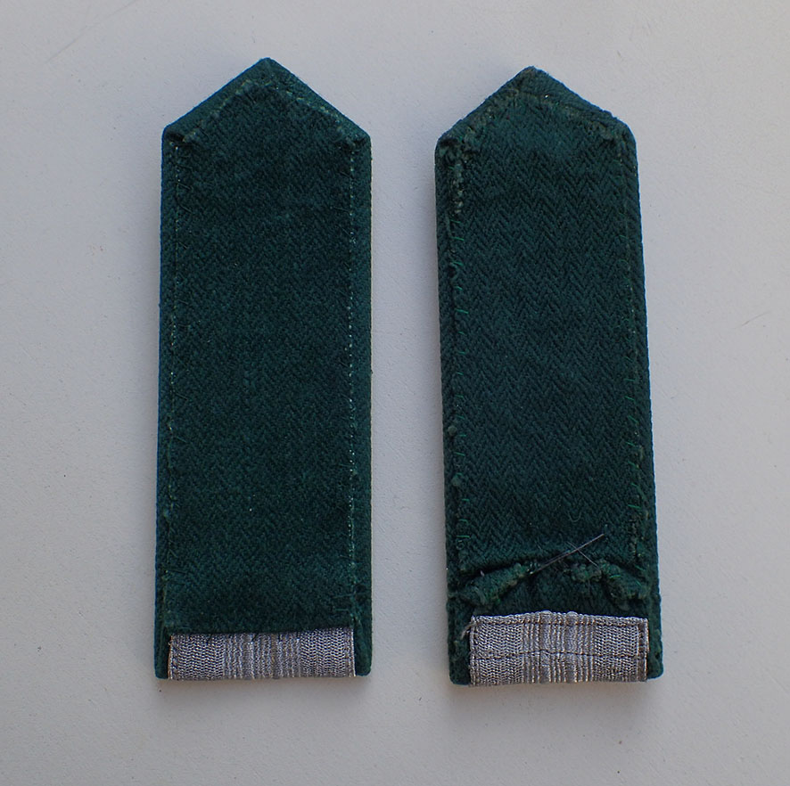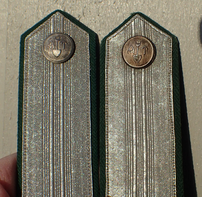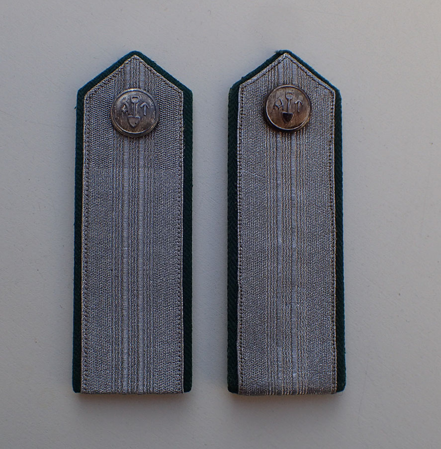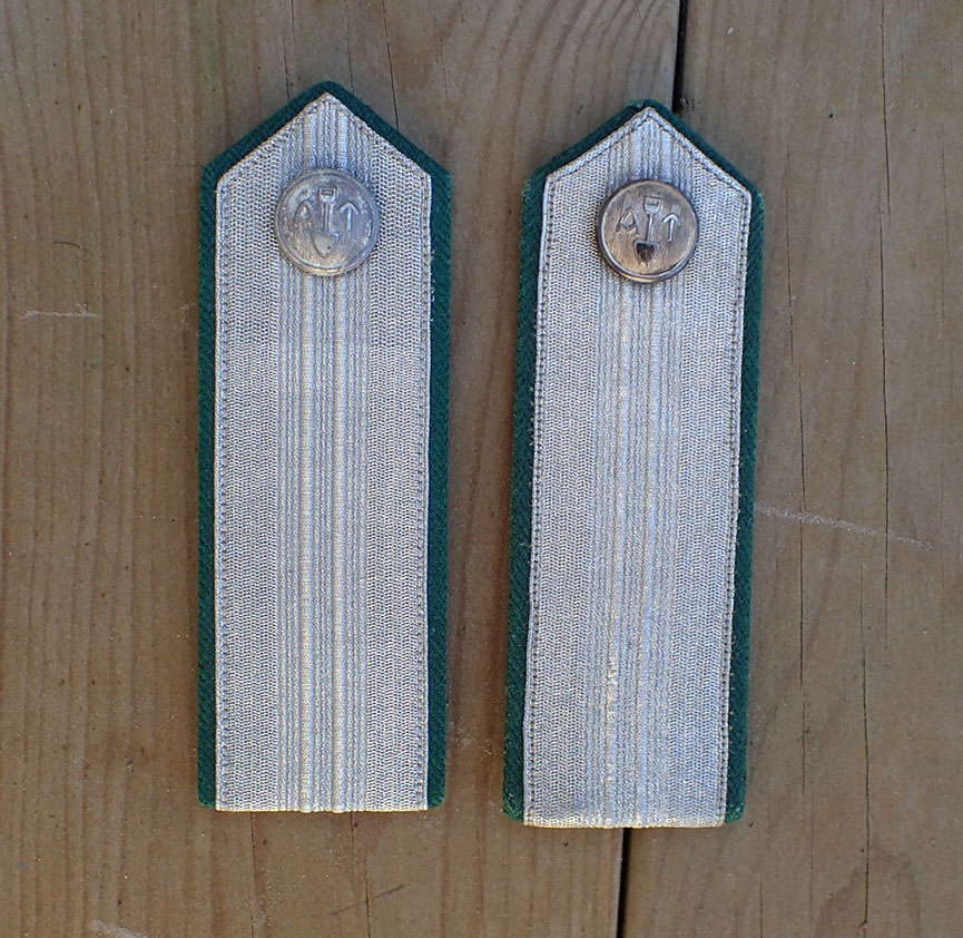 AT Troppfører skulderklaffer. Skulderklaffene har sølv heldekkende stripete stoff oppå og med grønn fiskebensmønstret bomullsstoff under. Med forsølvet AT knapper. Innvendig med sink plater.