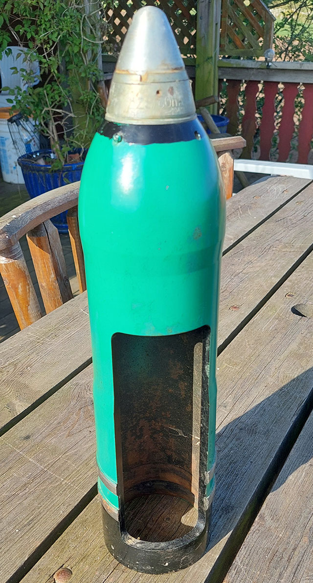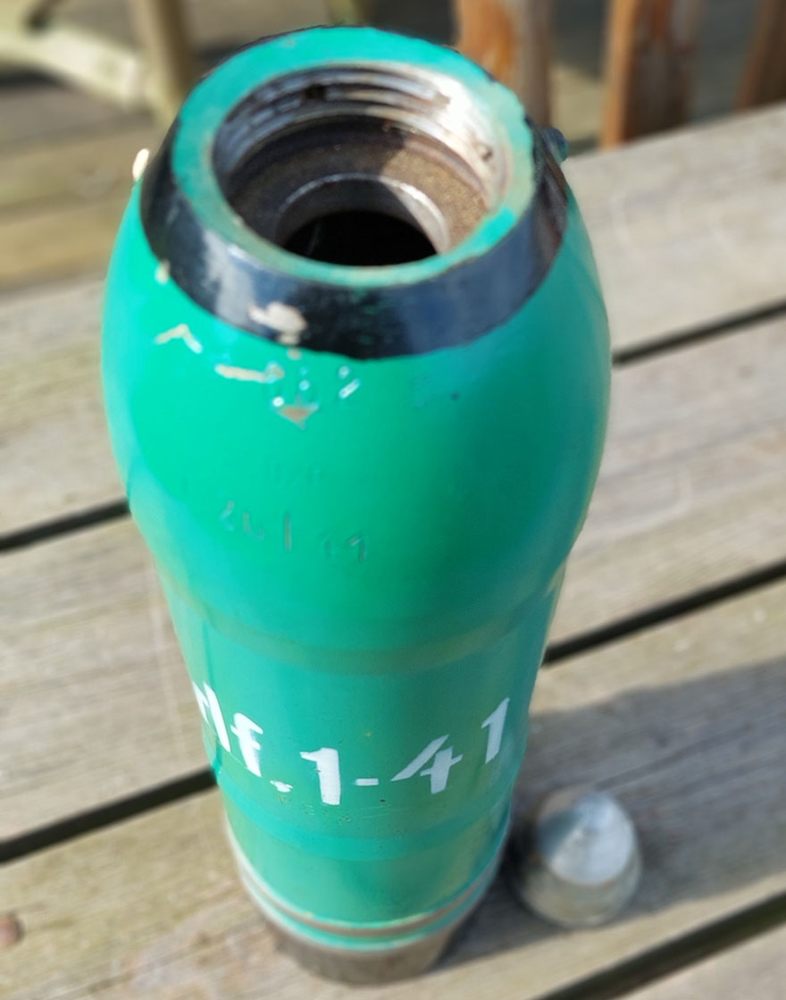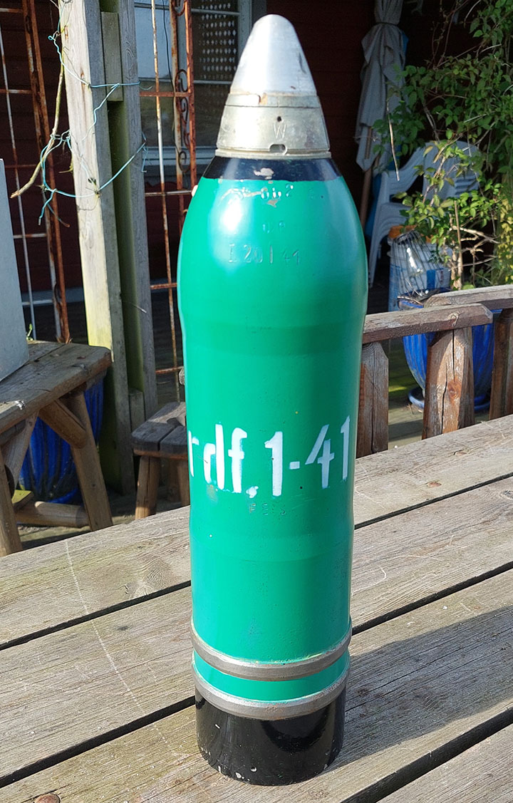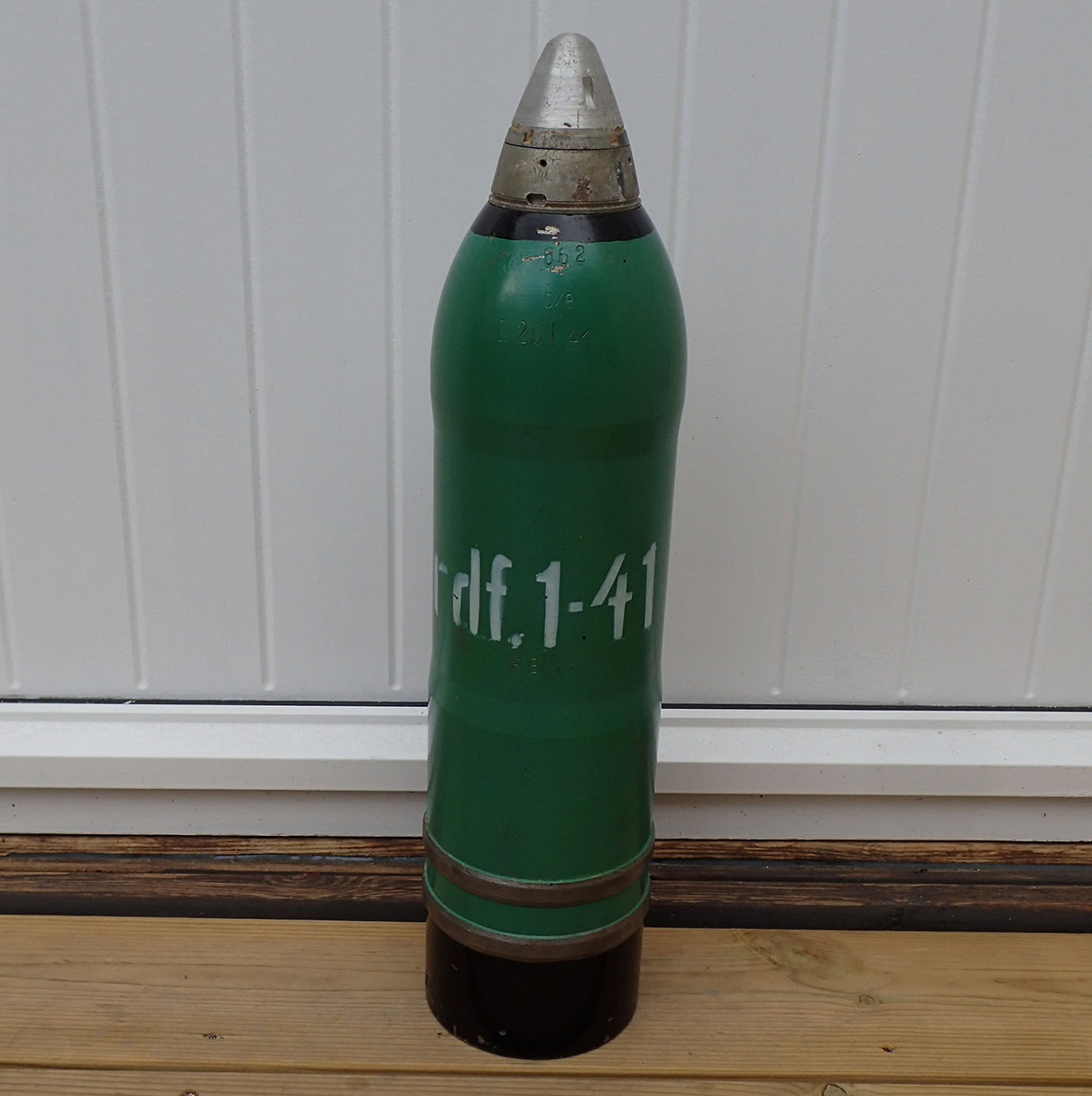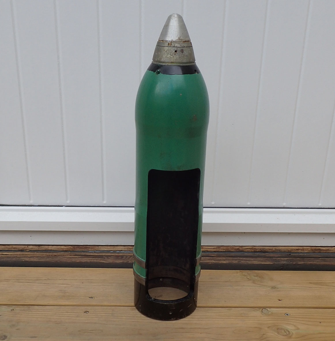 10,5 cm. SK C/32 Kriegsmarine granat brukt til undervisning. Med den originale tyske glatte grønne malingen, som ofte ble brukt på undervisnings-granater. Sjablong-malt tekst i hvit rdf.1-41. Stemplet inn på selve granaten L 20/41 + bxe + 662 + F E S + 2 stk. KM Waffen Amt. M I/3. Så er det skjært ut ett stykke av baksiden, slik at man ser hvordan granaten ser ut innvendig og hvor tykk gods som er brukt i den.