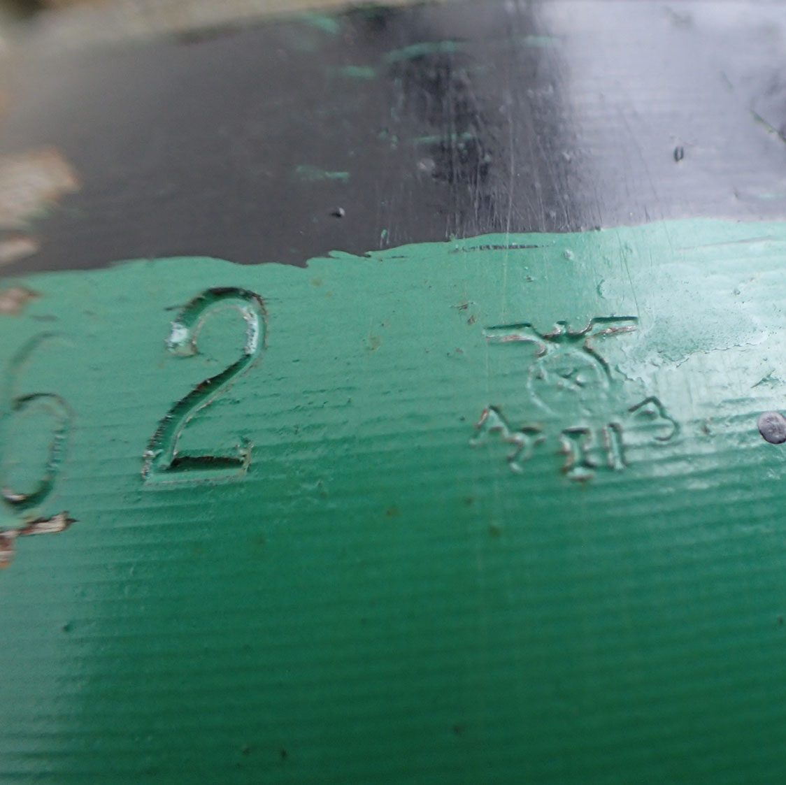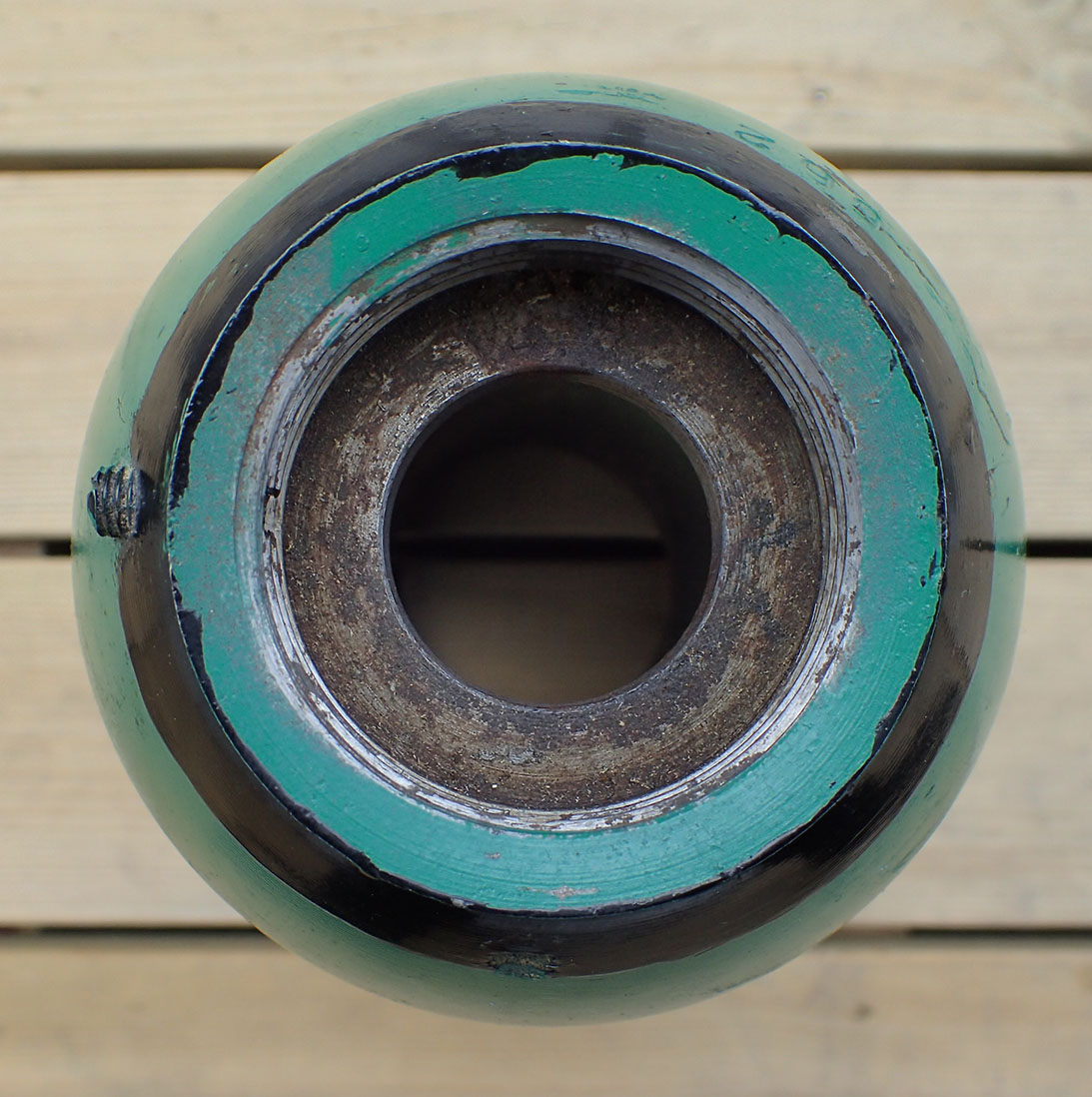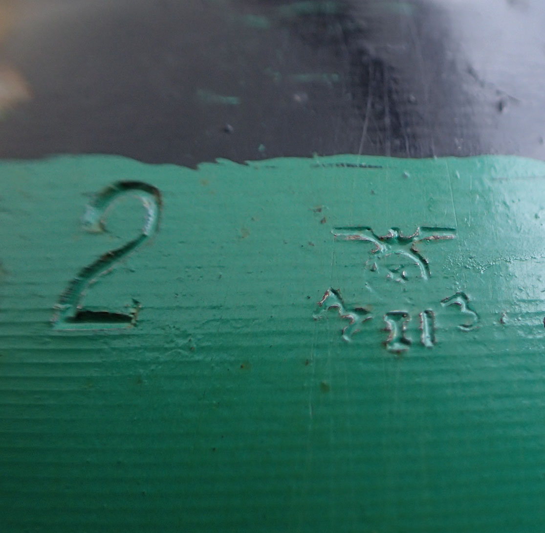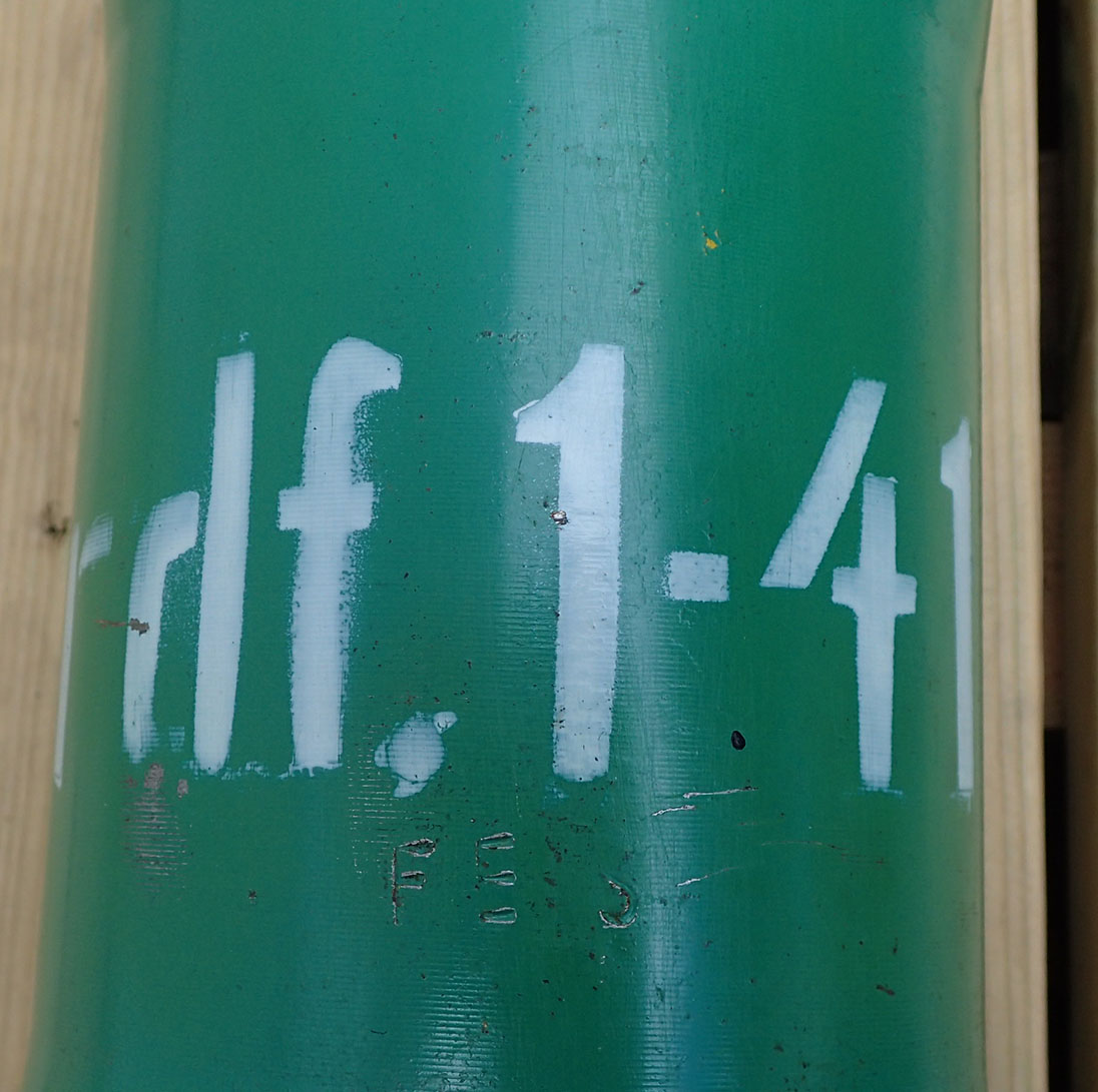10,5 cm. SK C/32 Kriegsmarine granat brukt til undervisning. Med den originale tyske glatte grønne malingen, som ofte ble brukt på undervisnings-granater. Sjablong-malt tekst i hvit rdf.1-41. Stemplet inn på selve granaten L 20/41 + bxe + 662 + F E S + 2 stk. KM Waffen Amt. M I/3. Så er det skjært ut ett stykke av baksiden, slik at man ser hvordan granaten ser ut innvendig og hvor tykk gods som er brukt i den.