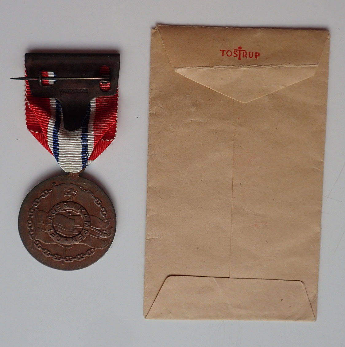 Deltagermedaljen 1940-1945 med rosett i papirpose. Medaljen er produsert i patinert messing. Med en rosett som er pånaglet båndet. Med messing nålhempe bak som er merket J.TOSTRUP.