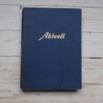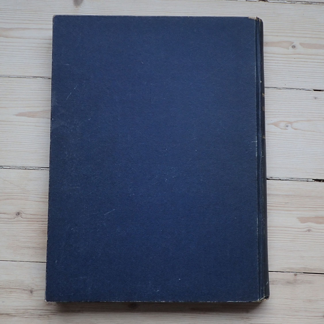 Med tykke blå permer trykket i gull foran og på ryggen.