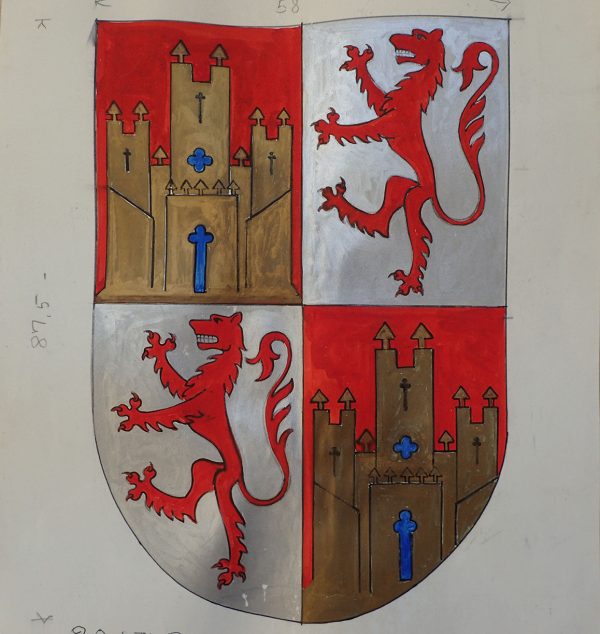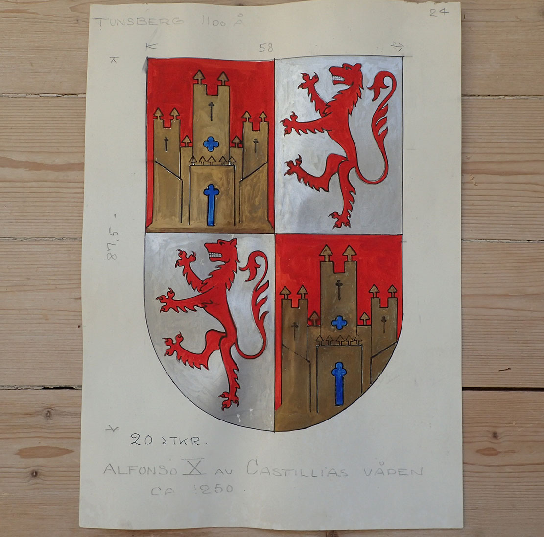 Akvarell. TUNSBERG 1100 ÅR. ALFONSO X AV CASTELLIAS VÅPEN.