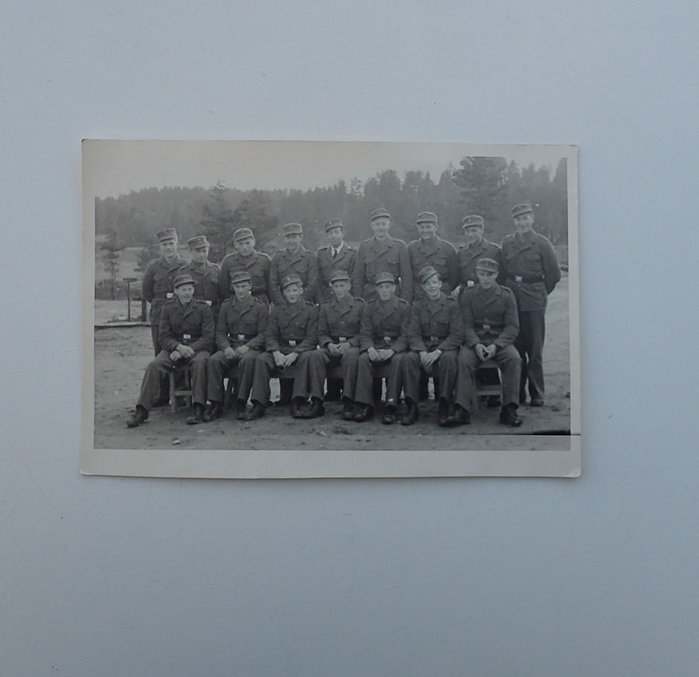Arbeidstjenesten Lagsbilde. Fotografiet er trykket på stiv kartong. Forestillende 16 AT menige hvorav en Lagfører i midten med hvit skjorte.