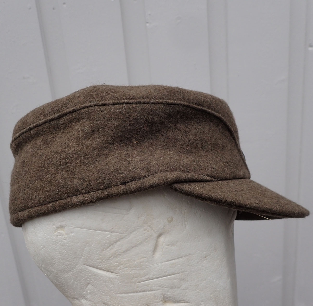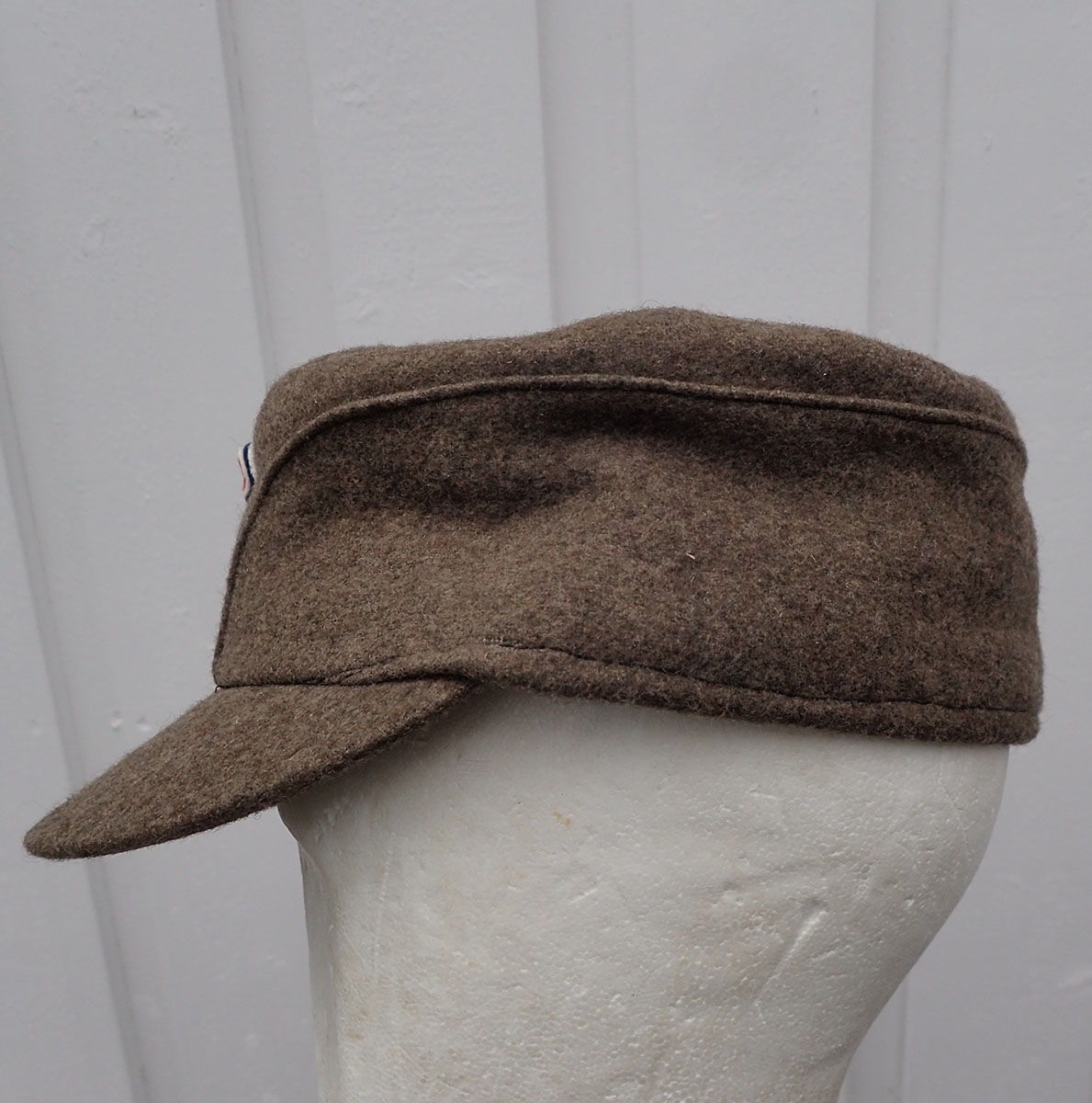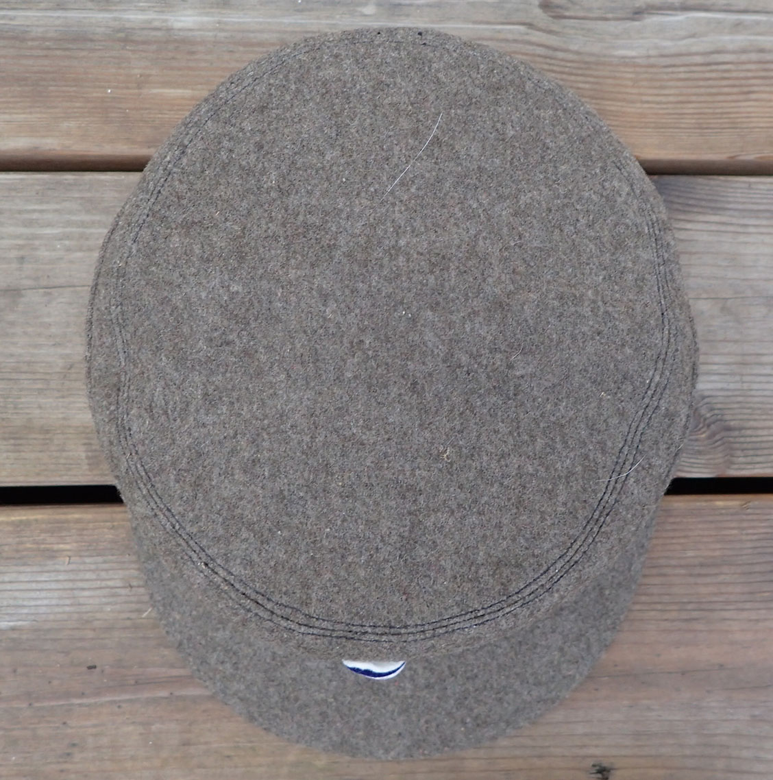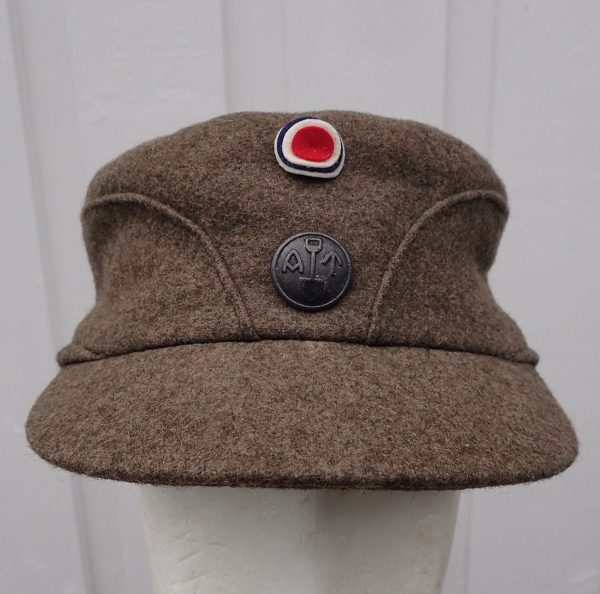 Arbeidstjenesten menig kepi. Sydd i brun uniformsstoff. I fronten original påsydd nasjonalkokarde i bomull og under sort AT knapp. Innvendig med kaki bomullsfòr og stemplet med sort A.T. i ramme og størrelsen 56. Rundt kanten svettebånd i brun erstatningslær.