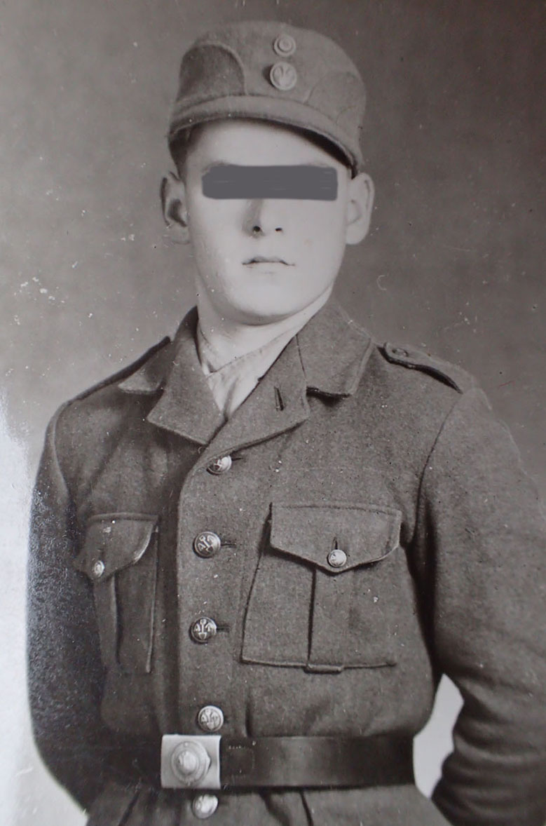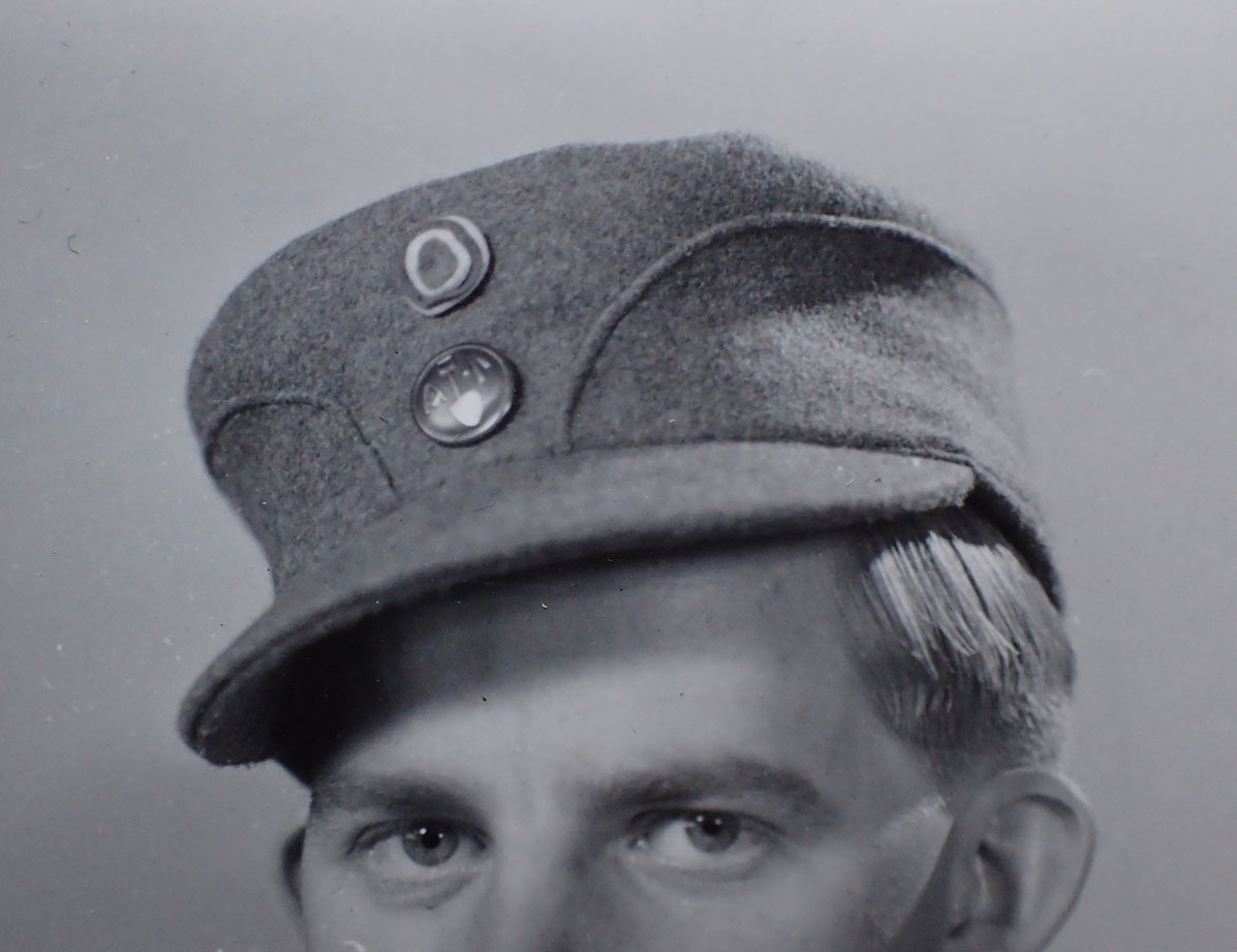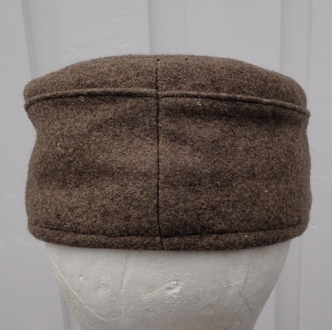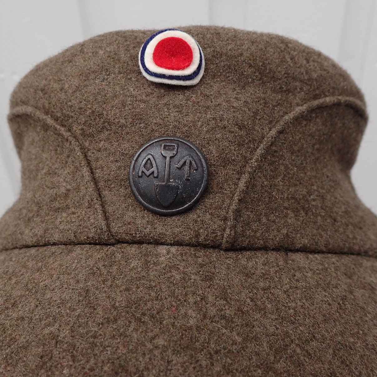 Arbeidstjenesten menig kepi. Sydd i brun uniformsstoff. I fronten original påsydd nasjonalkokarde i bomull og under sort AT knapp. Innvendig med kaki bomullsfòr og stemplet med sort A.T. i ramme og størrelsen 56. Rundt kanten svettebånd i brun erstatningslær.