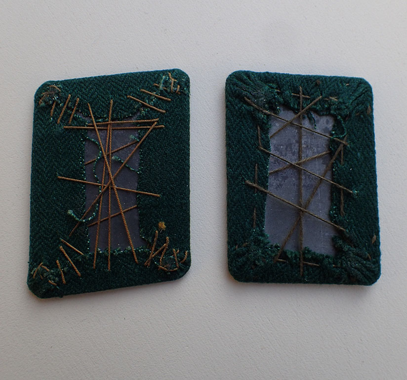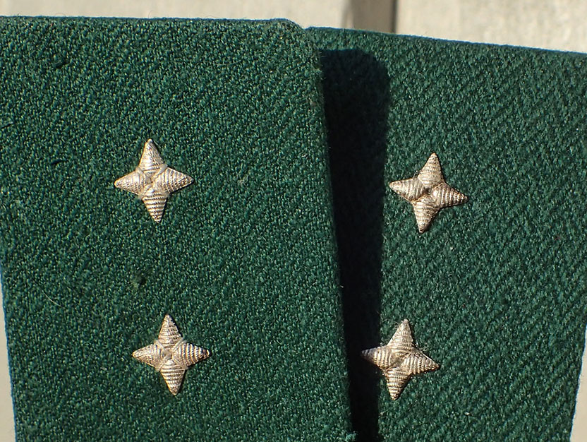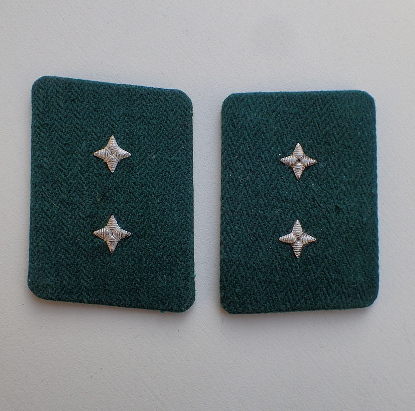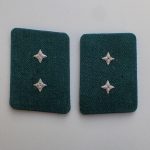 AT Overlagfører kravespeil. Kravespeilene har grønn fiskebensmønstret bomullsstoff. Påsydd to stjerner på hvert speil. Innvendig med sink plater.