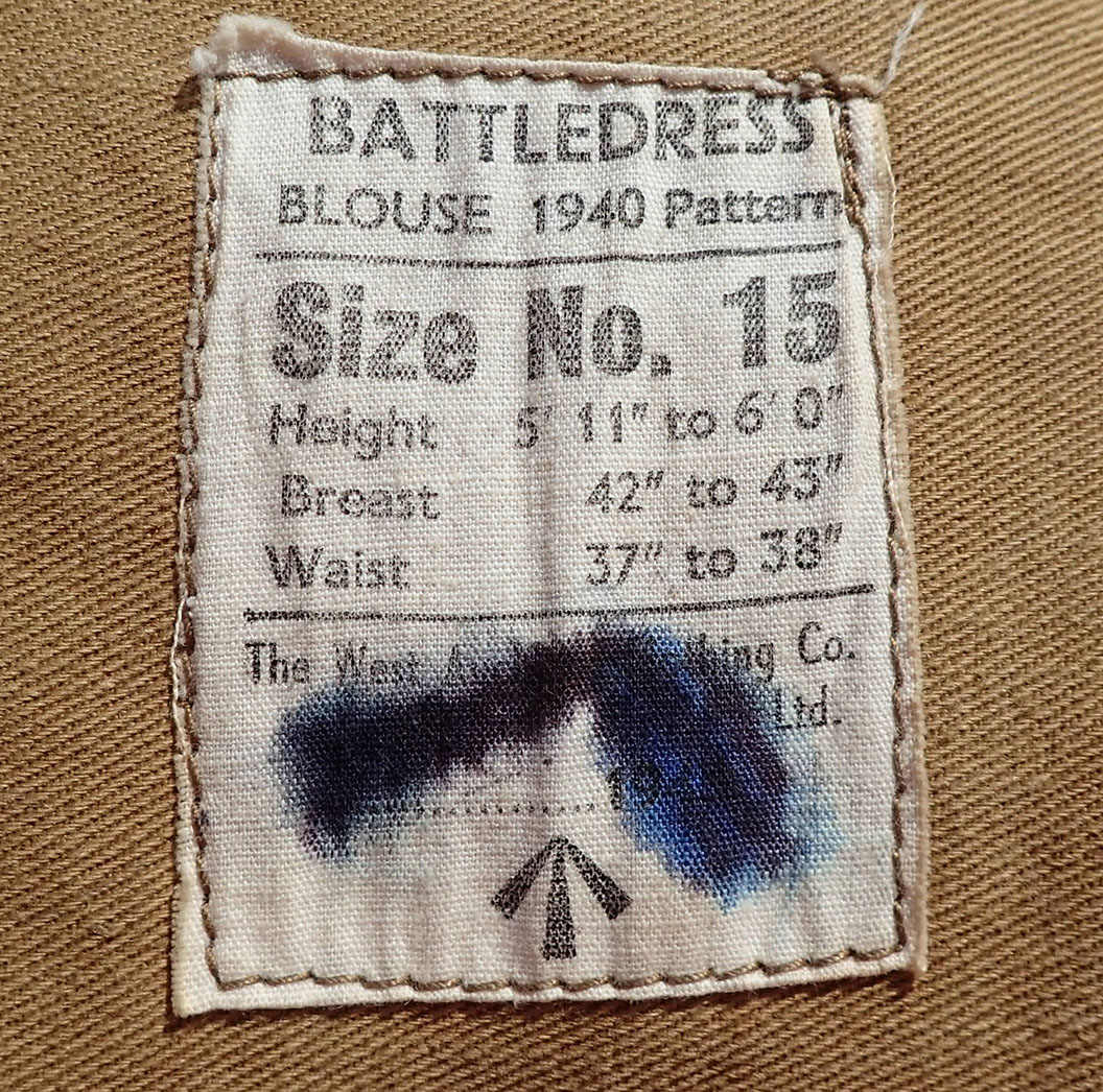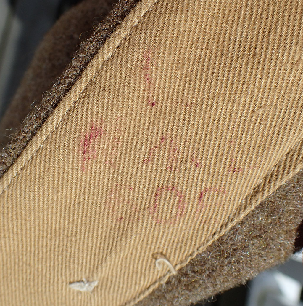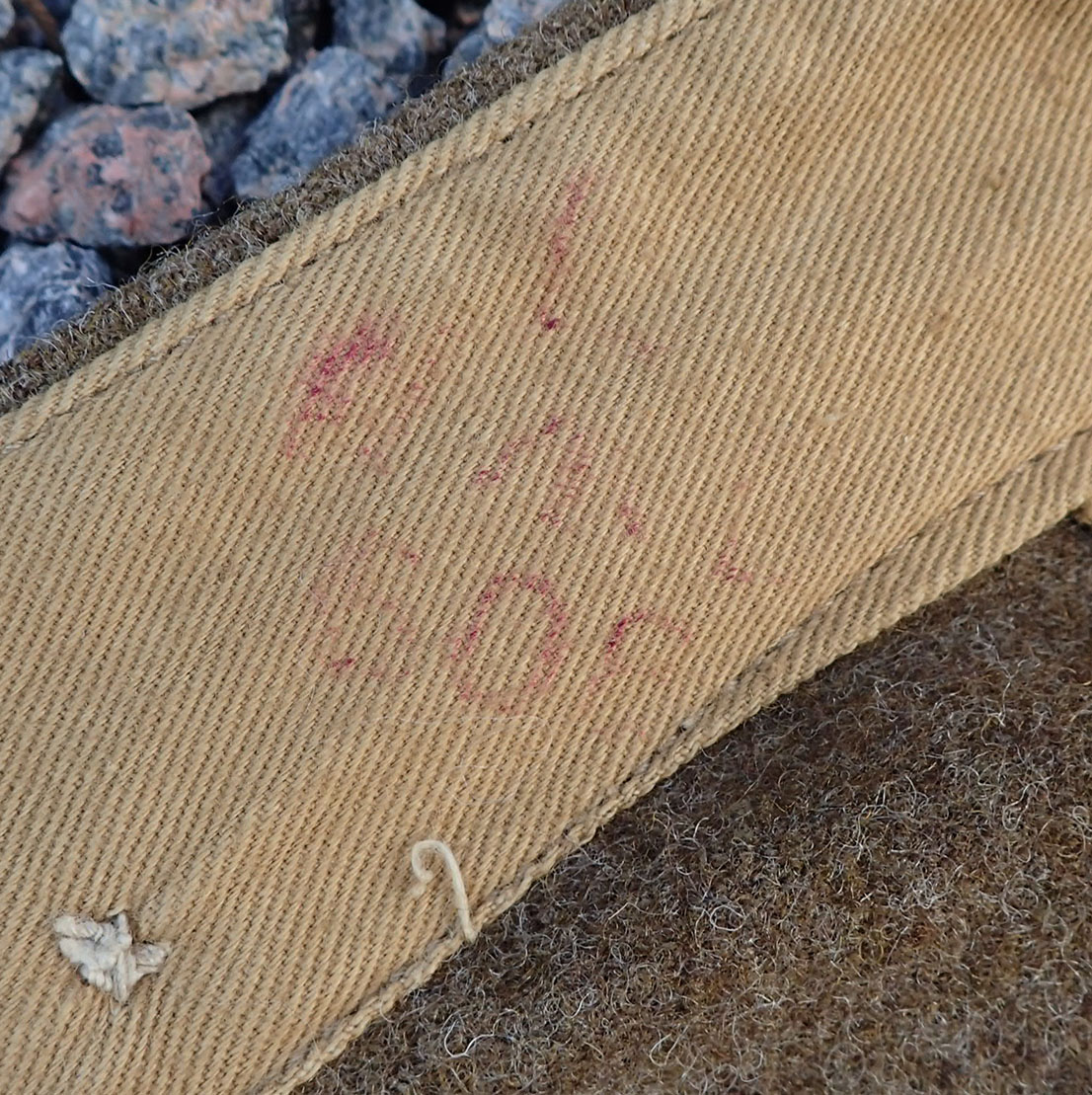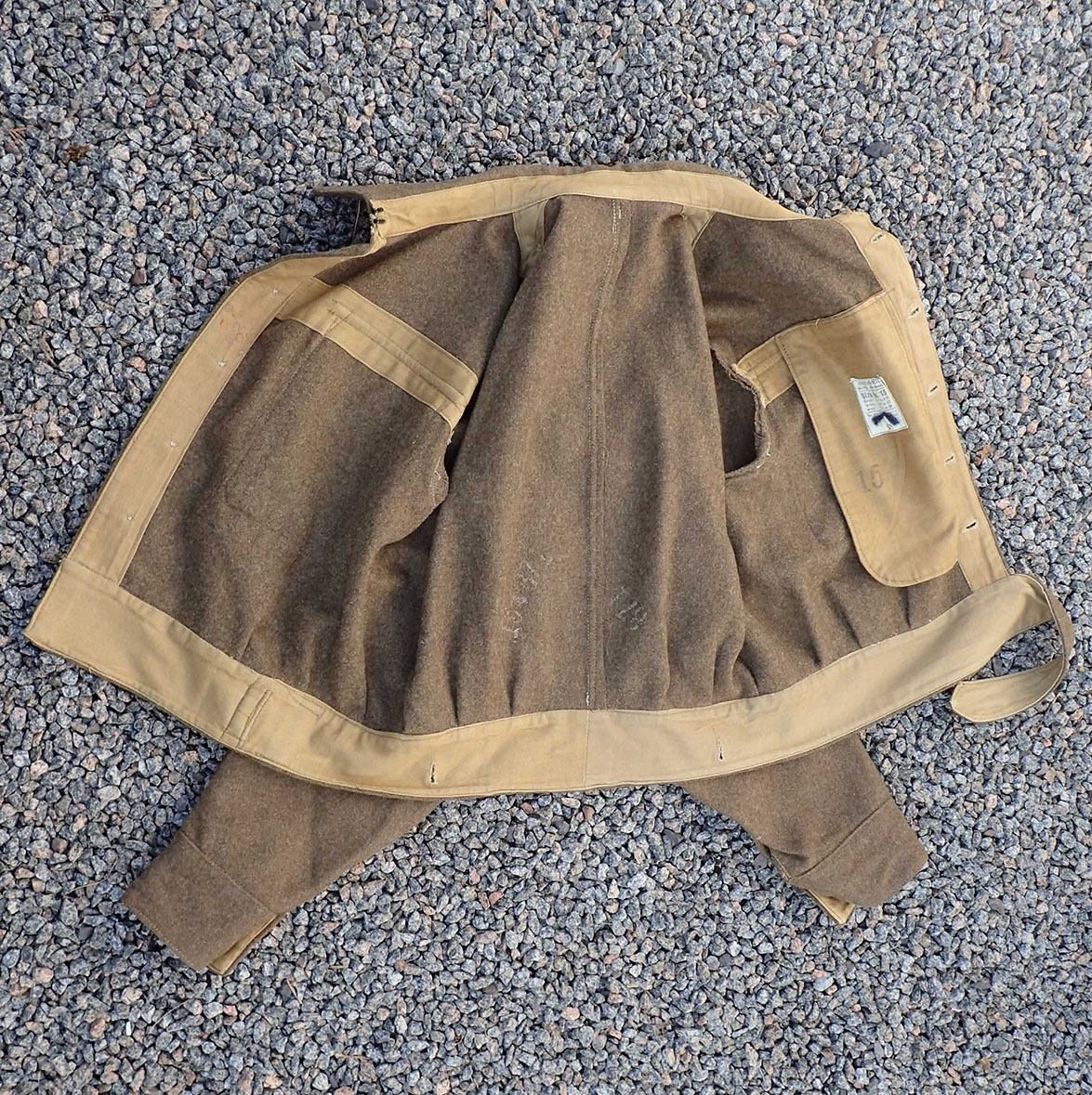 Innvendig med beige bomullsfòr. Stemplet på lommen størrelsen med sort blekk 15. Med skredderetikett maskinpåsydd. Merket Size No. 15 som er stor størrelse, ca. 54. Over produsenten og årstallet, påført en hake med blå blekk, men man kan tyde årstallet 1945. Det samme stemplet med rødt på linningen; War Department koden W kråkefot D med I over som står for 1945. På selve feltstoffet stemplet ett nummer med hvit maling.
