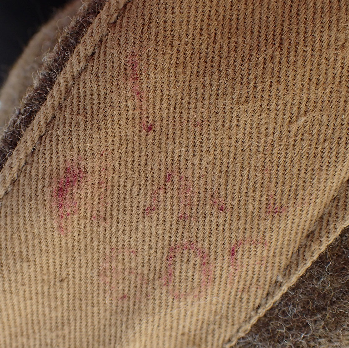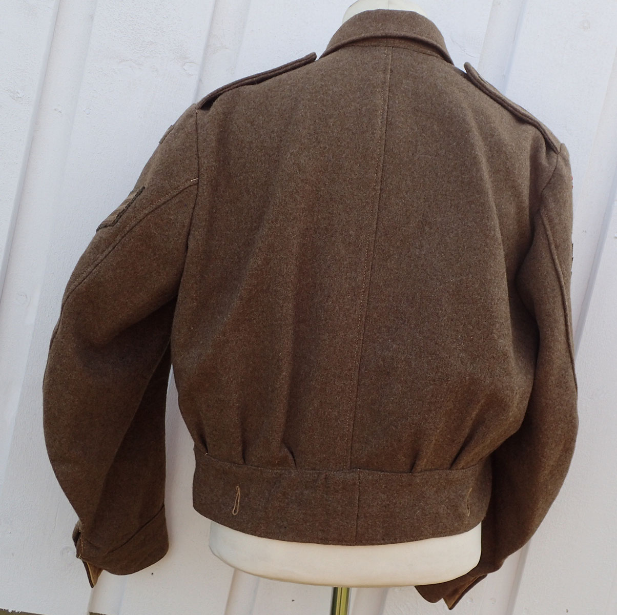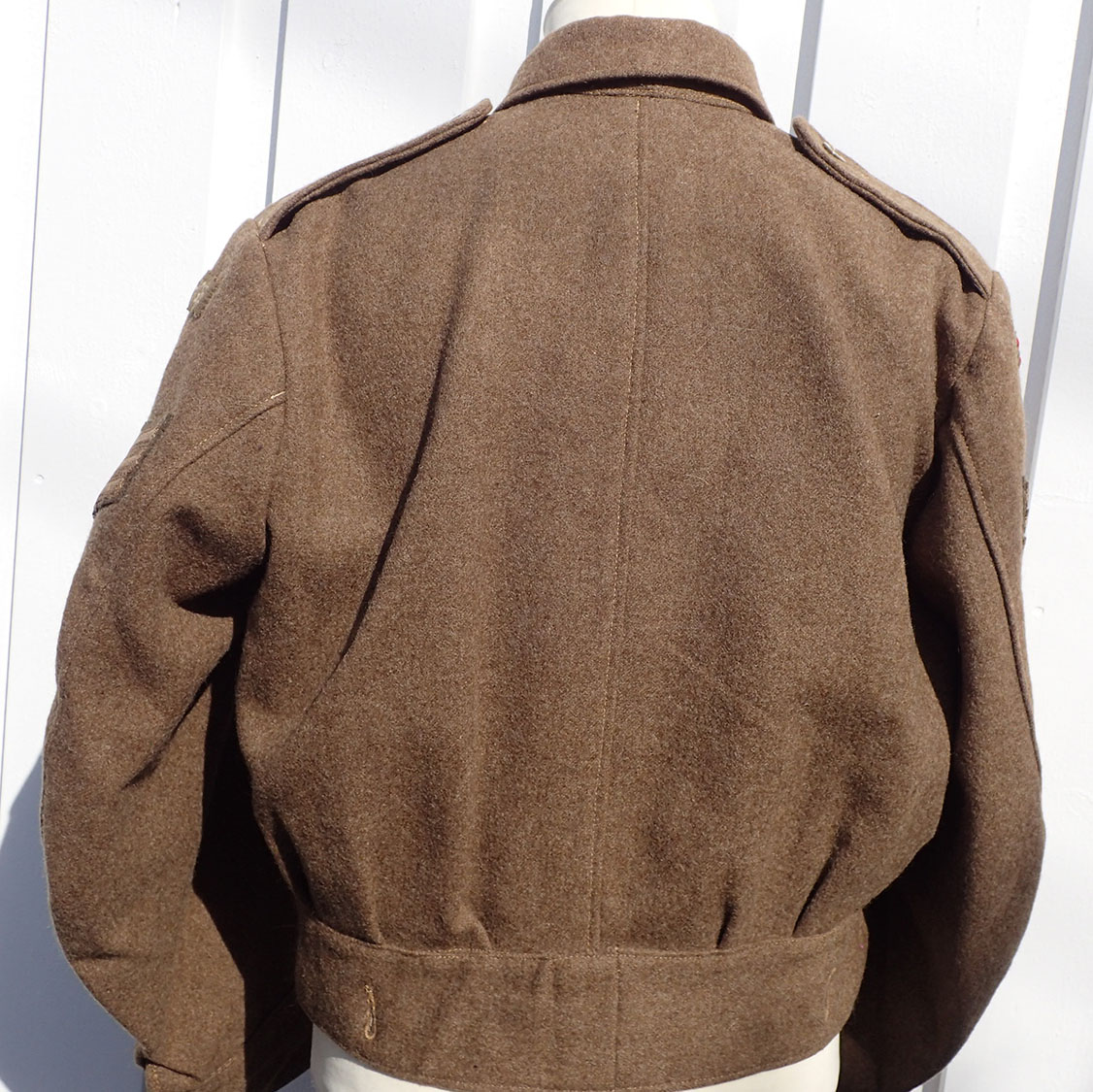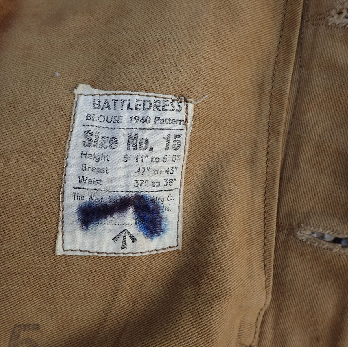 Innvendig med beige bomullsfòr. Stemplet på lommen størrelsen med sort blekk 15. Med skredderetikett maskinpåsydd. Merket Size No. 15 som er stor størrelse, ca. 54. Over produsenten og årstallet, påført en hake med blå blekk, men man kan tyde årstallet 1945. Det samme stemplet med rødt på linningen; War Department koden W kråkefot D med I over som står for 1945. På selve feltstoffet stemplet ett nummer med hvit maling.
