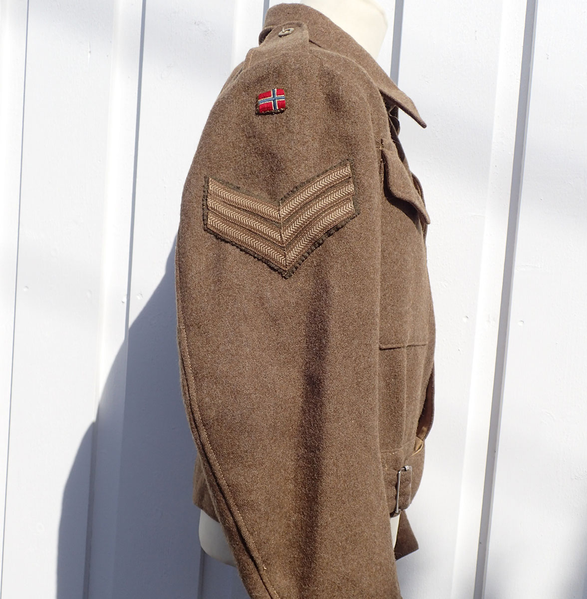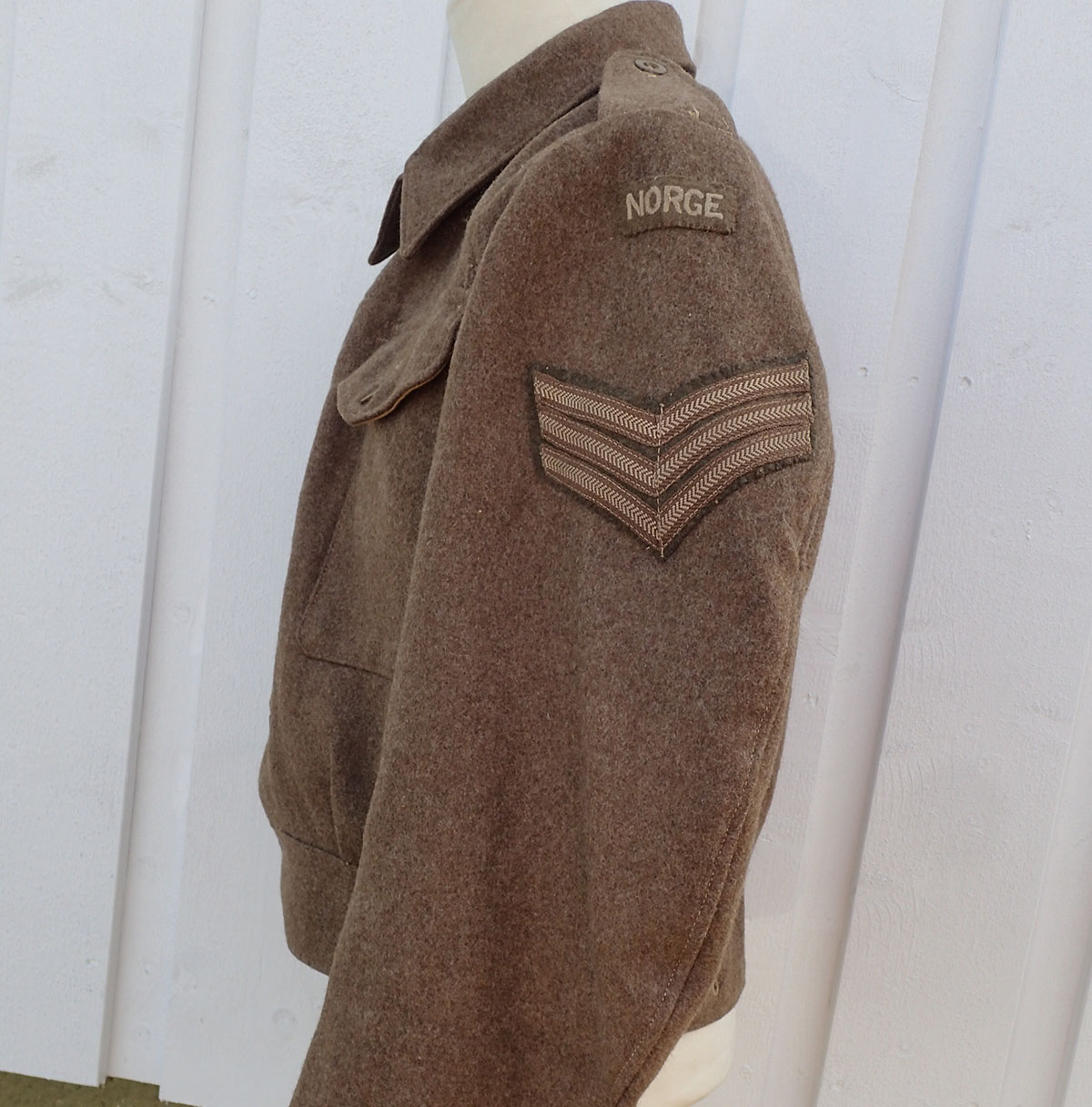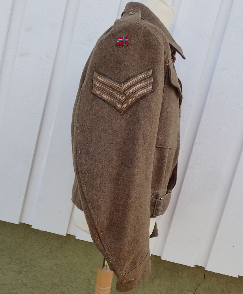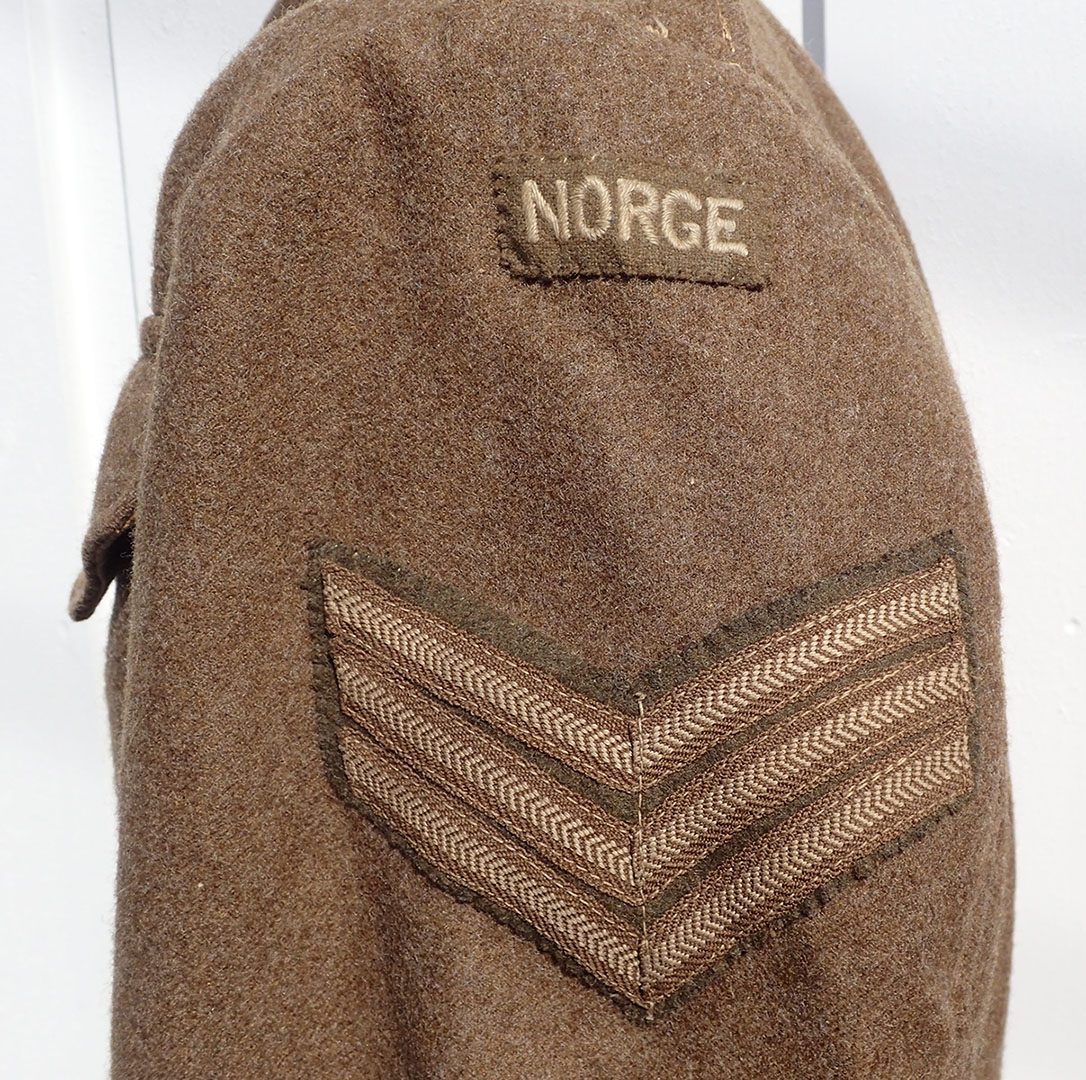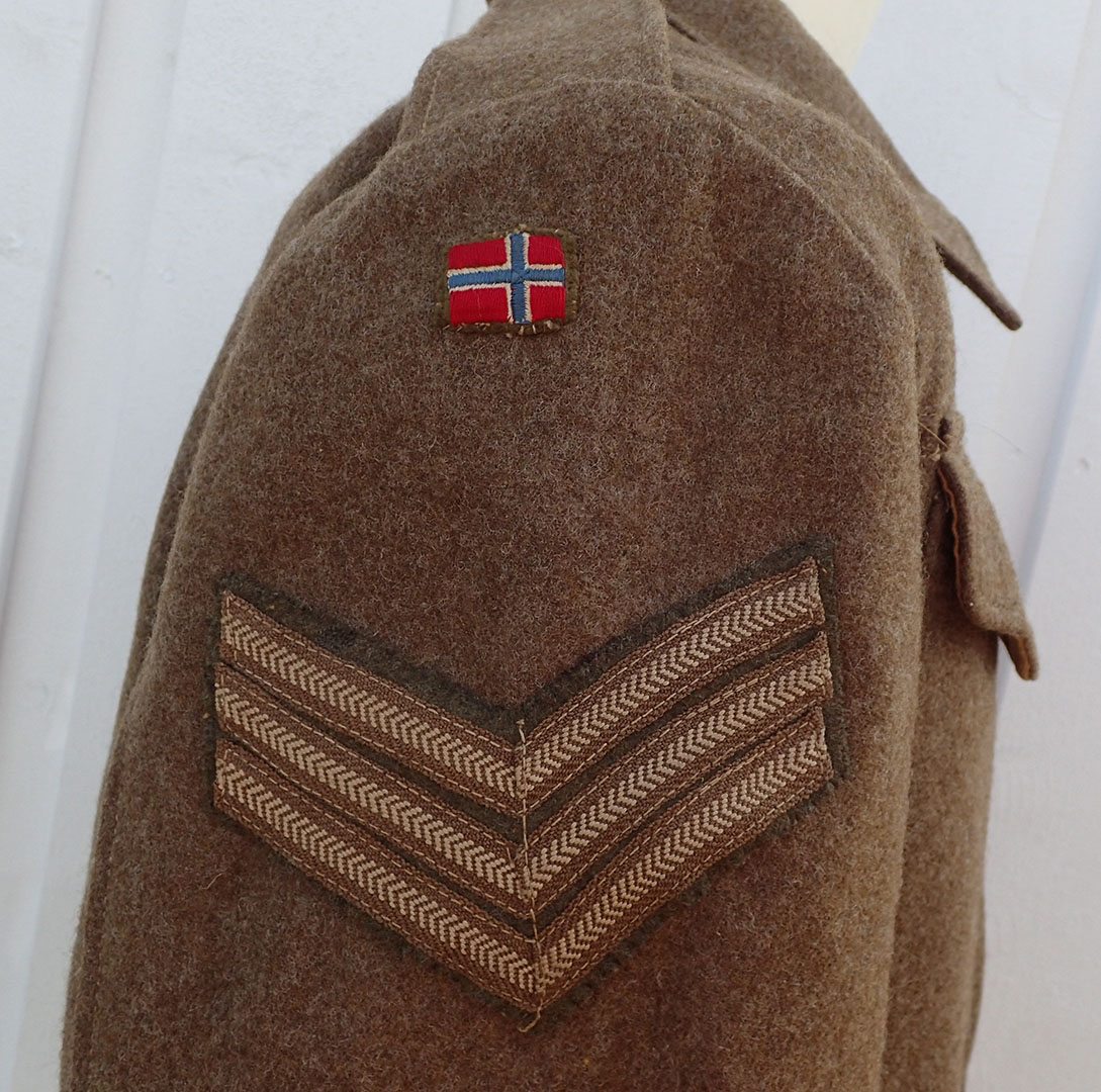 Battlejakke til en norsk sersjant. Modell 1940 battlejakke med synlige knapper i fronten. Sydd i brun feltstoff med grønne bakelitt-knapper. I halsen doble hemper i metall. Nede med strammebelte og beltespenne i rustfritt stål. På den ene armen krigsprodusert FLAGG armmerke i tykk bomull og med krigsprodusert armvinkel for sersjant. På den andre armen krigsprodusert NORGE armmerke i tykk bomull og med krigsprodusert armvinkel for sersjant.