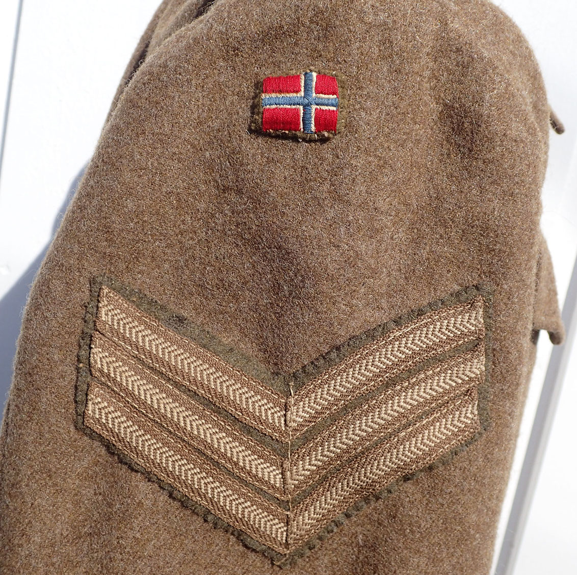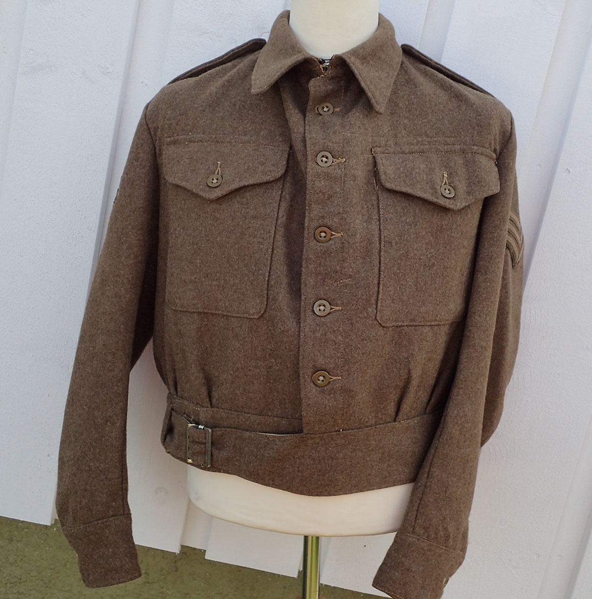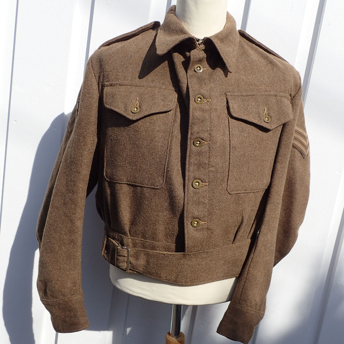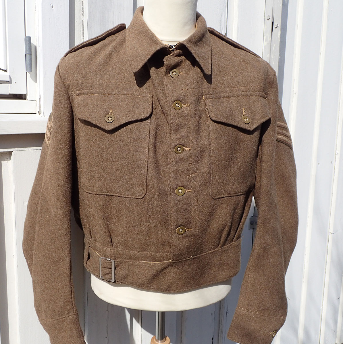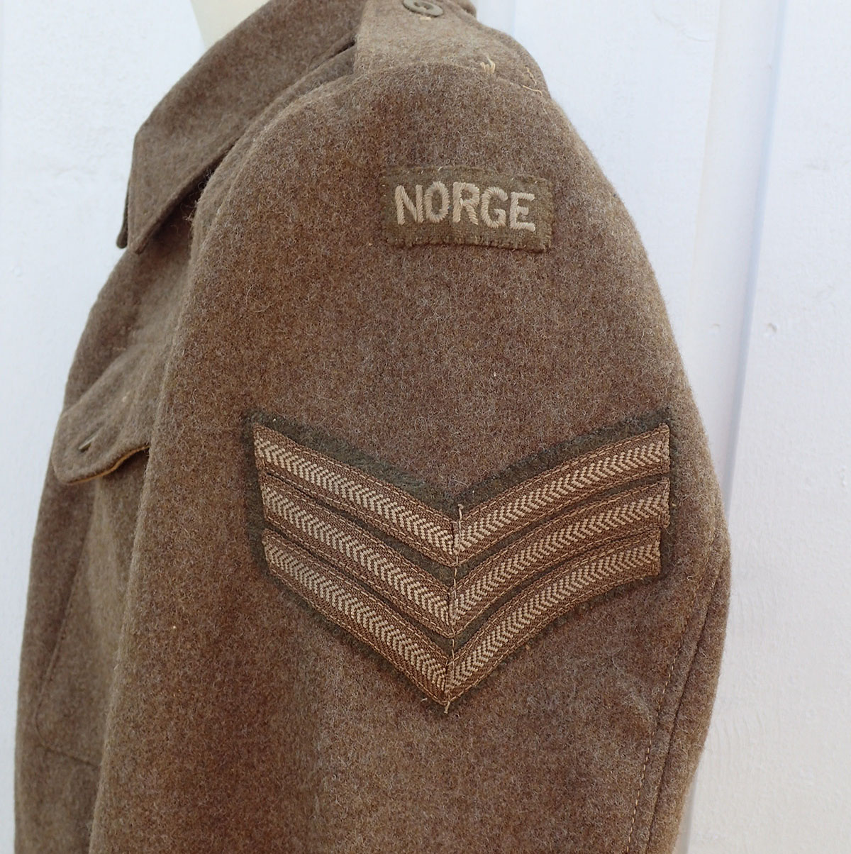 Battlejakke til en norsk sersjant. Modell 1940 battlejakke med synlige knapper i fronten. Sydd i brun feltstoff med grønne bakelitt-knapper. I halsen doble hemper i metall. Nede med strammebelte og beltespenne i rustfritt stål. På den ene armen krigsprodusert FLAGG armmerke i tykk bomull og med krigsprodusert armvinkel for sersjant. På den andre armen krigsprodusert NORGE armmerke i tykk bomull og med krigsprodusert armvinkel for sersjant.