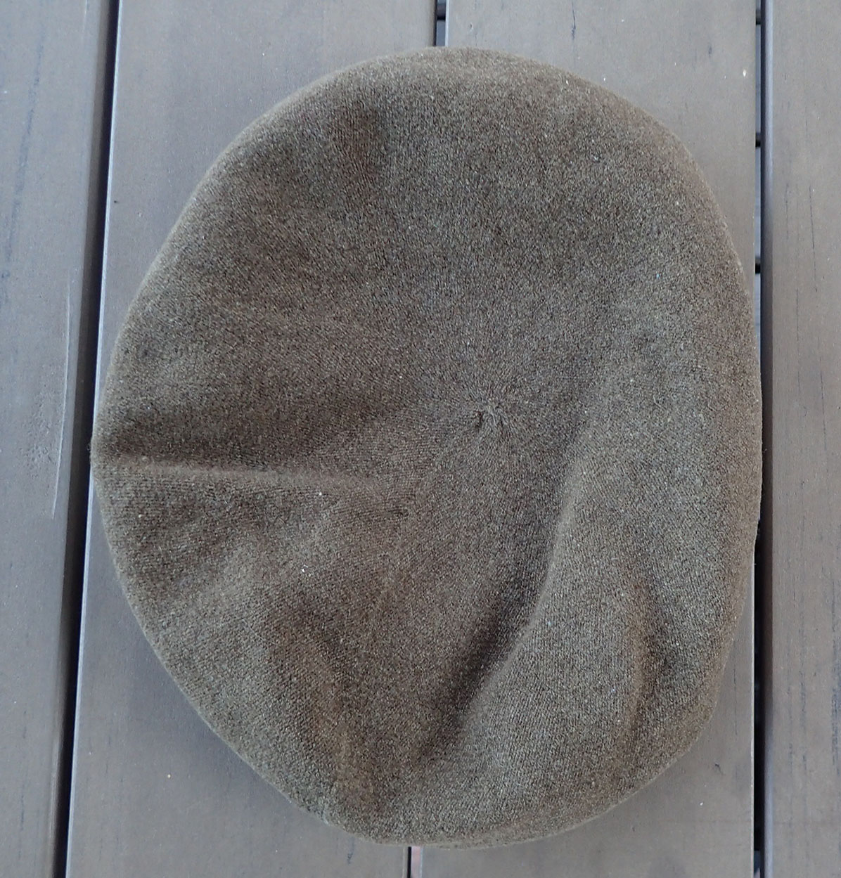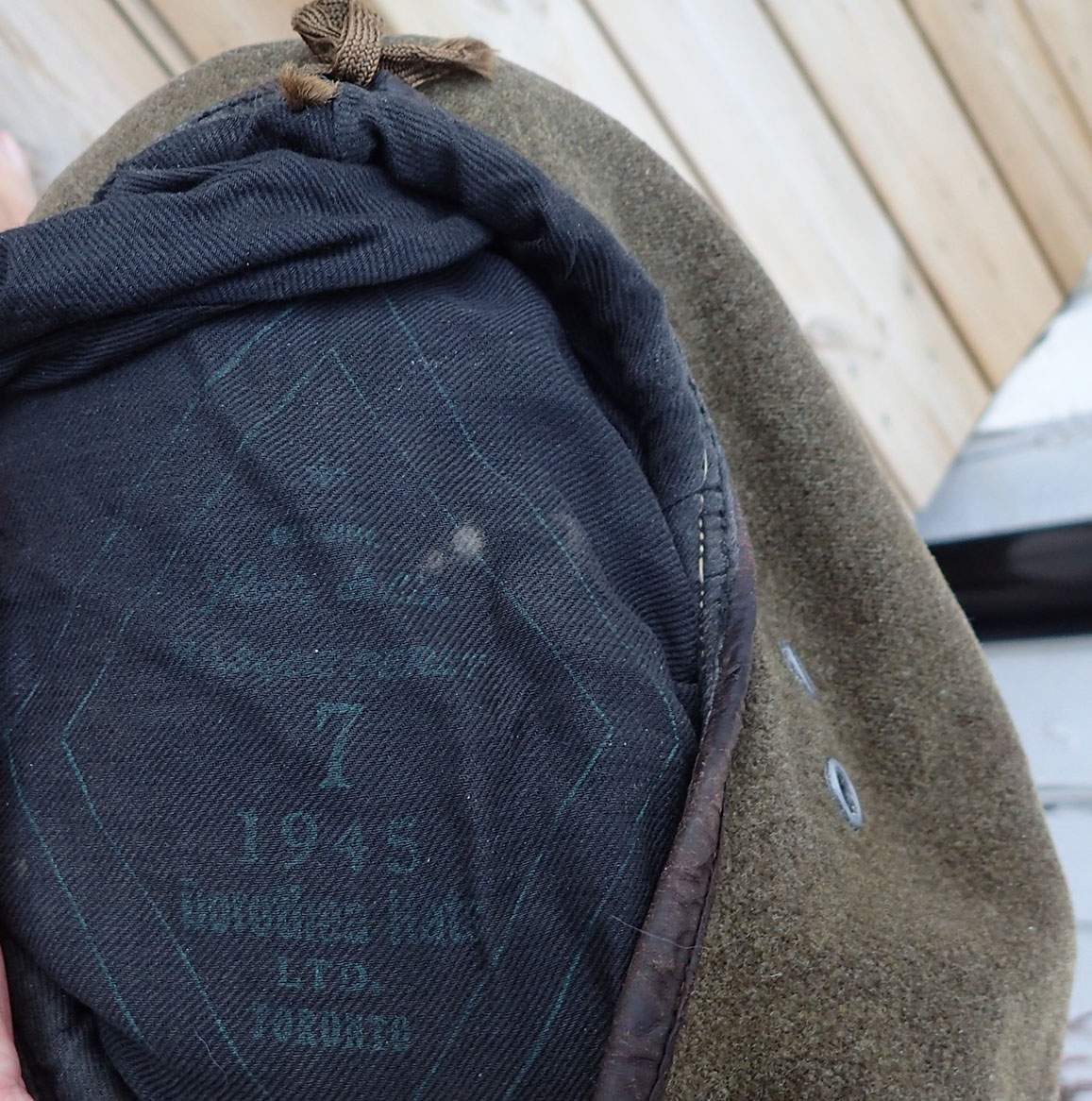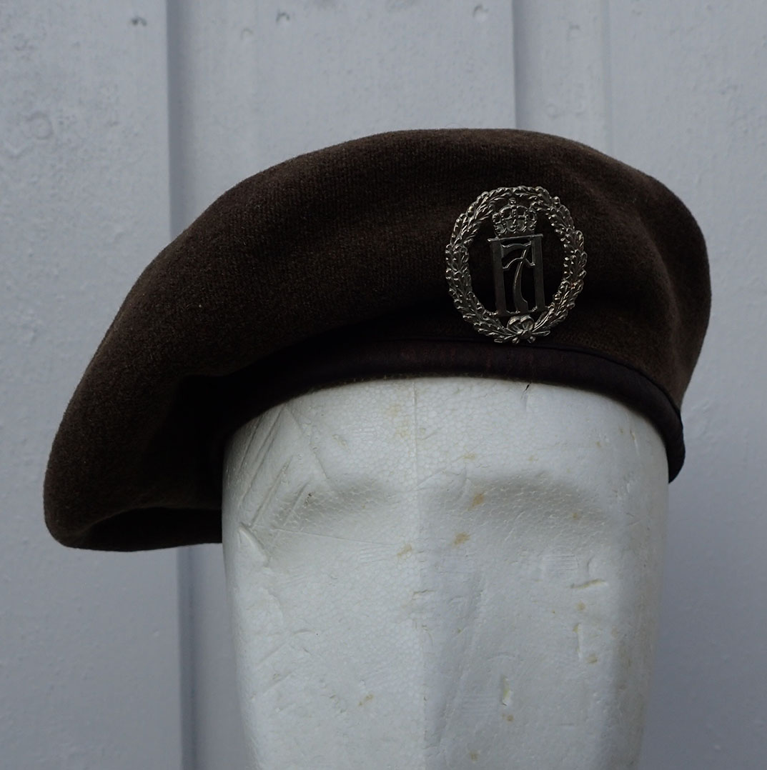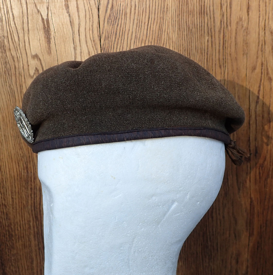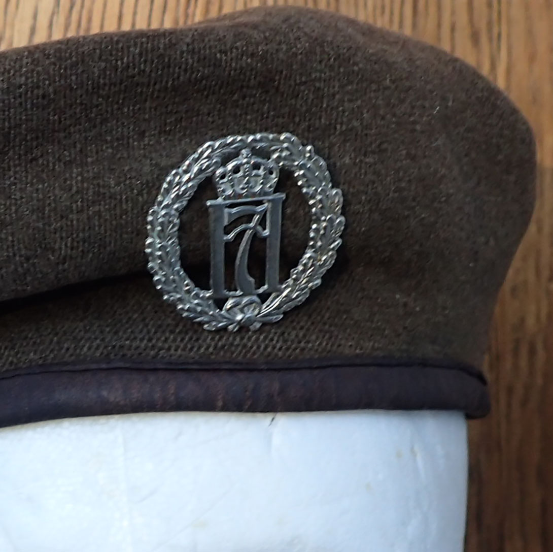 Beret. Sydd i brun uniformsstoff. I fronten H7 merke i kobbernikkel, som er festet med en lang splint i messing på baksiden. Innvendig med sort bomullsfòr. Stemplet med produsenten Dorothines Hats LTD. TORONTO. og størrelsen 7 også stemplet med kråkefot + årstall 1945.