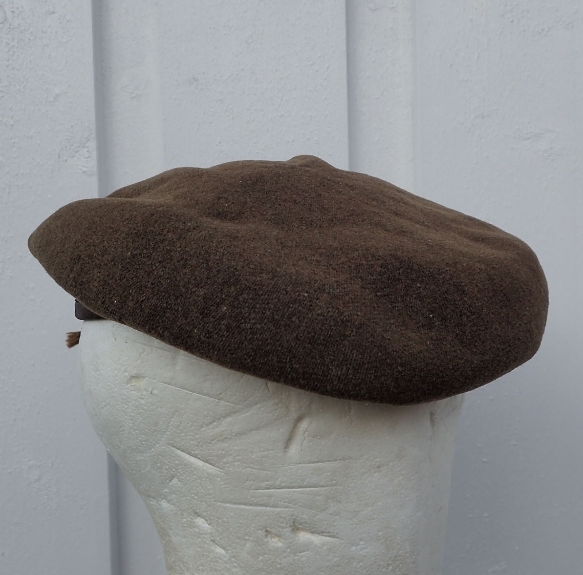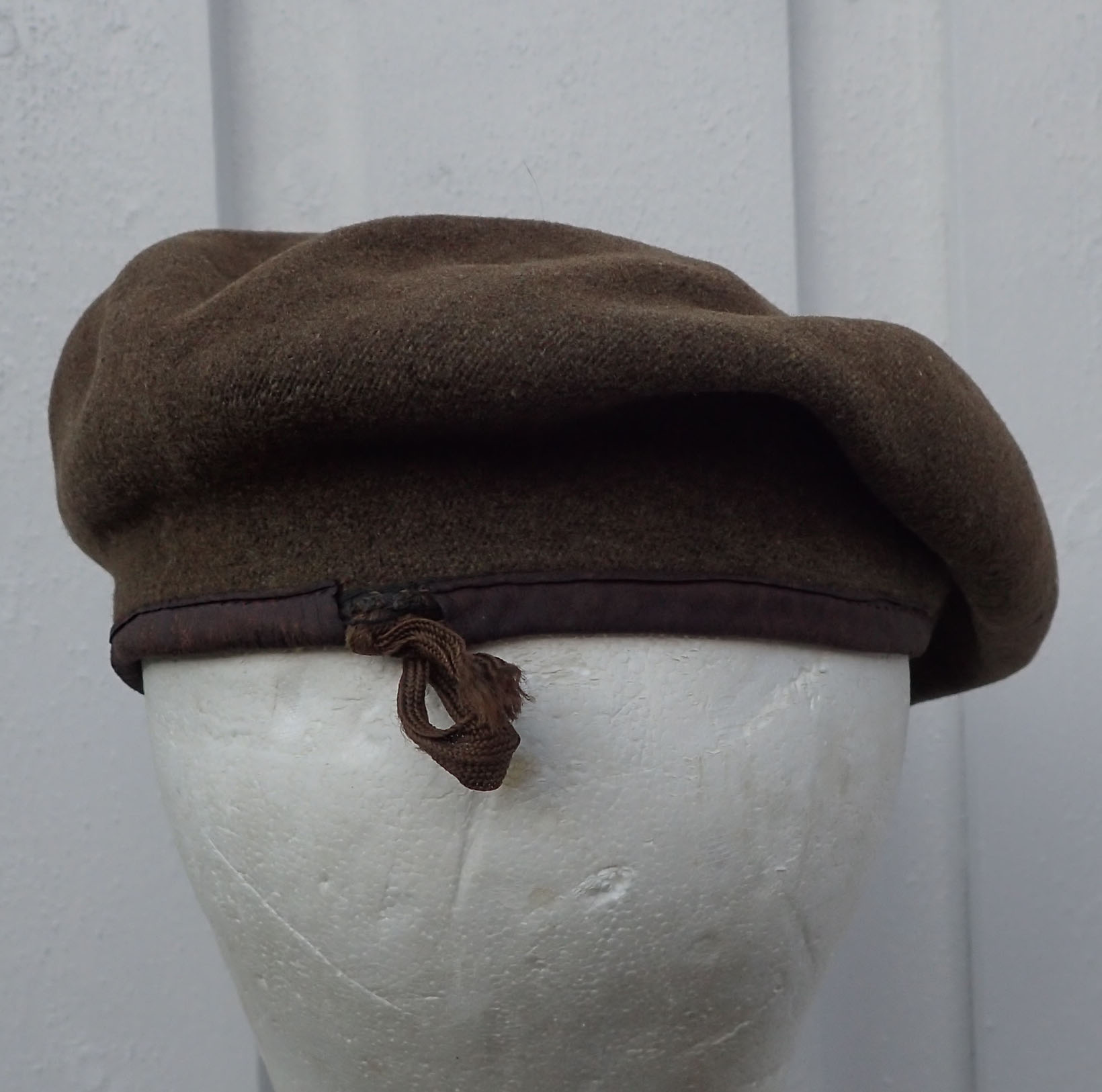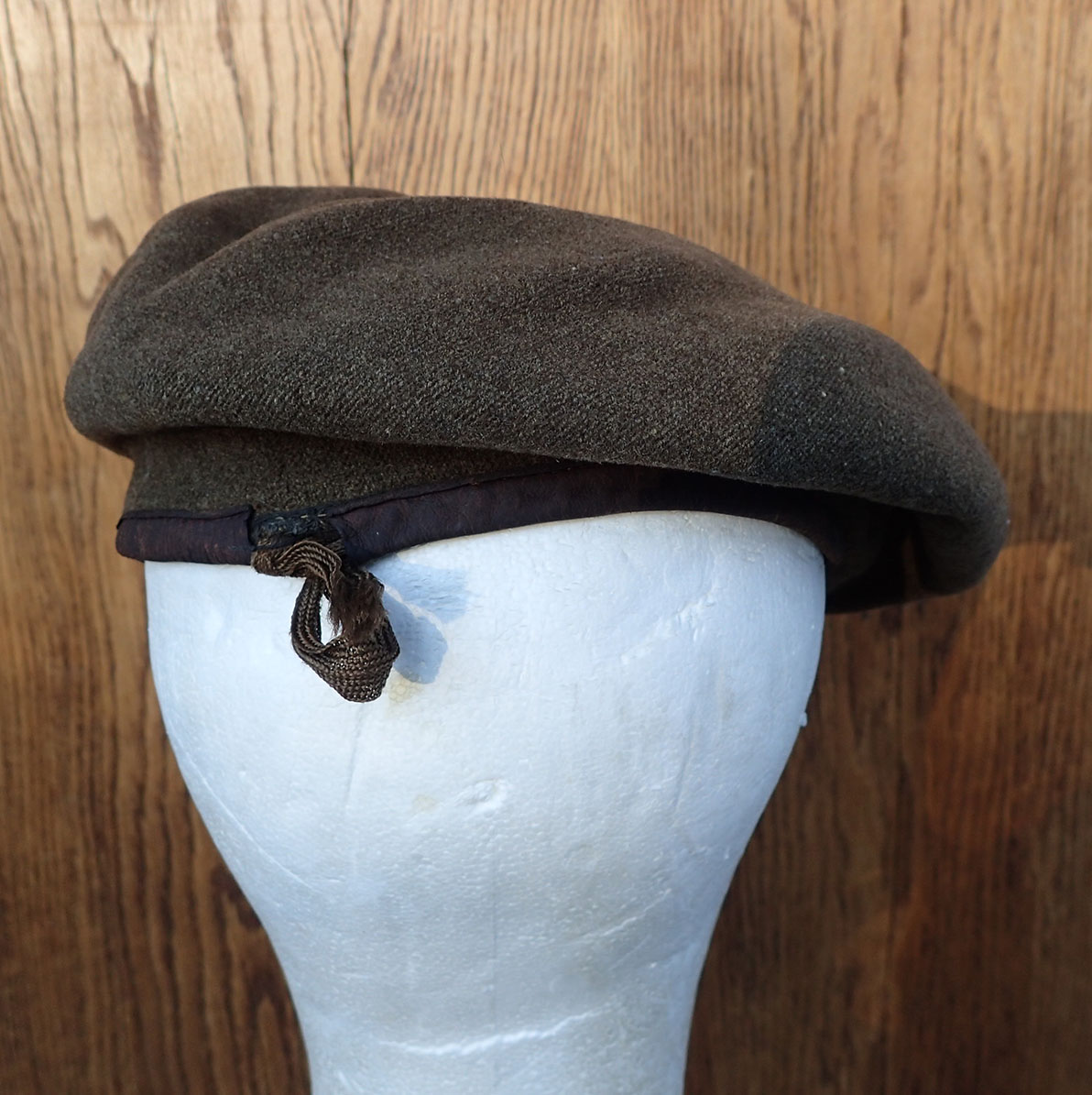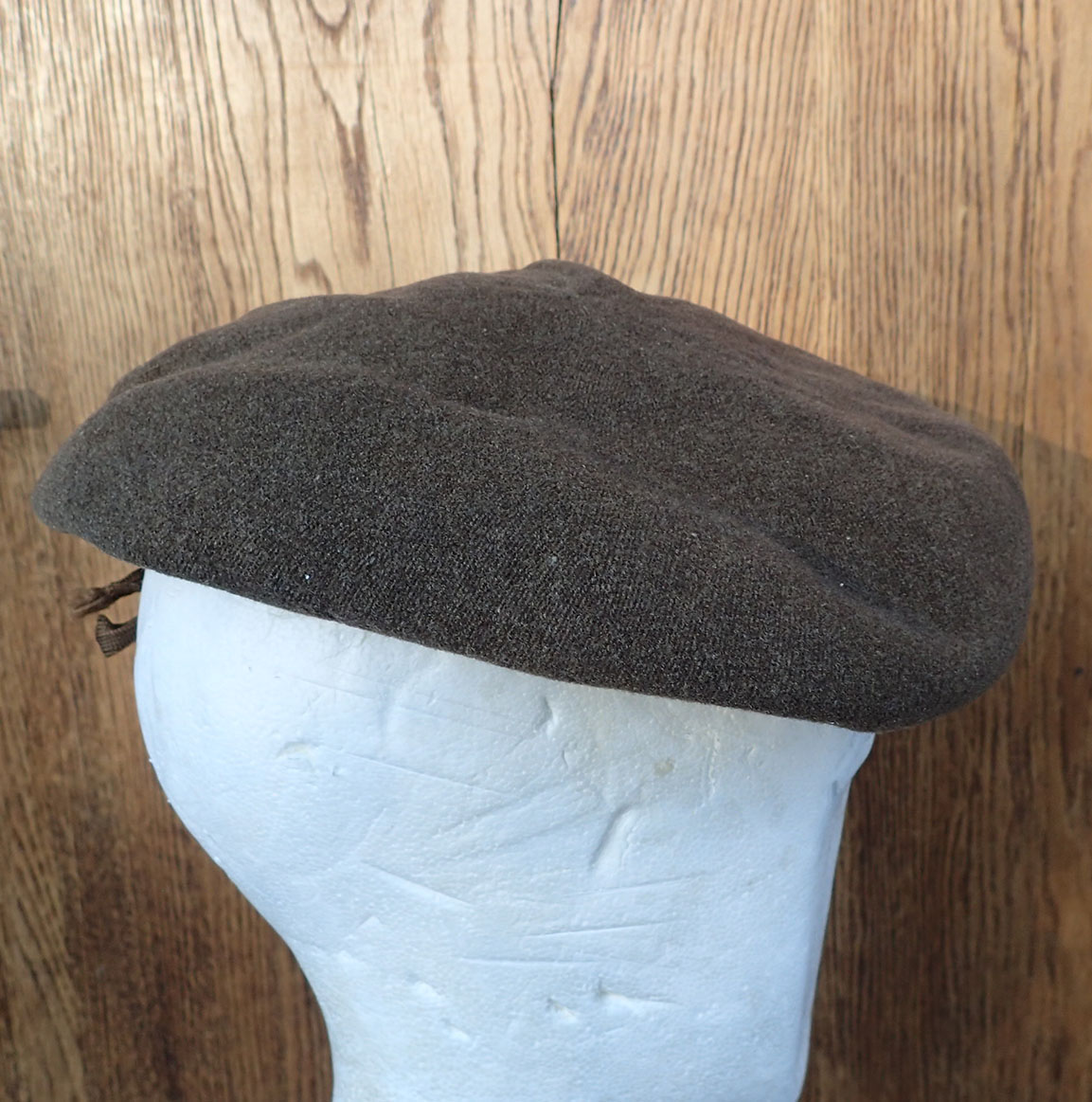 Beret. Sydd i brun uniformsstoff. I fronten H7 merke i kobbernikkel, som er festet med en lang splint i messing på baksiden. Innvendig med sort bomullsfòr. Stemplet med produsenten Dorothines Hats LTD. TORONTO. og størrelsen 7 også stemplet med kråkefot + årstall 1945.