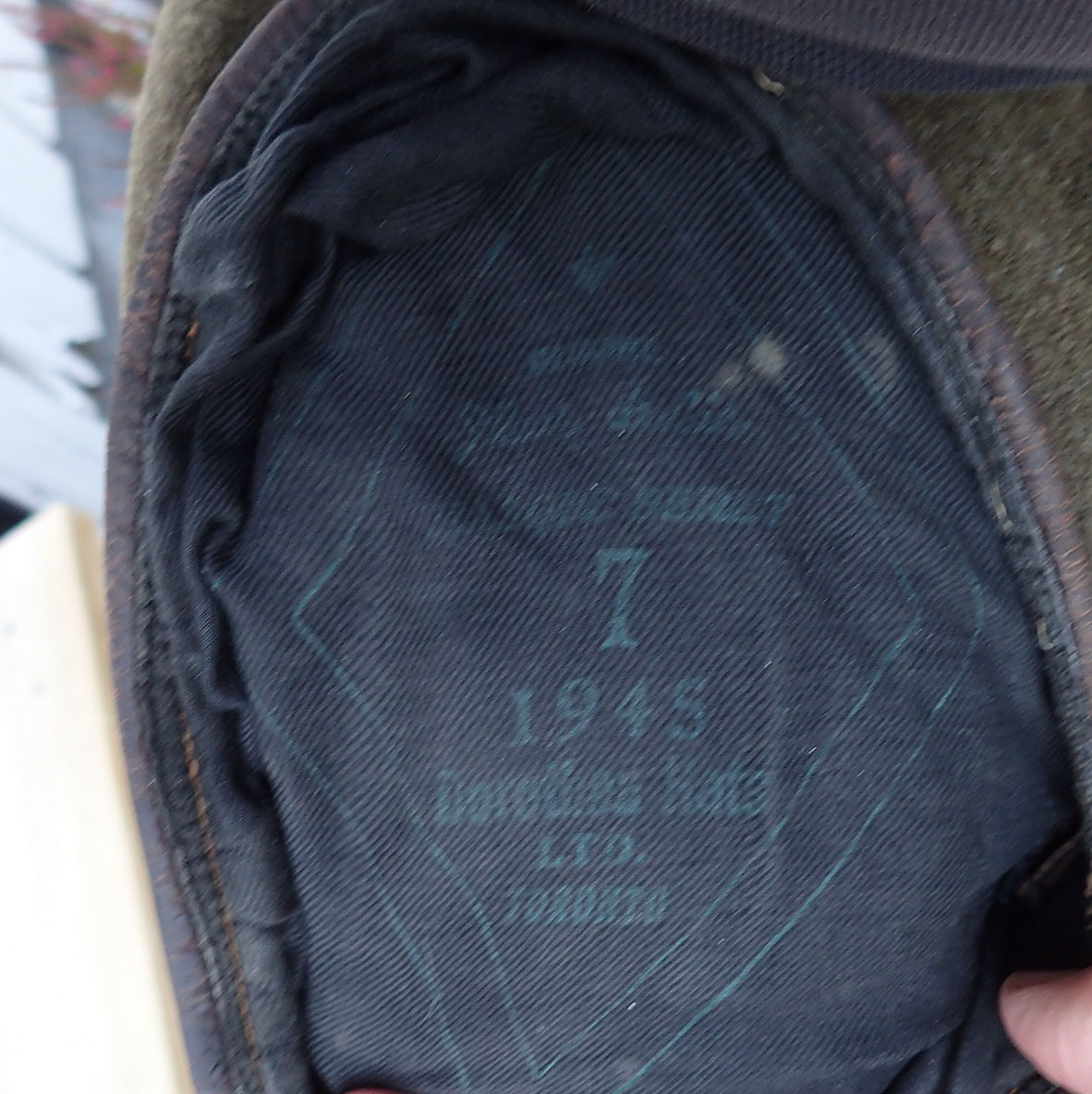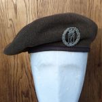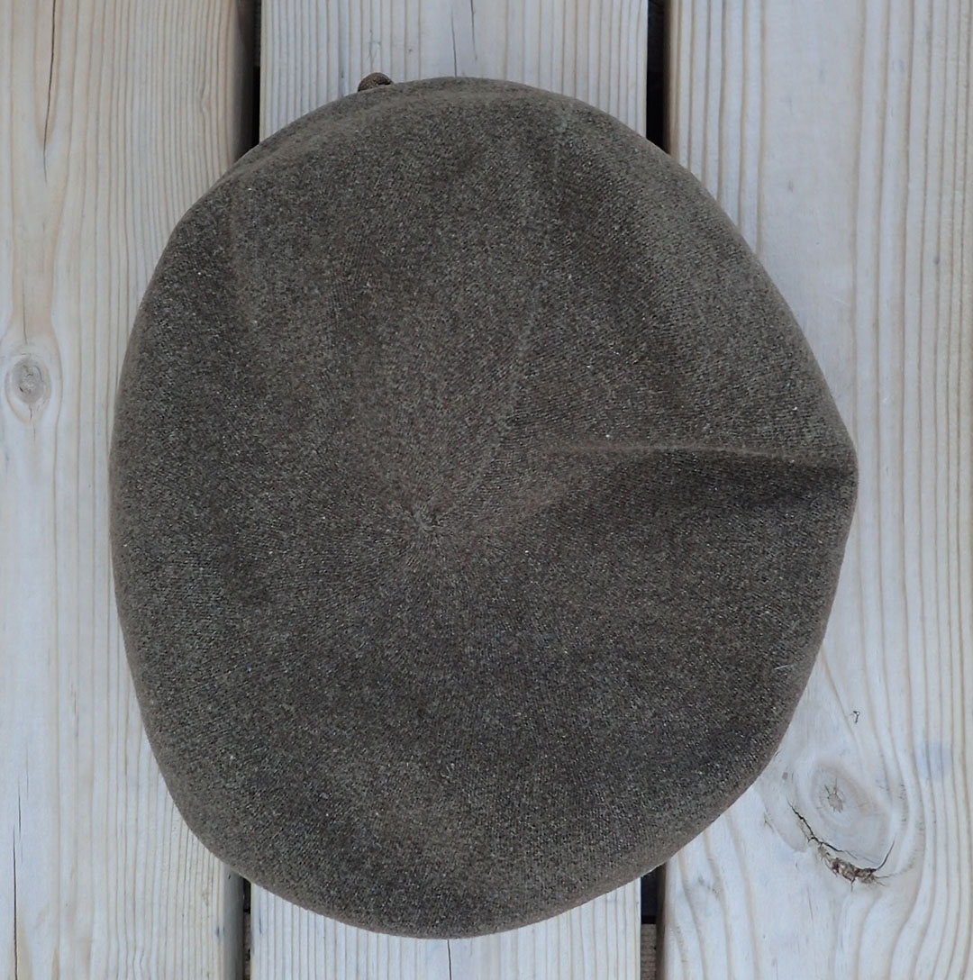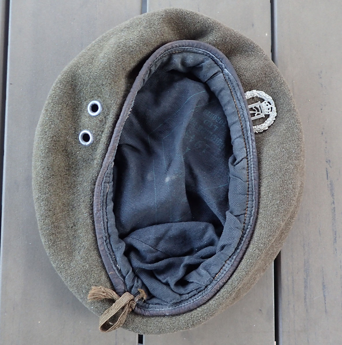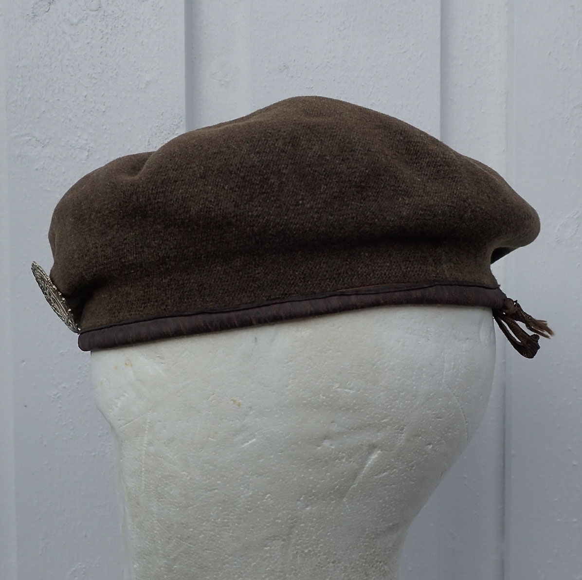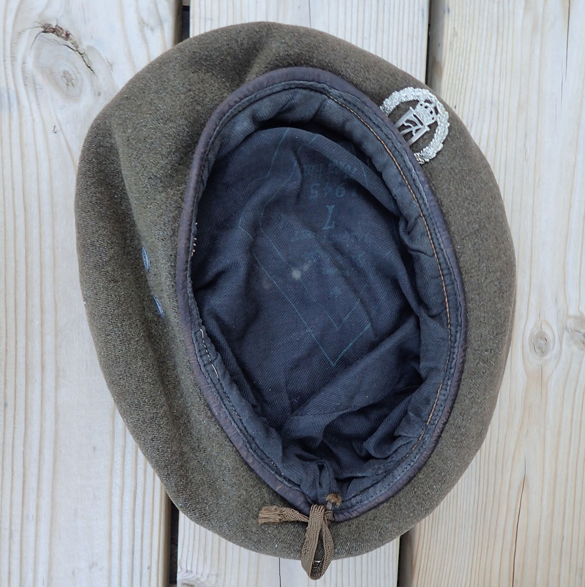Beret. Sydd i brun uniformsstoff. I fronten H7 merke i kobbernikkel, som er festet med en lang splint i messing på baksiden. Innvendig med sort bomullsfòr. Stemplet med produsenten Dorothines Hats LTD. TORONTO. og størrelsen 7 også stemplet med kråkefot + årstall 1945.