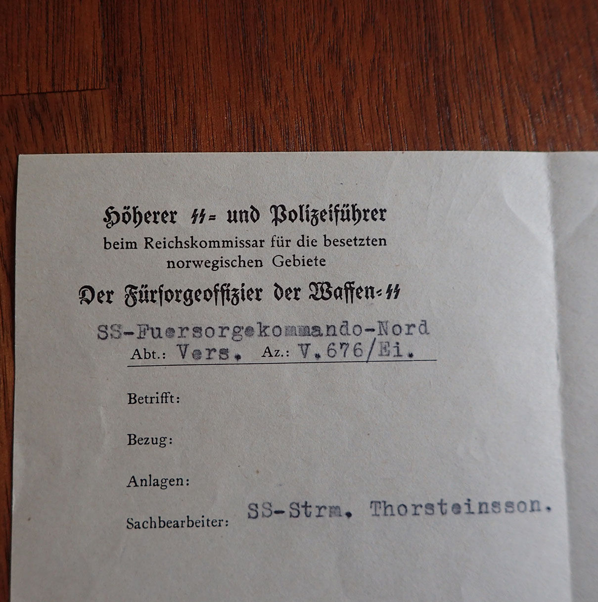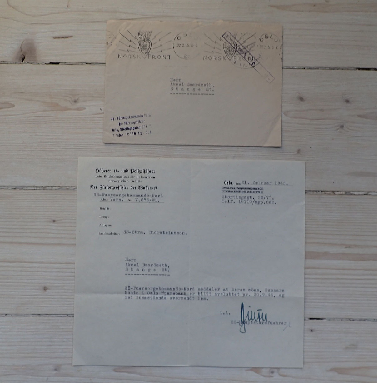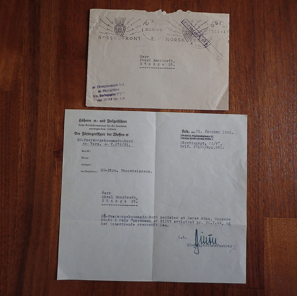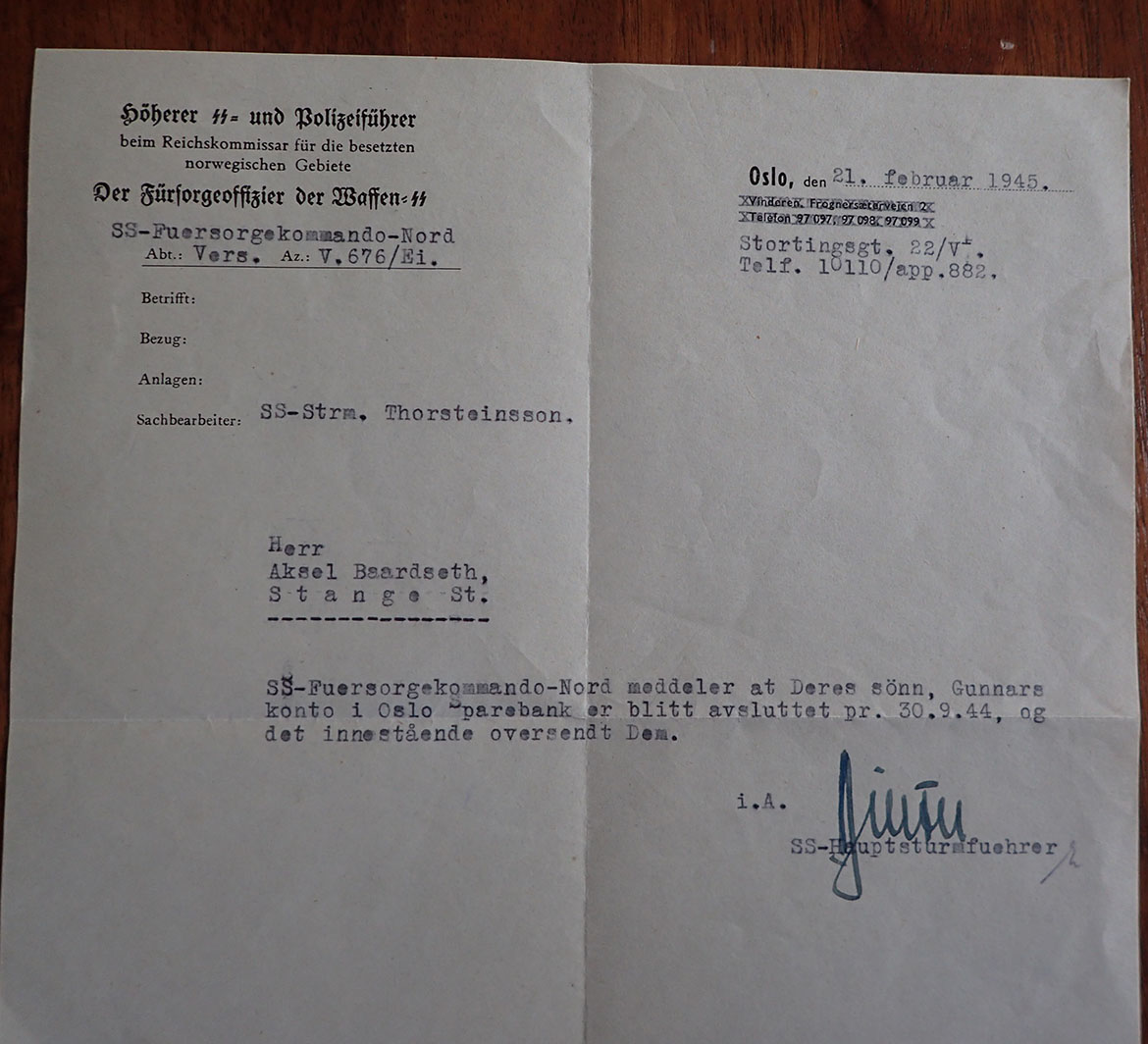 Brev til faren til Gunnar Baardseth. Fallen norsk fallskjermjeger i Straffebataljon 500. Brevet er sendt til Aksel Baardseth. Stange. Faren til Gunnar og Knut Baardseth. (Knut var også frontkjemper og overlevde krigen). Maskinskrevet: Der SS-Fuersorgekommando-Nord meddeler at Deres sönn, Gunnars konto i Oslo Sparebank er blitt avsluttet pr. 30.9.44, og det innestående oversendt Dem. Signert med blå blekk av en SS-Hauptsturmführer. Brevet er datert 21. februar 1945.