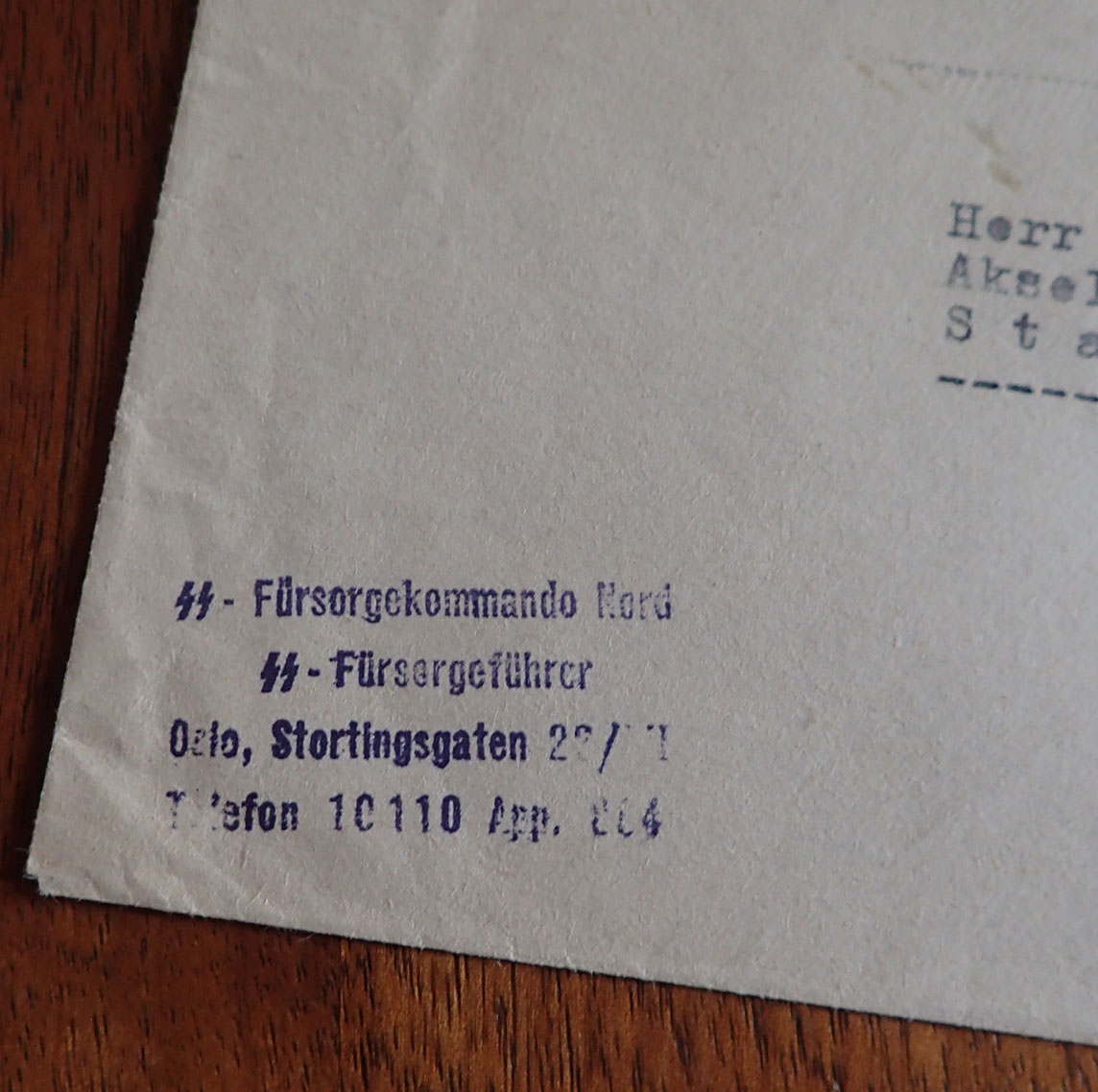 Konvolutten er stemplet med NORSK FRONT og nede til venstre SS-Fürsorgekommando Nord. SS-Fürsorgeführer. Oslo.