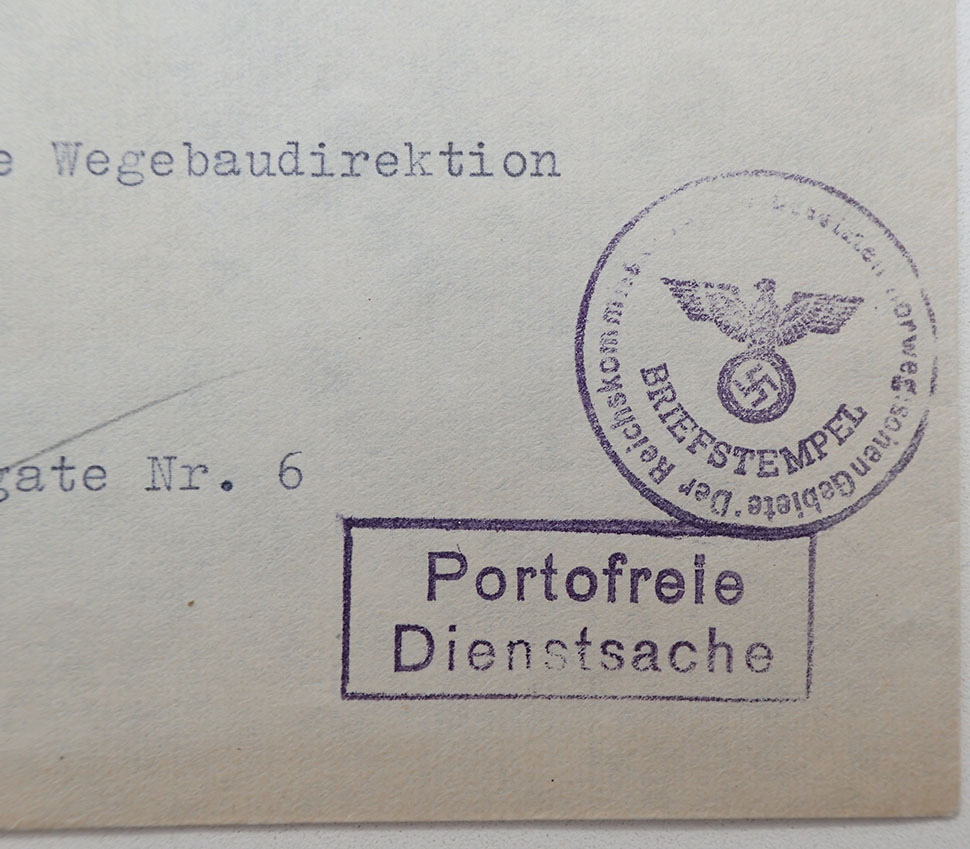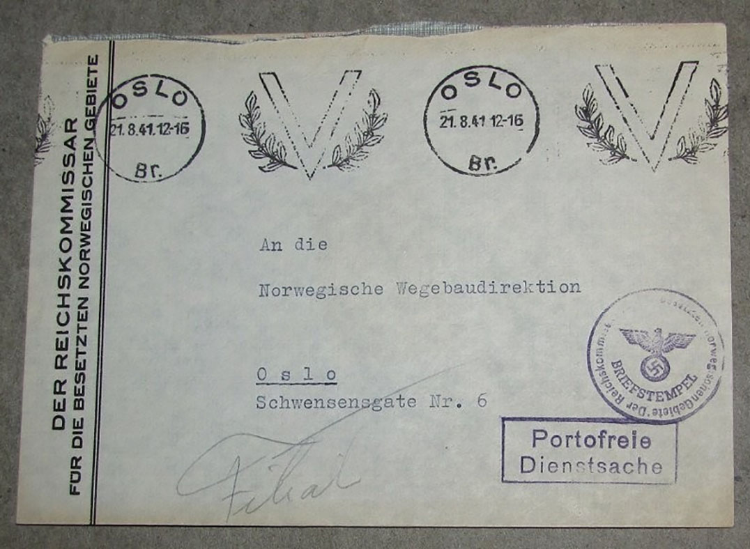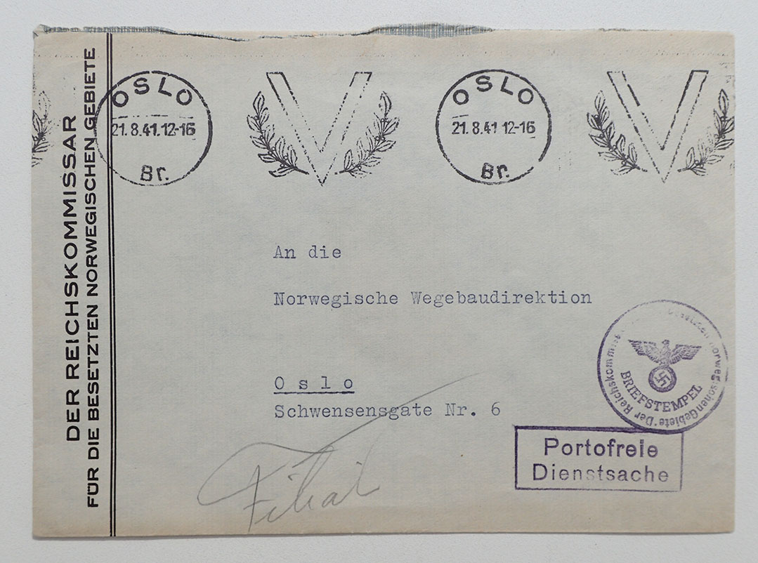 DER REICHSKOMMISSAR FÜR DIE BESETZTEN NORWEGISCHEN GEBIETE konvolutt. Fra Reichskommissariatet i Oslo til Norwegische Wegbaudirektion, Oslo. Fine stempler.