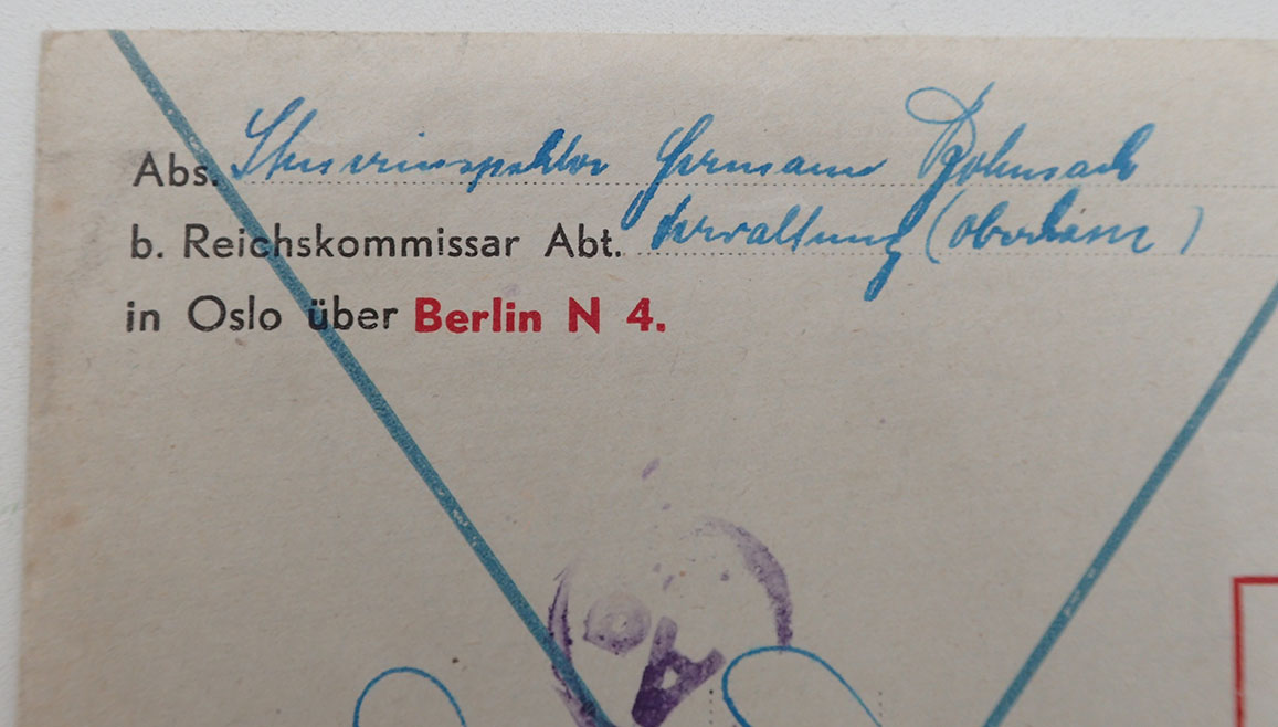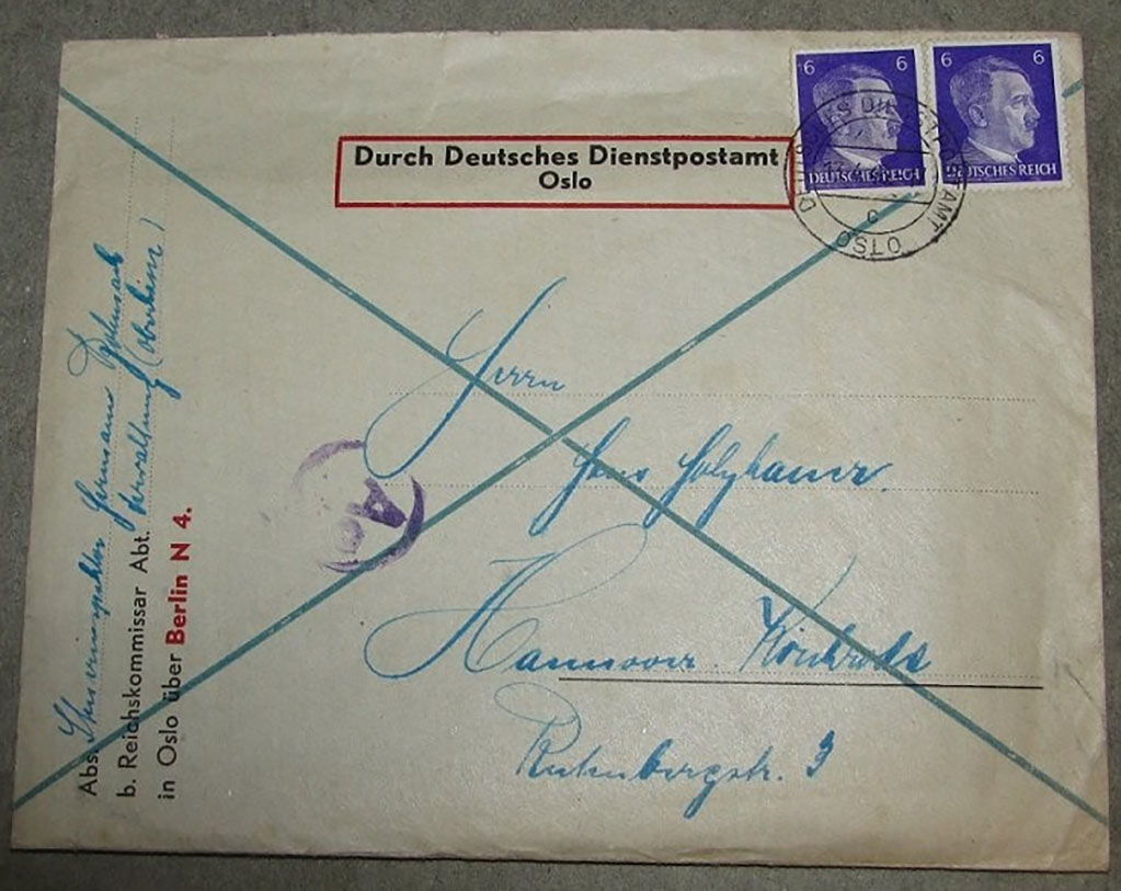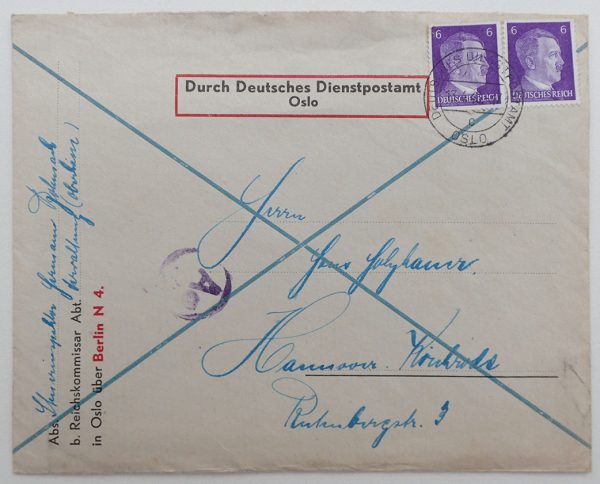 DER REICHSKOMMISSAR FÜR DIE BESETZTEN NORWEGISCHEN GEBIETE konvolutt. Fra Reichskommissar Abteilung.. håndskrevet über Berlin N 4. Fine stempler. Med 2 stk. 6 Pfennig Hitler frimerker.