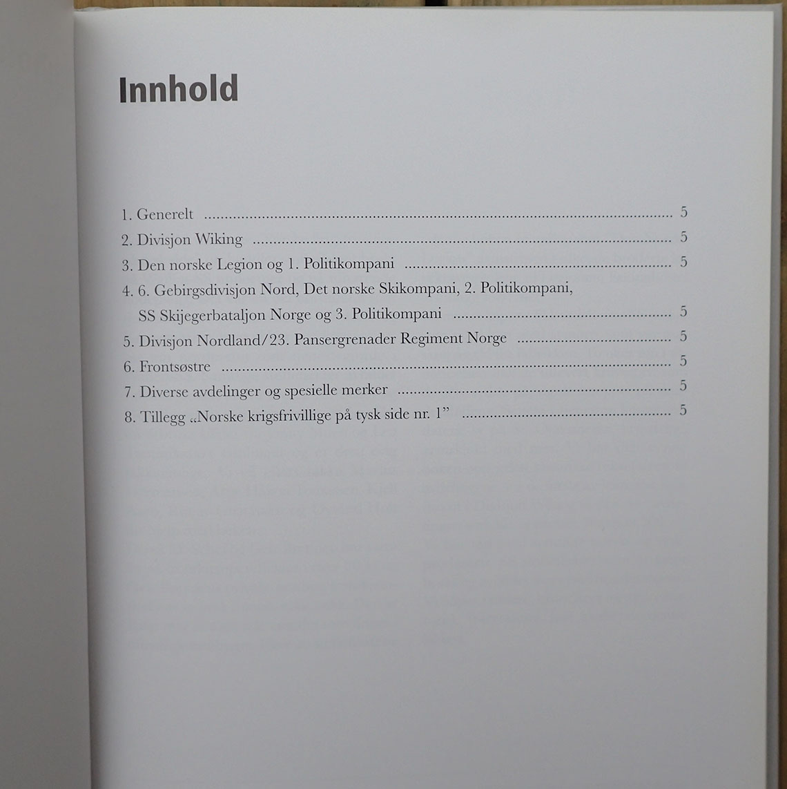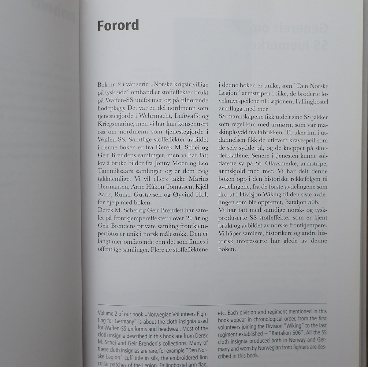 Derek M. Schei/Geir Brenden. Norske krigsfrivillige på tysk side. Nr. 2STOFFEFFEKTER. Tønsberg 2009. 100 sider. Med STIVE permer med flat rygg og med glatte blanke sider. Boken tar for seg alle kjente norsk-og tyskproduserte stoffeffekter båret på SS uniformen. Boken inneholder flere hundre bilder hvorav samtlige SS stoffeffekter brukt av nordmenn er avbildet. Samtlige stoffeffekter avbildet i boken har tilhørt norske frontkjempere. Boken inneholder en mengde originale fotos fra Geir Brendens arkiv, som aldri har vært publisert tidligere. I boken følger det en kort beskrivelse og gjennomgang av alle avdelinger nordmenn tjenestegjorde i og hvilke stoffeffekter de brukte.