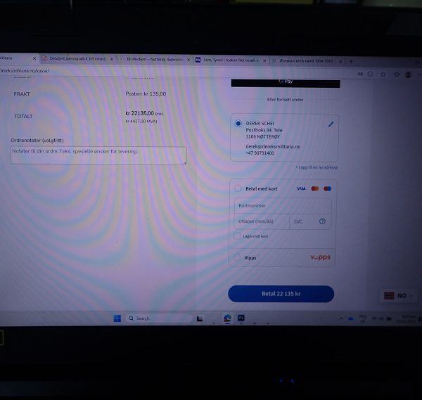 Dereks Militaria har nå kun kort og Vipps betaling. Hvis bankoverførsel, må jeg få beskjed om det via e-post/sms.