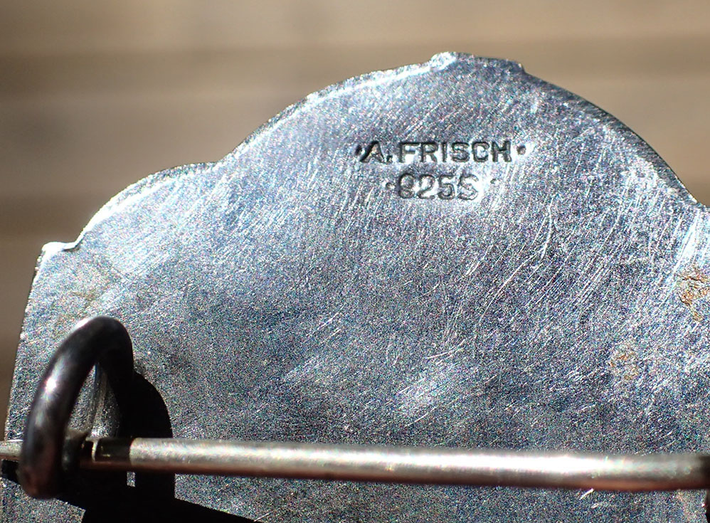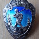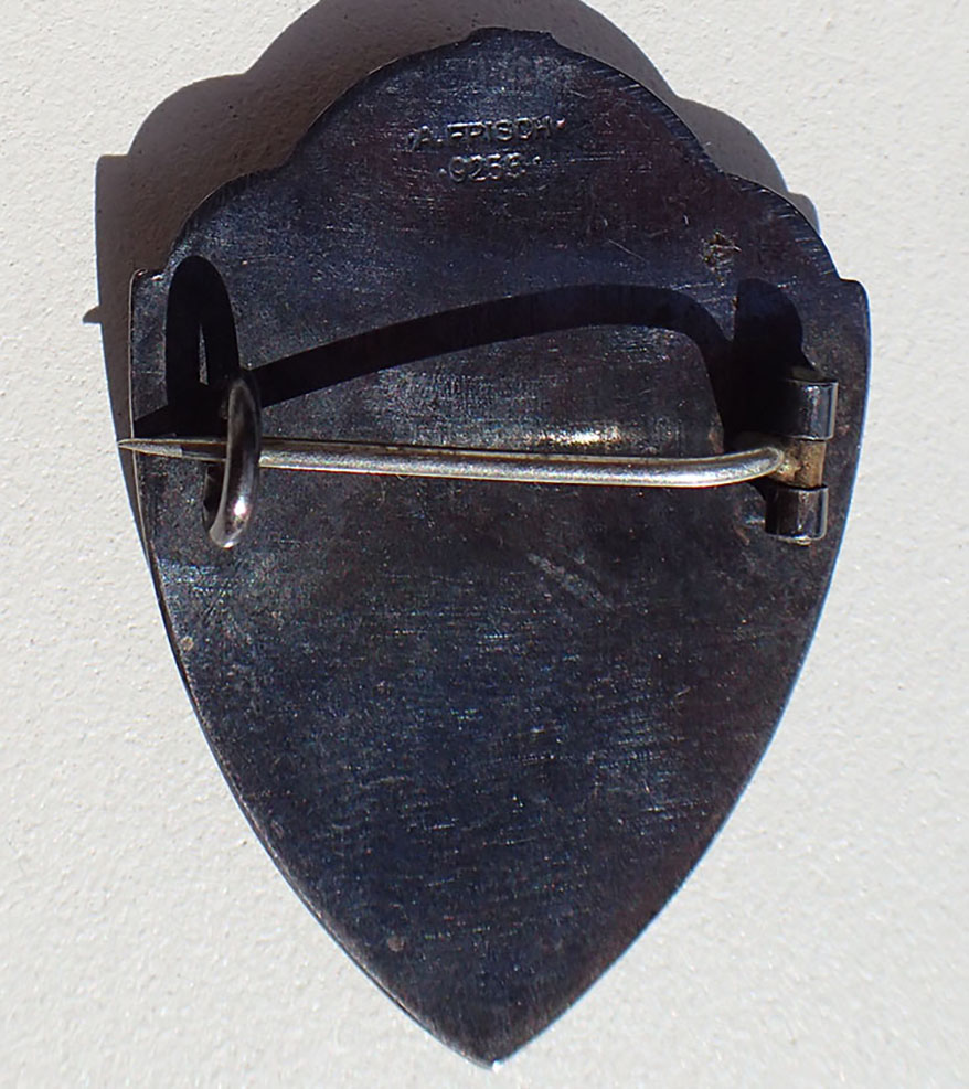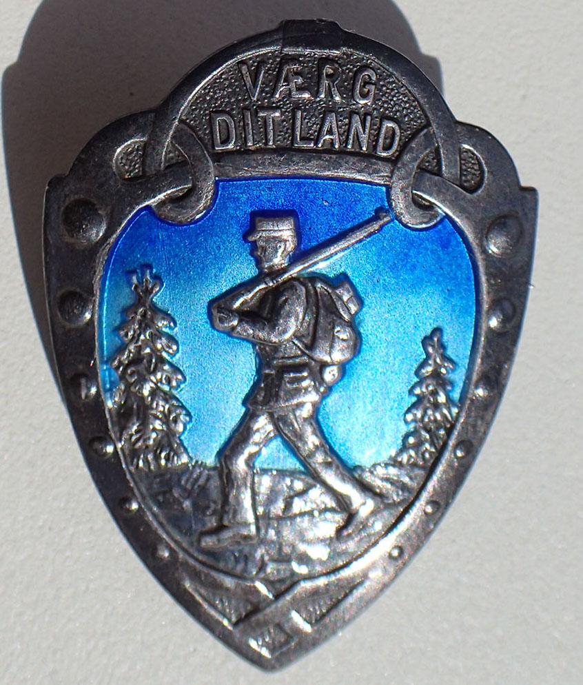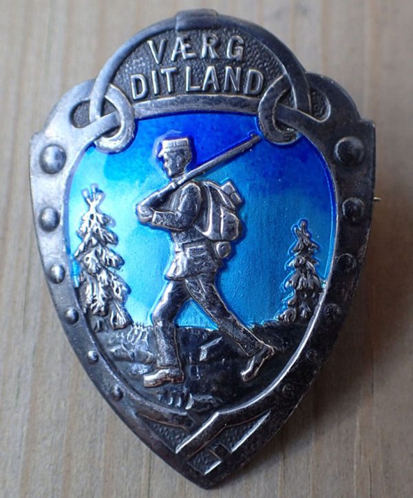 Det militære marsjmerke i sølv. I sølv med blå emalje foran. Strøken i emaljen. Bak stemplet A.FRISCH. 925S. Med nål og pene nålfester.