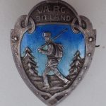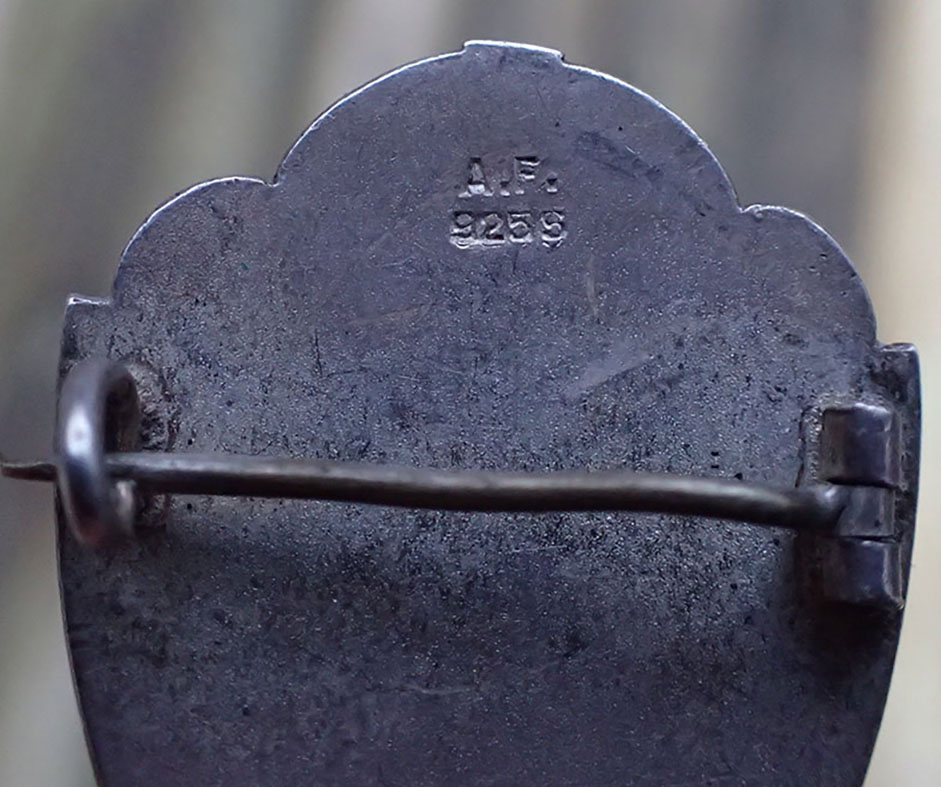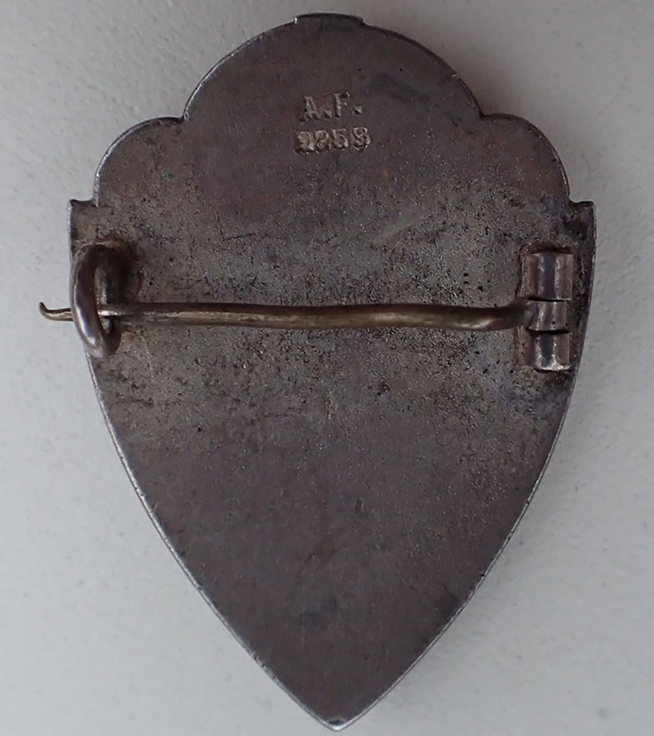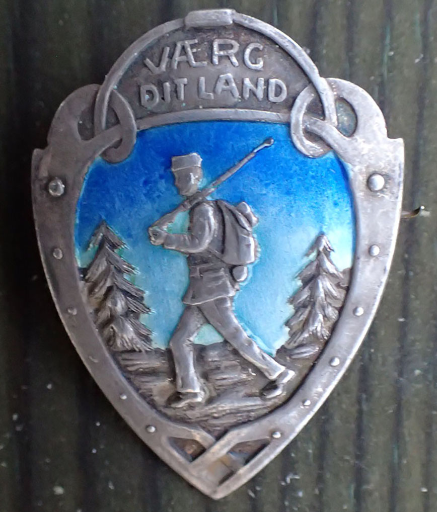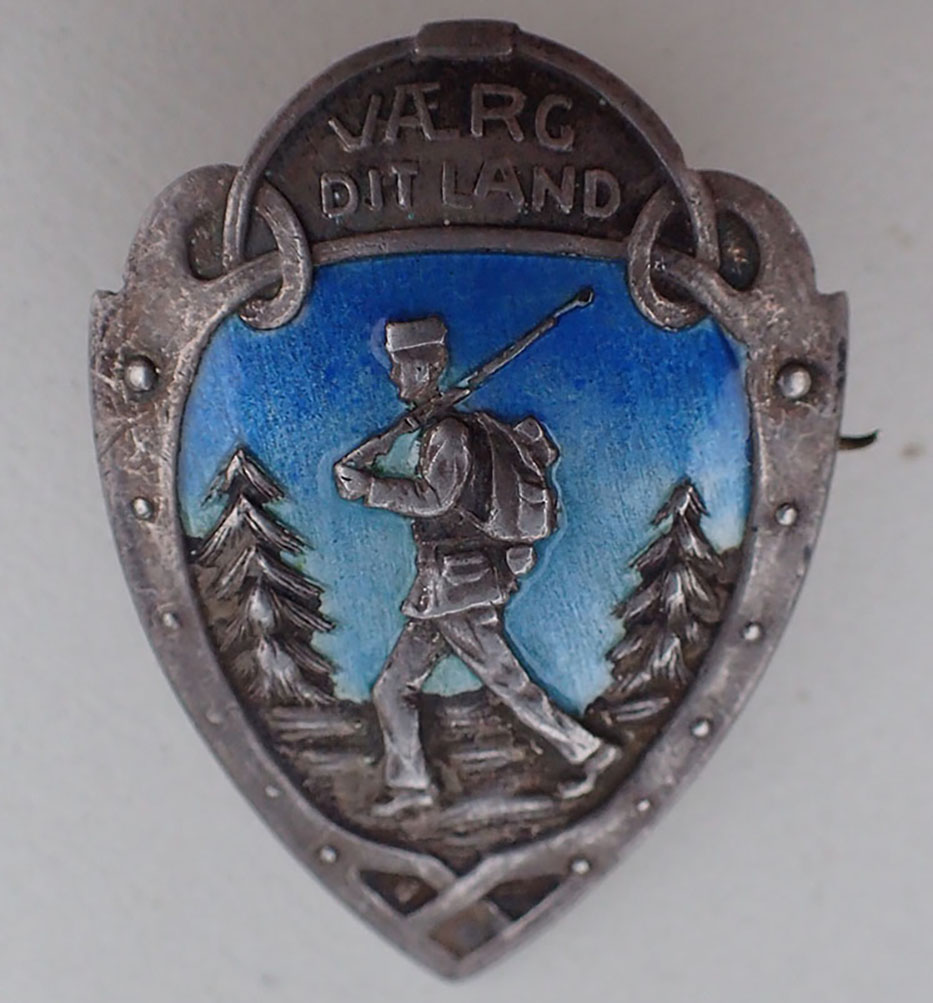 Det militære marsjmerke i sølv. I sølv med blå emalje foran. Strøken i emaljen. Bak stemplet A.F. 925S. Med nål og pene nålfester.