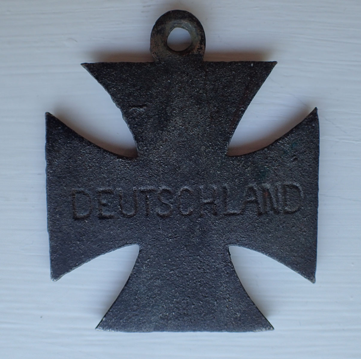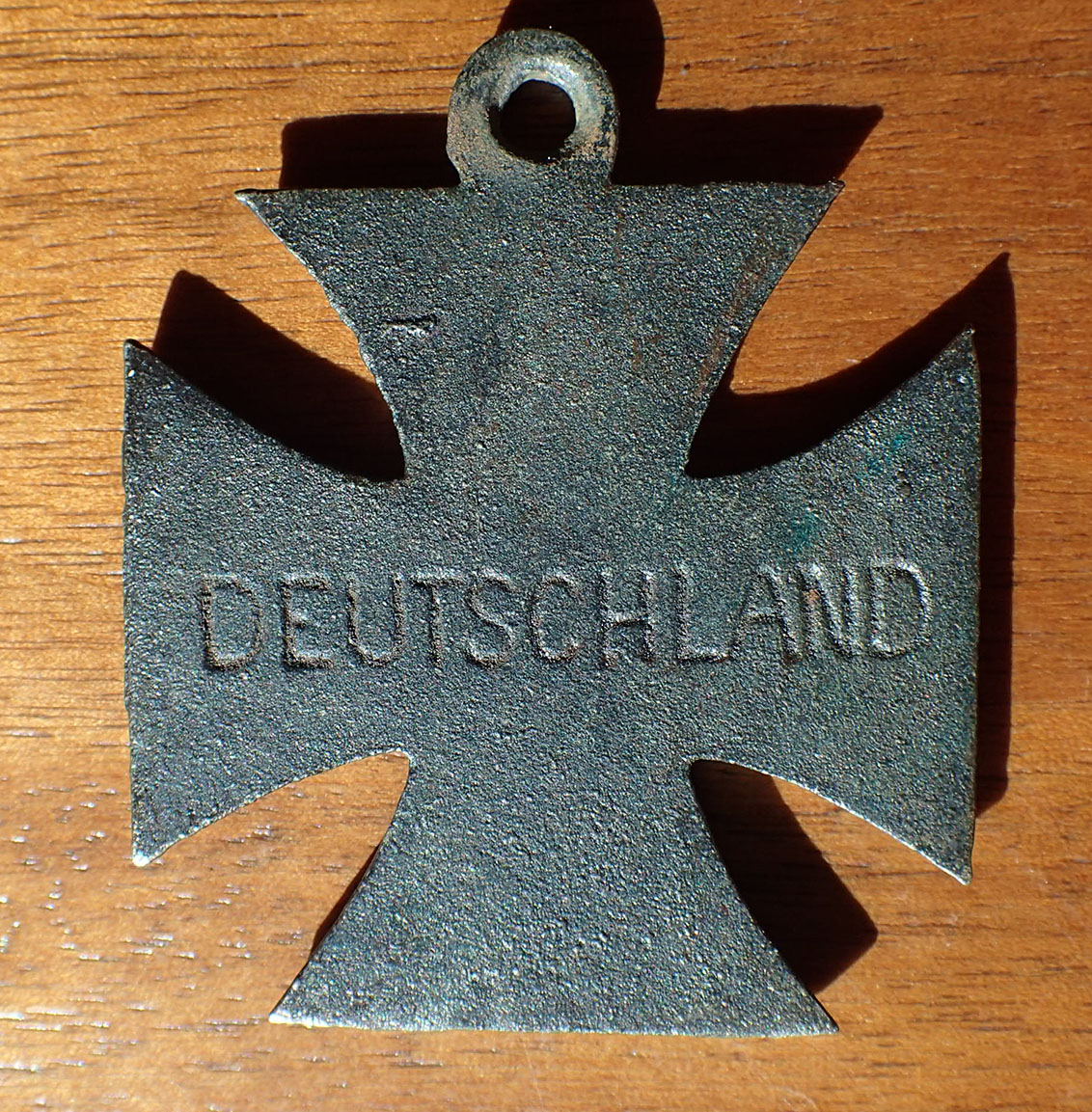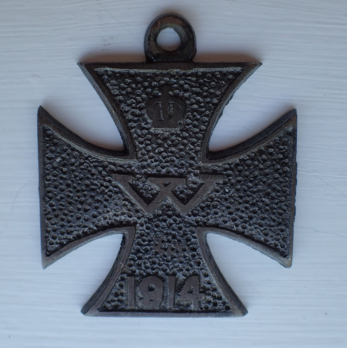 Crudely cast in iron in the form of a German Iron Cross, with a small suspension ring at the tip of the upper vertical arm. obverse design: at the centre of the cross an embossed initial ‘W’, above which is a small Latin cross. At the tips of arms, names of cities despoiled by the Germans during their 1914 Western Offensive. Obverse: ‘DINANT’ (upper vertical arm) & ‘GHENT’ (right horizontal arm) & ‘1914’ (lower vertical arm) & ‘ANTWERP’ (left horizontal arm) reverse text: ‘LOUVAIN’ (upper vertical arm) & ‘AMIENS’ (malformed, right horizontal arm) & ‘1914’ (lower vertical arm) & ‘RHEIMS’ (left horizontal arm)