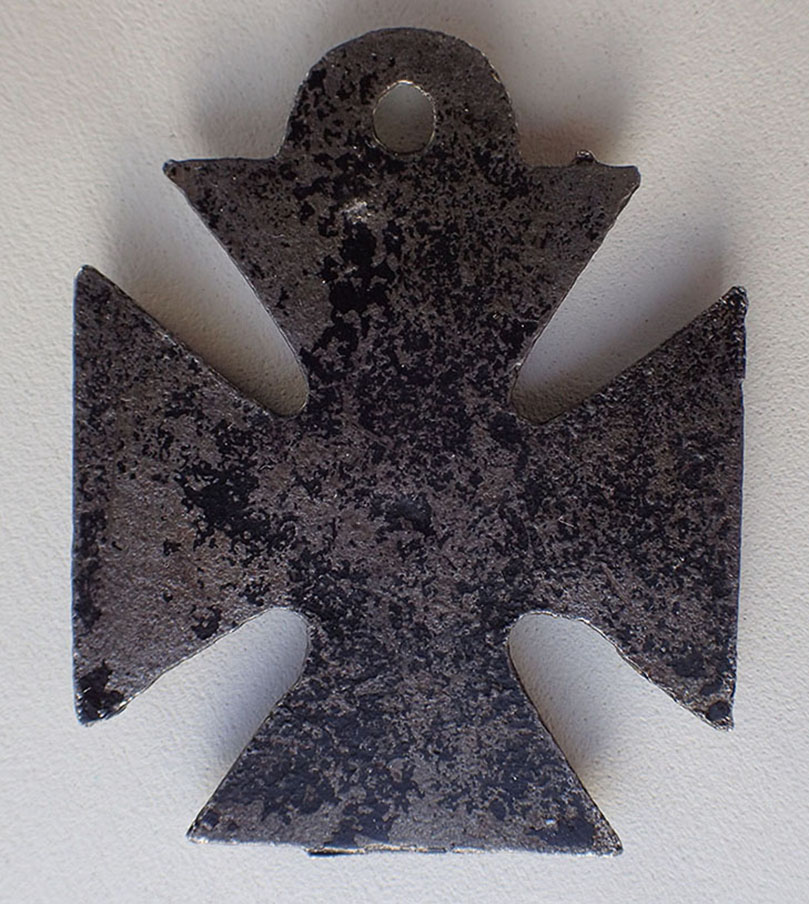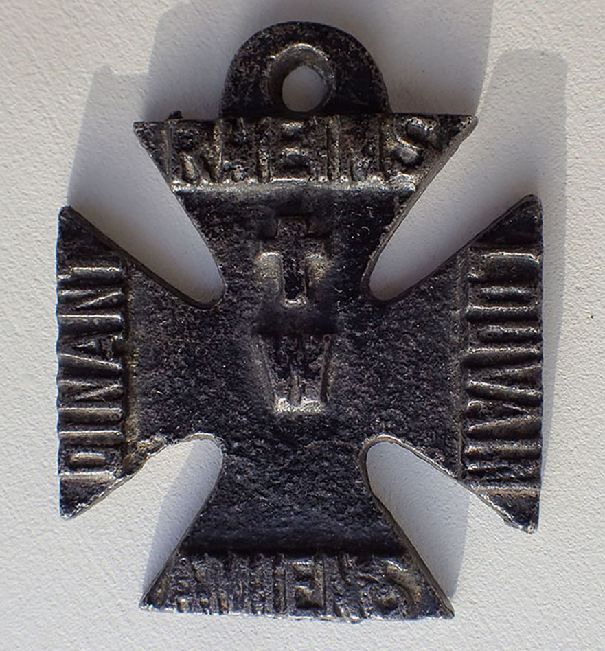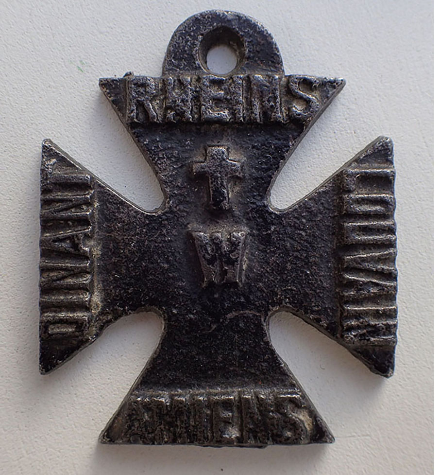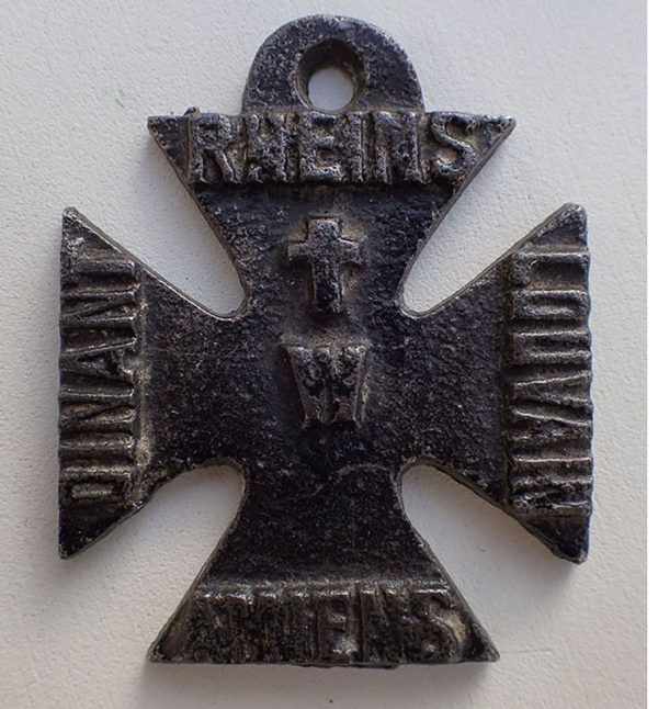 Crudely cast in iron in the form of a German Iron Cross, with a small suspension ring at the tip of the upper vertical arm. obverse design: at the centre of the cross an embossed initial ‘W’, above which is a small Latin cross. At the tips of arms, names of cities despoiled by the Germans during their 1914 Western Offensive. Obverse: ‘DINANT’ (upper vertical arm) & ‘GHENT’ (right horizontal arm) & ‘1914’ (lower vertical arm) & ‘ANTWERP’ (left horizontal arm) reverse text: ‘LOUVAIN’ (upper vertical arm) & ‘AMIENS’ (malformed, right horizontal arm) & ‘1914’ (lower vertical arm) & ‘RHEIMS’ (left horizontal arm)