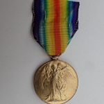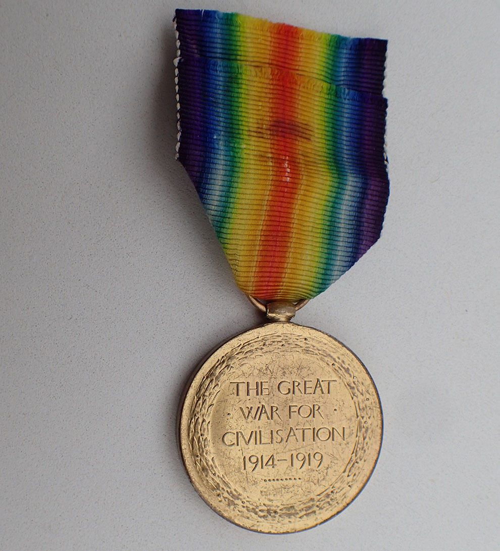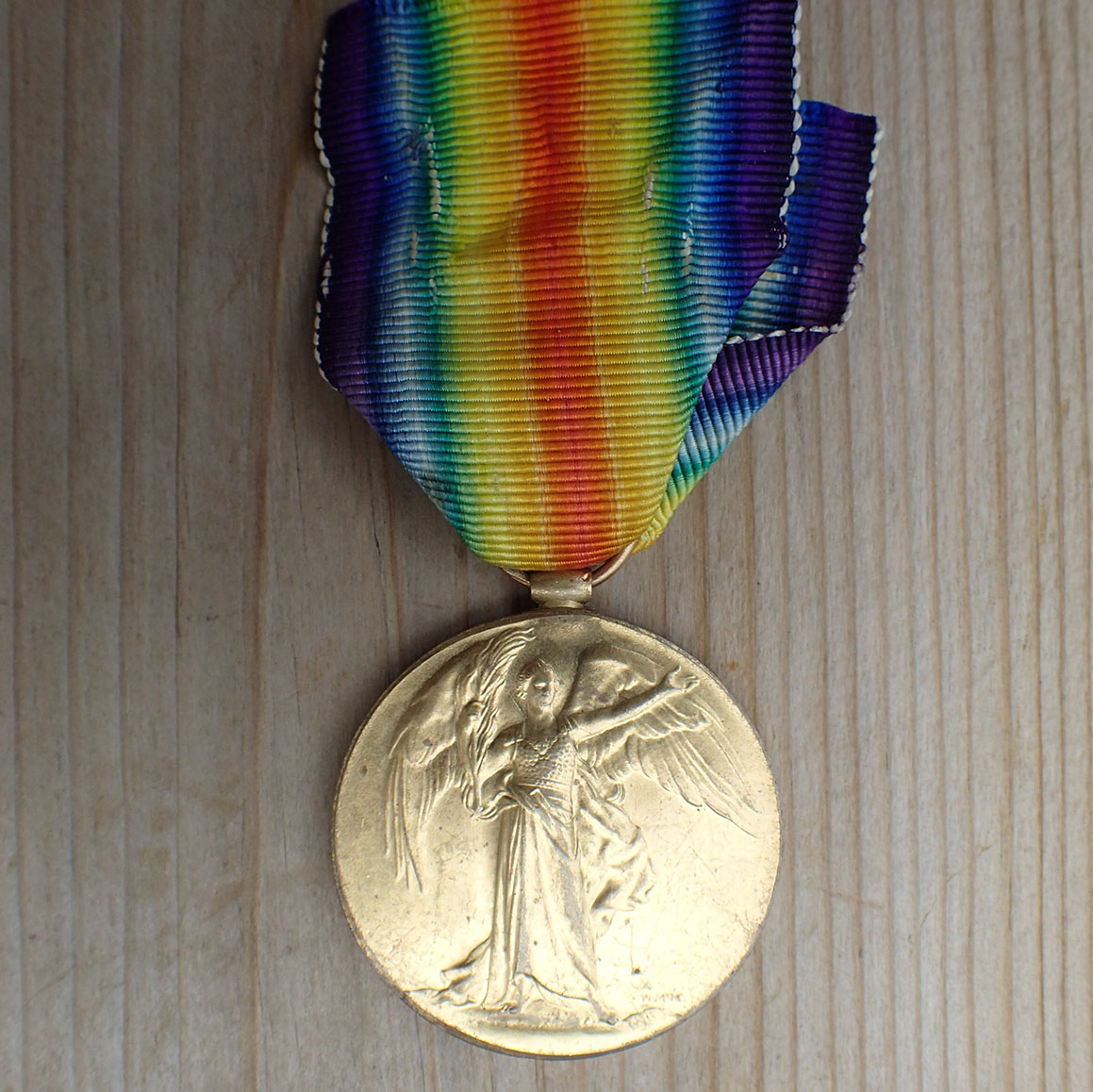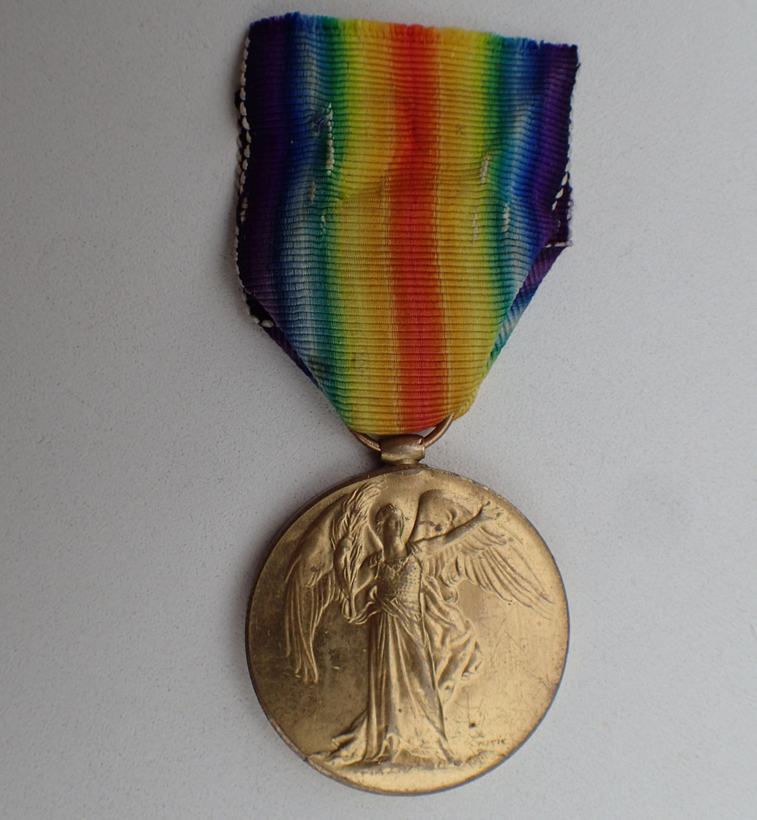 ENGLAND. The Victory Medal – The Great War for Civilization 1914-1919. Produsert i gullforgylt messing med det originale korte brukte båndet.