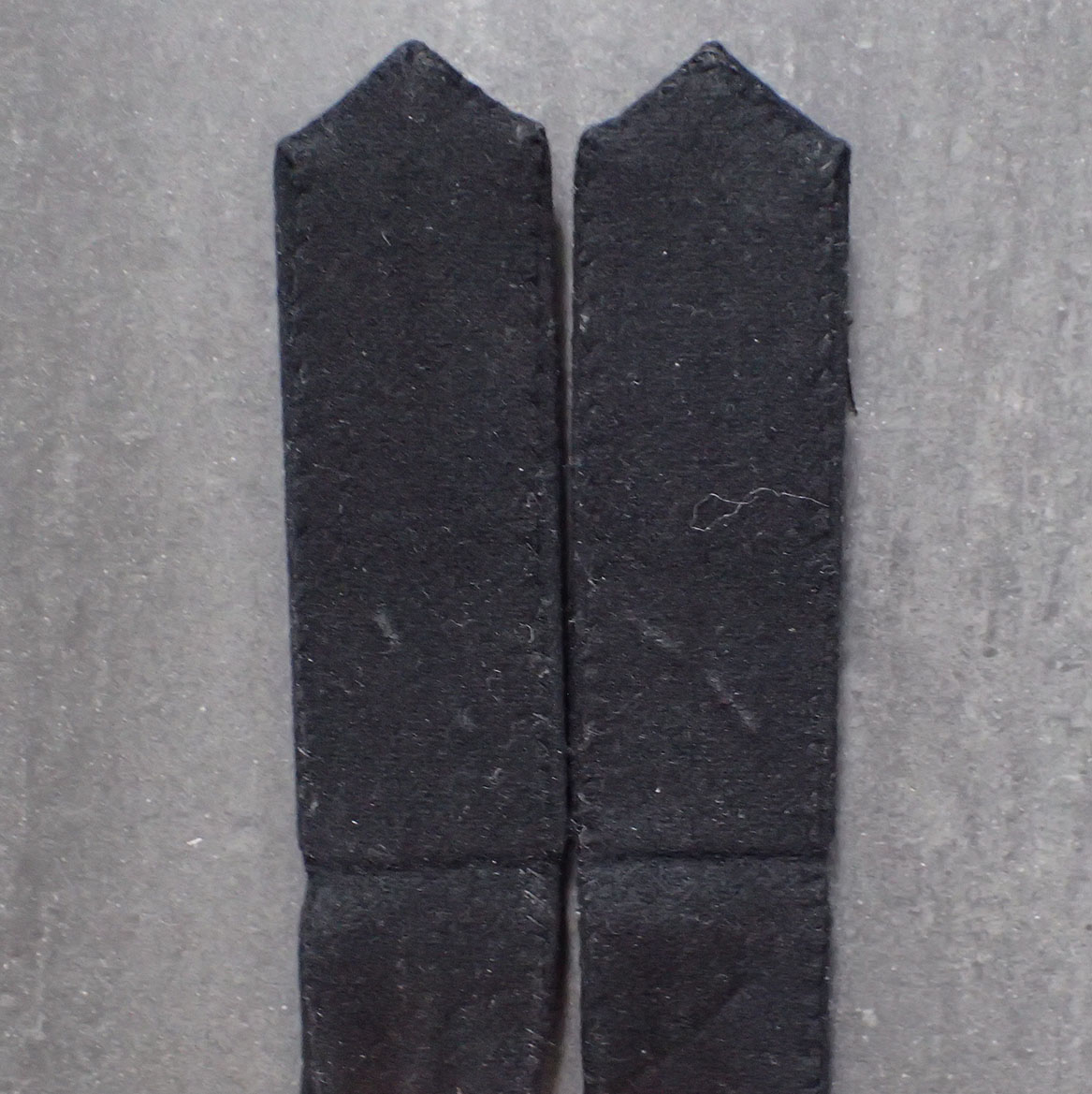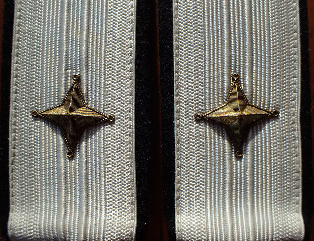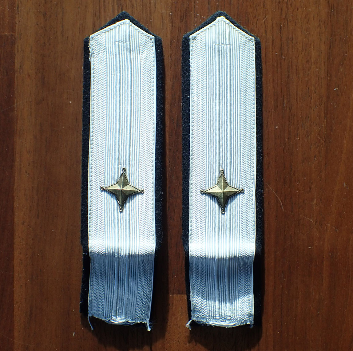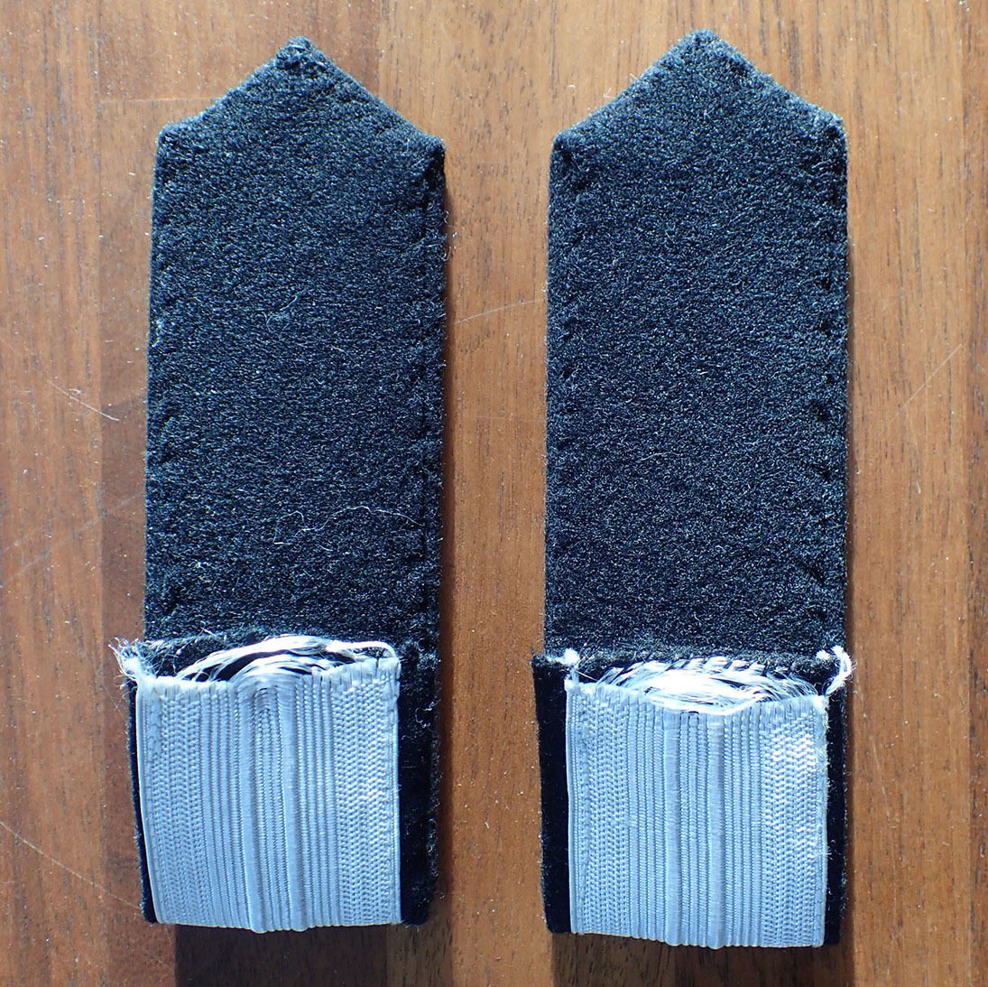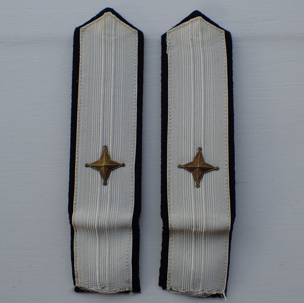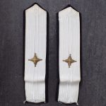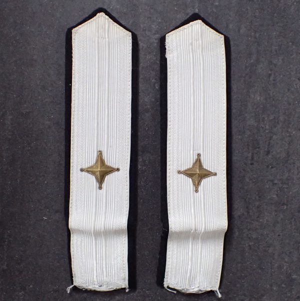 FØRERGARDEN Overløytnant skulderklaffer. Oppå med heldekkende hvit stripete stoff for offiserer. Med en stjerne i gull på hver, for Overløytnant. Under med sort stoff. Skulderklaffene er til å sy ned. Innvendig oppstivet med sink plater,