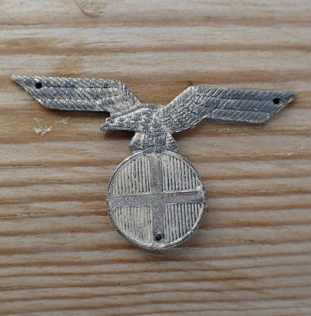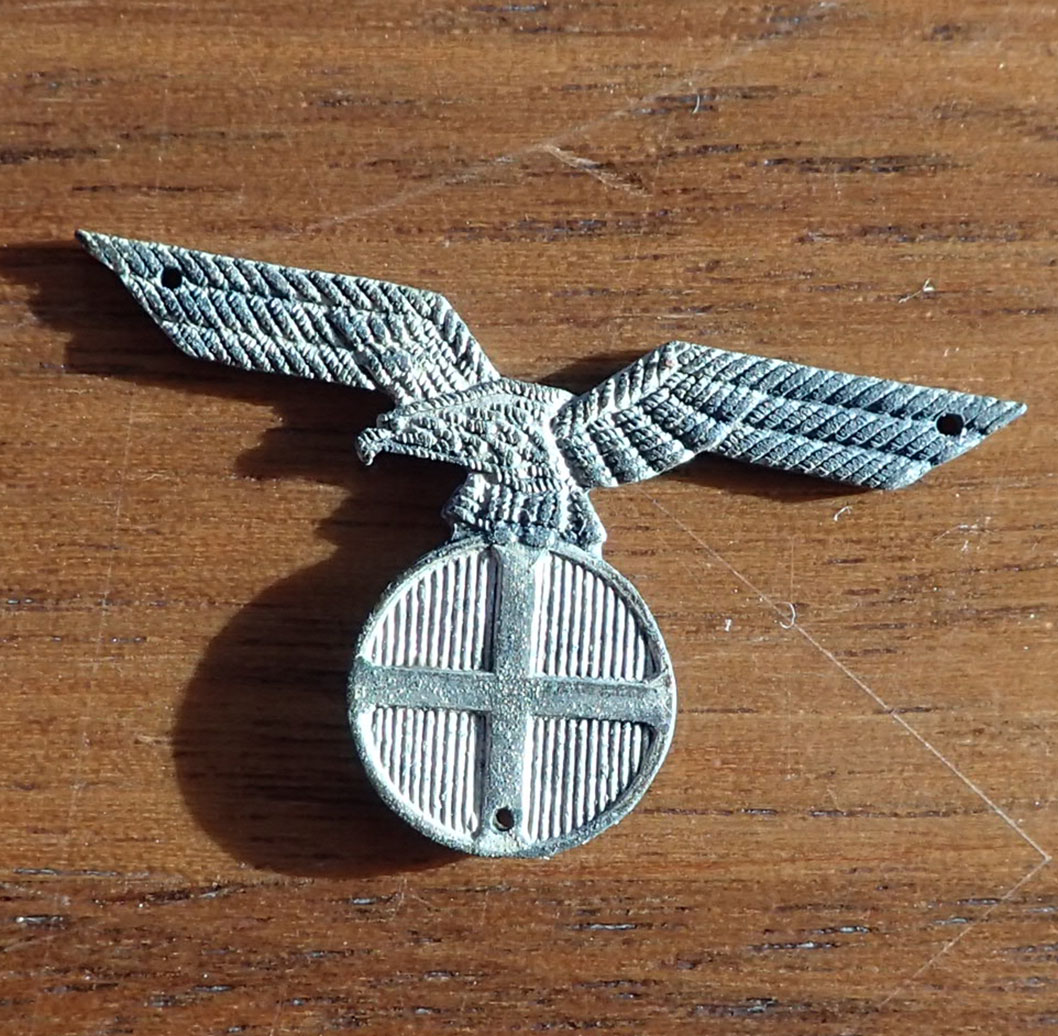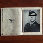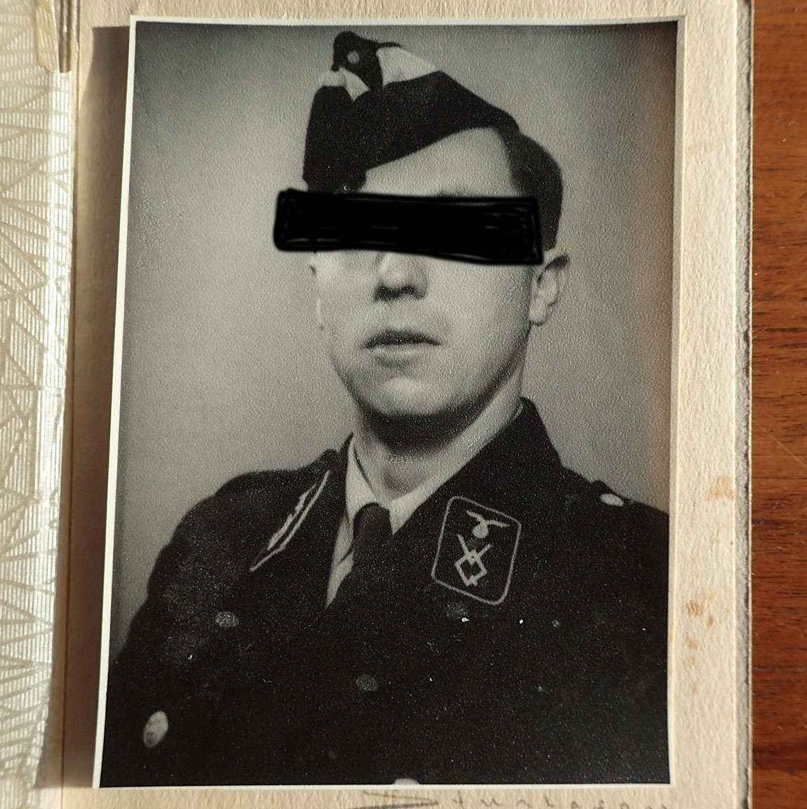 FØRERGARDEN portrett-fotografi + ravn til hans kravespeil. Ett nydelig portrett-fotografi som er satt inn i en montasje med kartong. Foran fotografiet silkepapir. Under fotografiet signert av fotografen med blyant Sturlason 1944. Soldaten er iført paradeuniform også følger det med den ene ravnen fra kravespeilet hans. Man ser det så vidt på venstre kravespeil. Ravnen er den store utgaven og i forsølvet sink til å sy på kravespeilet.