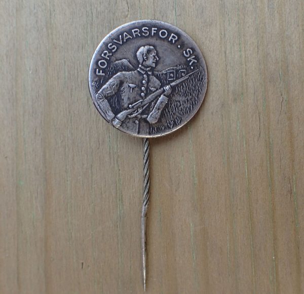 FORSVARSFOR. SK. nål. Nålen har teksten FORSVARSFOR. SK. Med motiv med en norsk garde soldat med Krag Jørgensen gevær. Bak med nål og stemplet med sølvstempel 830 S.
