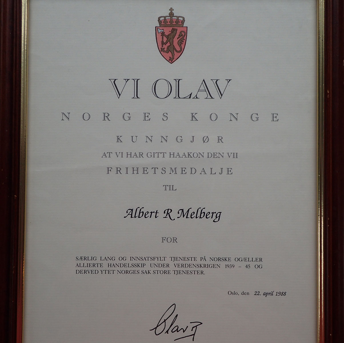 Frihetsmedalje diplom + esken. Diplomet til Frihetsmedaljen er datert 22. april 1988. Med Olav Rex faximilie signatur. Med den originale rammen fra tiden. Esken er i strøken stand og innvendig ligger kun båndspennen til medaljen.