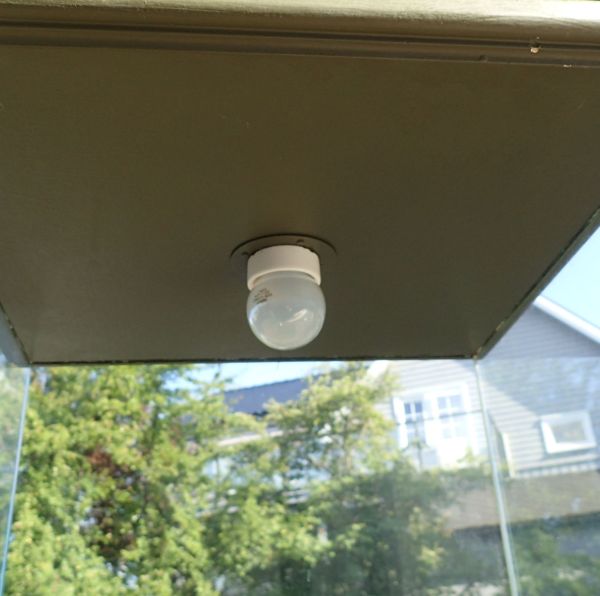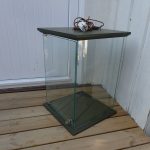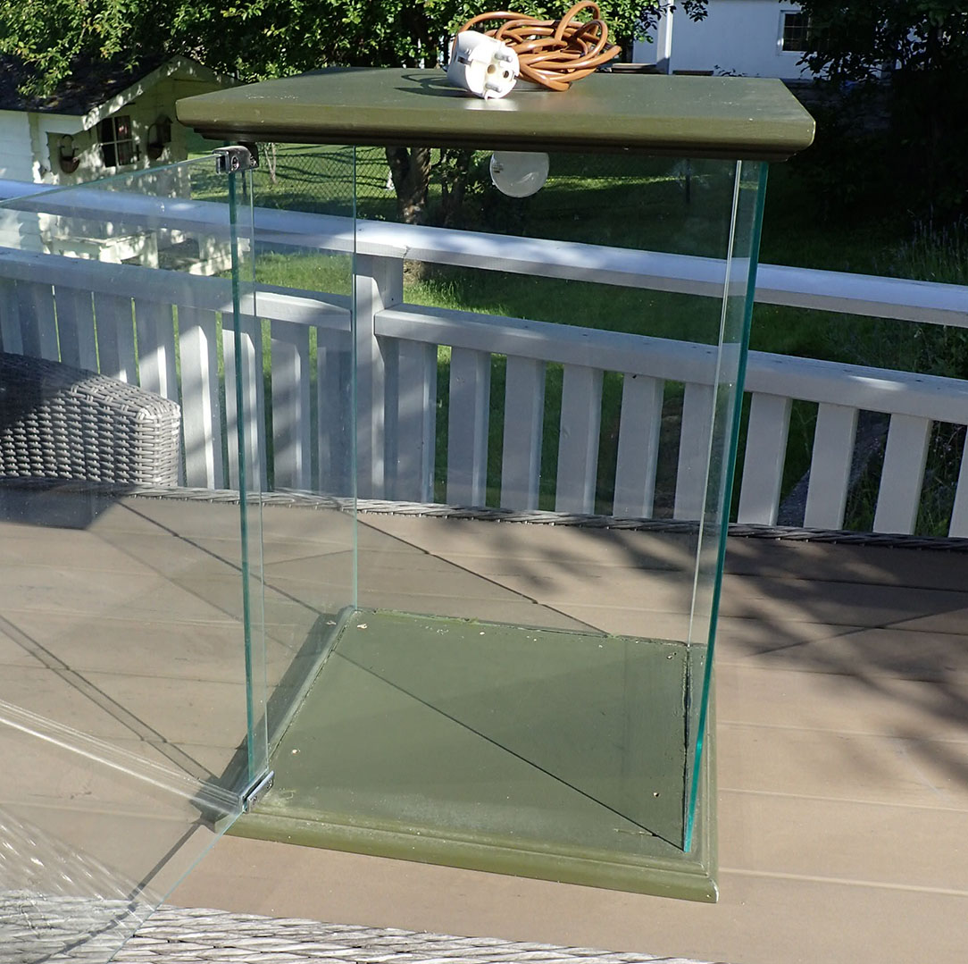 Monter til ett eksklusivt hodeplagg eller lignende. Med topp og sider i grømmalt tre. Innvendig er det montert lys og ledningen går gjennom på toppen av monteret. Det er lås på døren og det følger med en nøkkel.