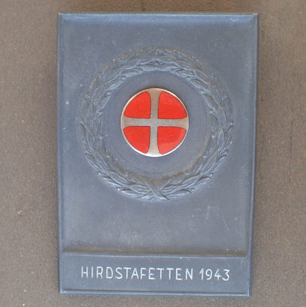 HIRDSTAFETTEN 1943 plakett. Plaketten er produsert i sink. Merket nede til venstre D.A. Produsert av David Andersen. Oslo. Under gravert inn HIRDSTAFETTEN 1943. Midt på plaketten solkors i sølv og emalje. Bak er det en skrue merket RAGNV. PRYTZ. OSLO. Solkorset er strøken i emaljen. Diameter på solkorset er 17 mm.