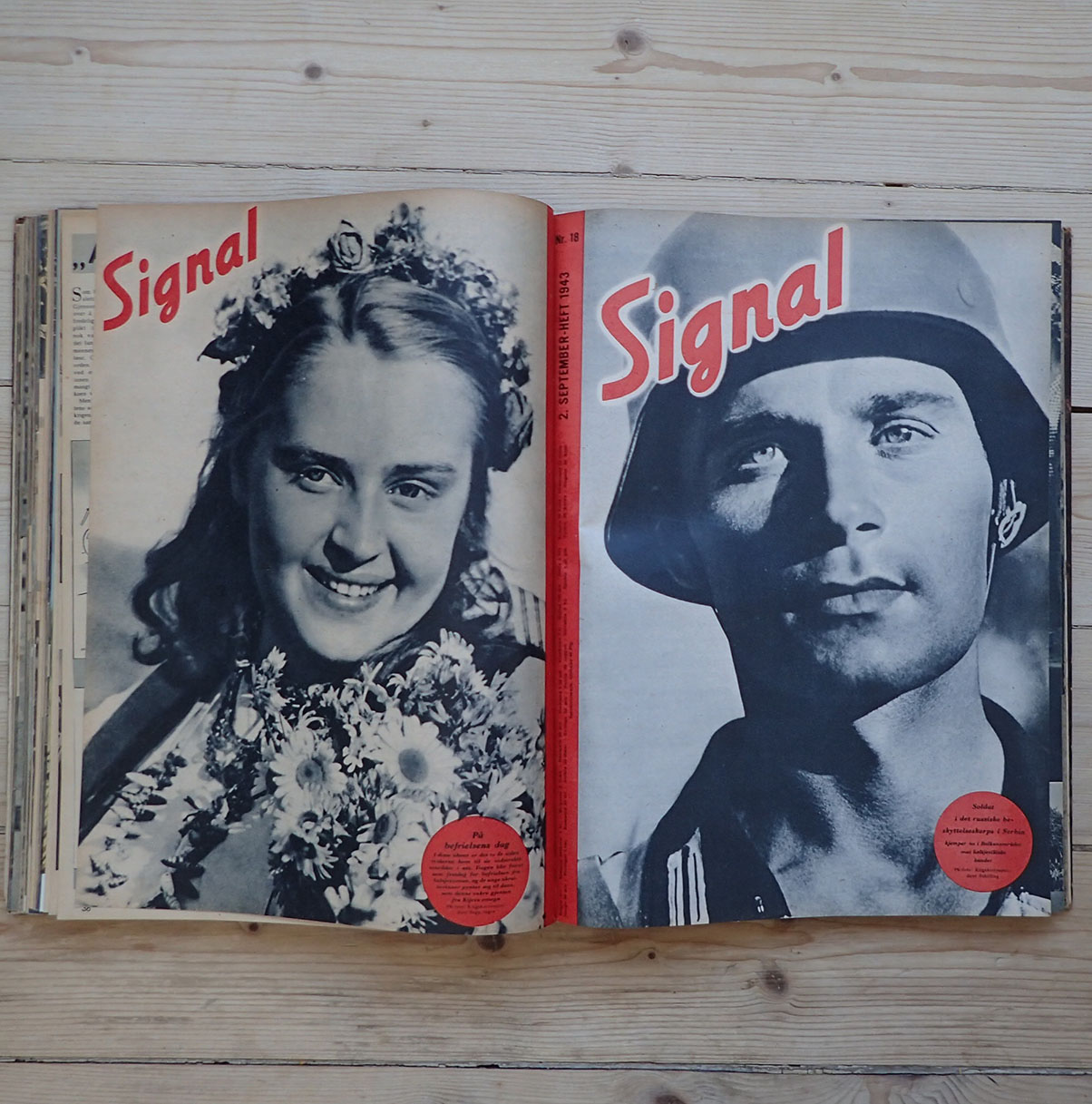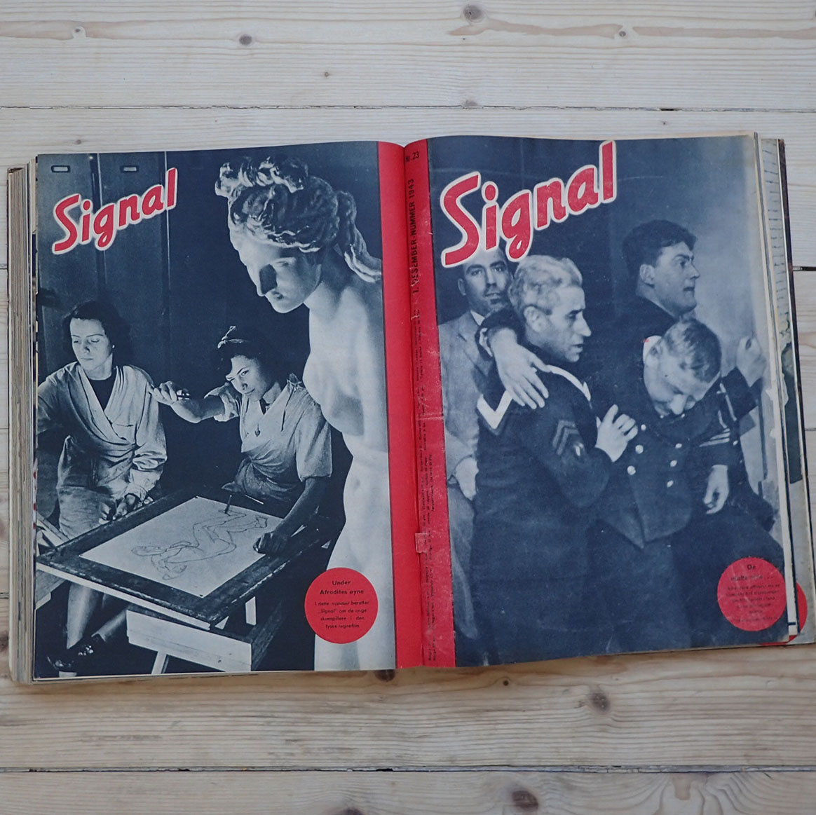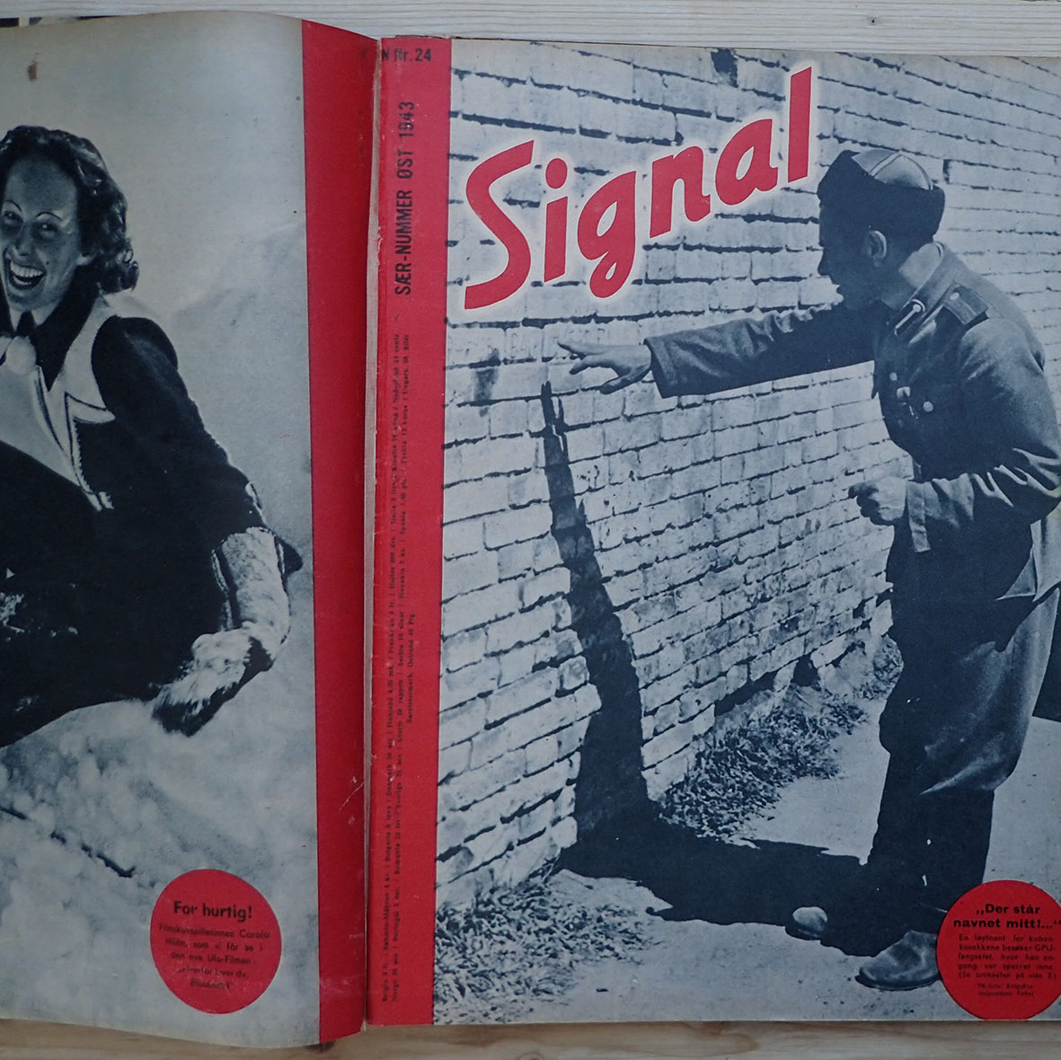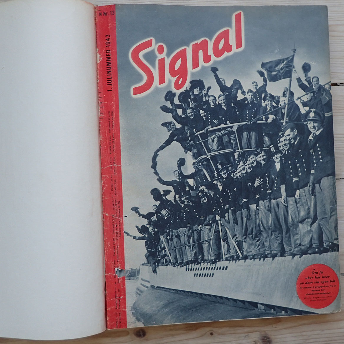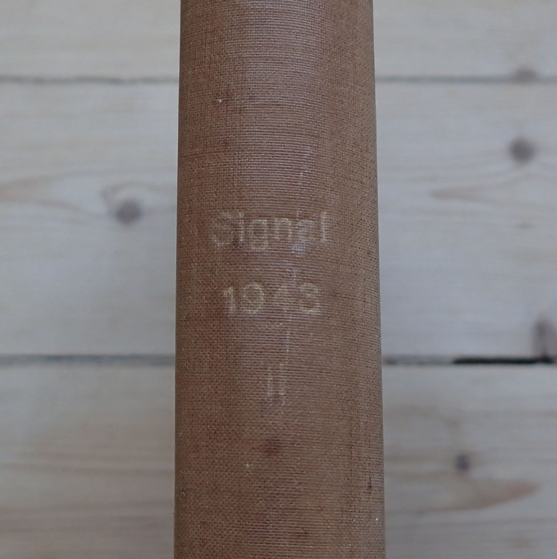Innbundet 13 blader av «Signal 1943 II». Første blad er datert JULINUMMER 1943. Siste 2 blader er datert DESEMBER NUMMER 1943 + SÆR-NUMMER ØST 1943. Boken inneholder 12 eller 13 blader. Jeg har bladd i hele boken og fant rundt 5-6- blader med små rifter ellers er resten i meget pen stand.