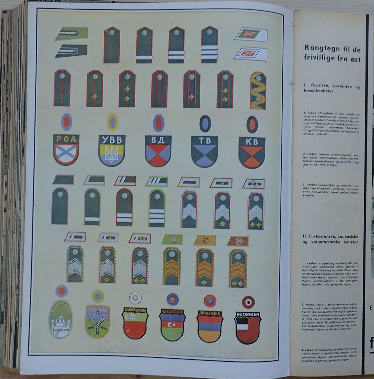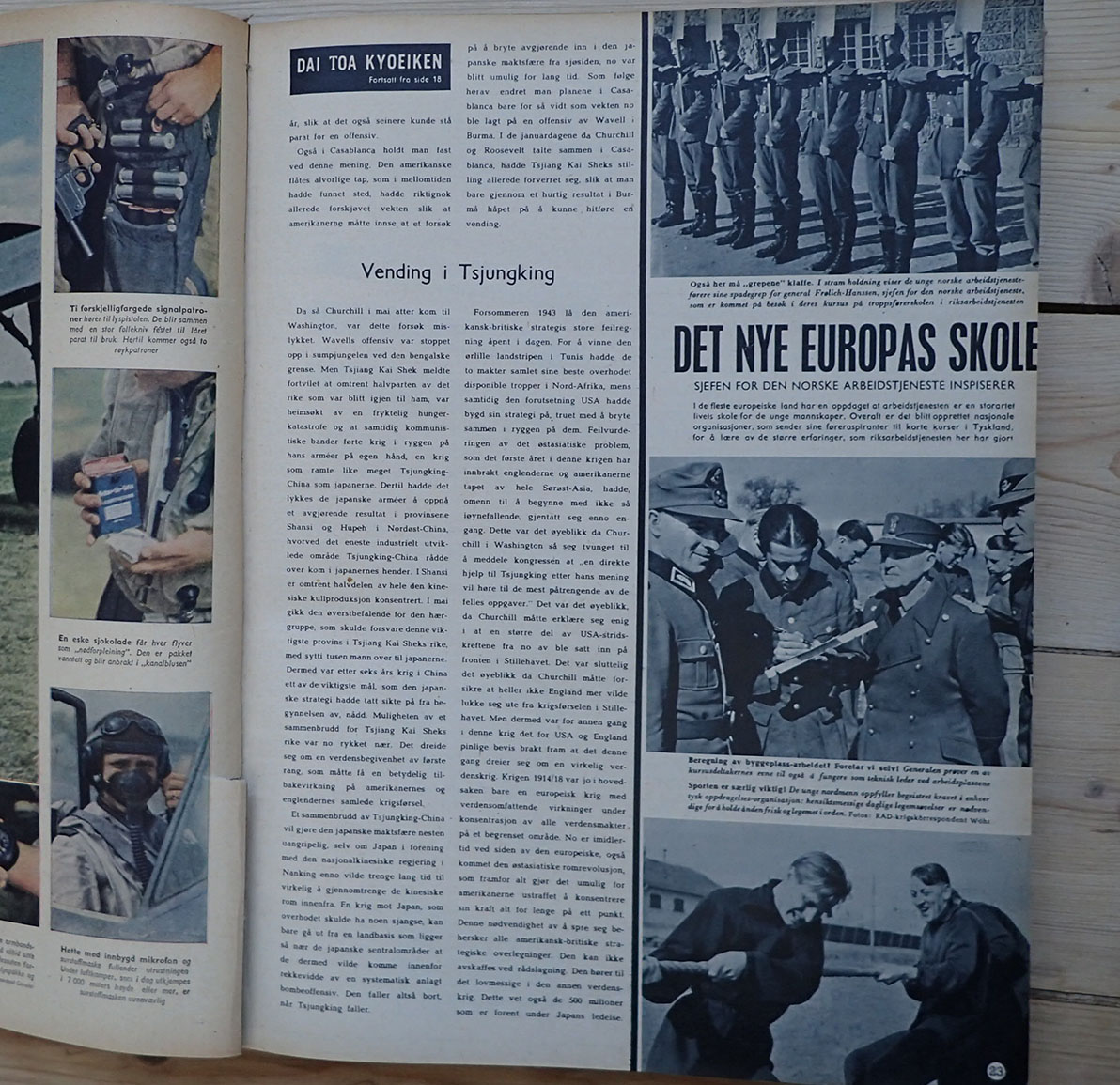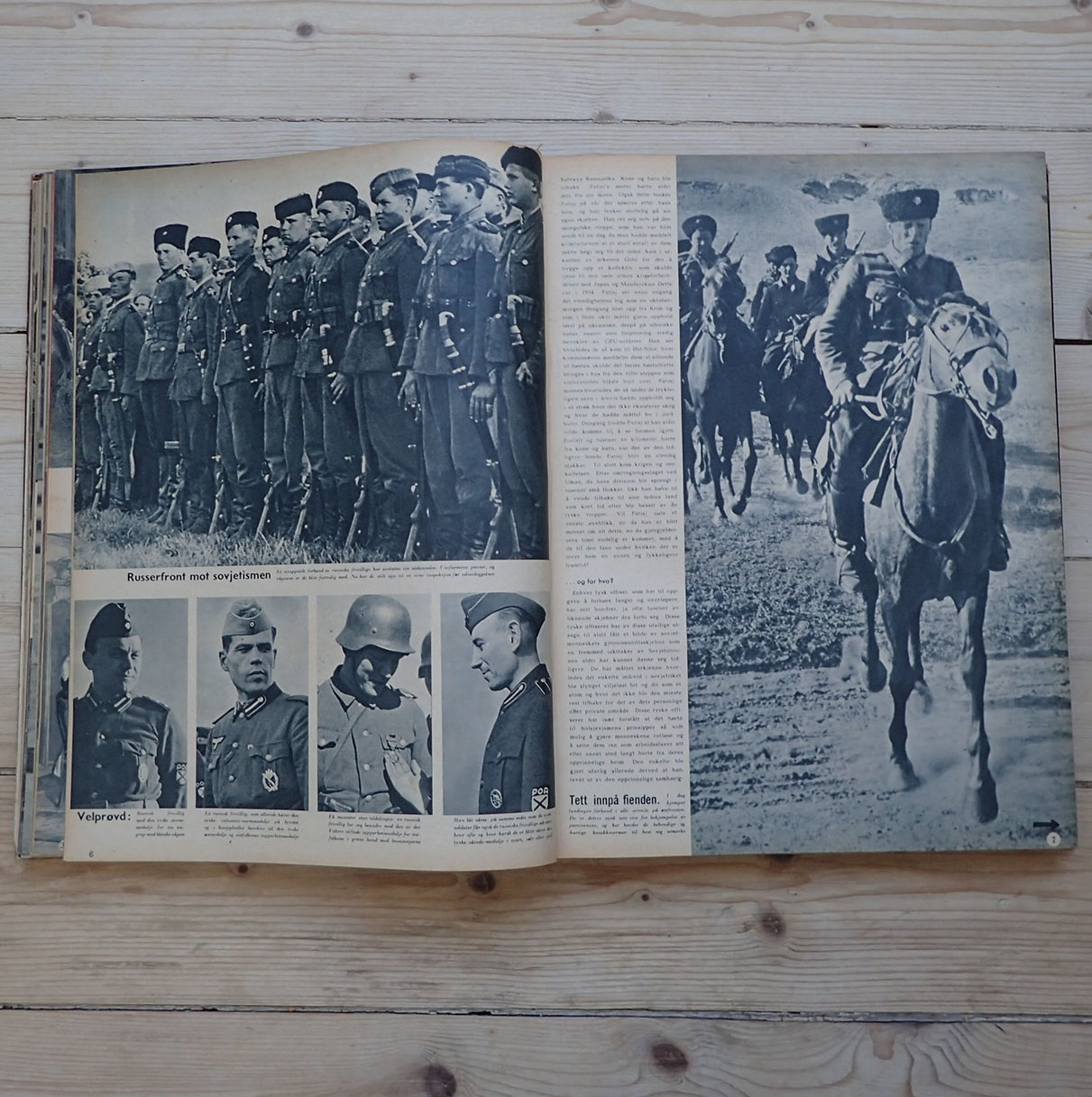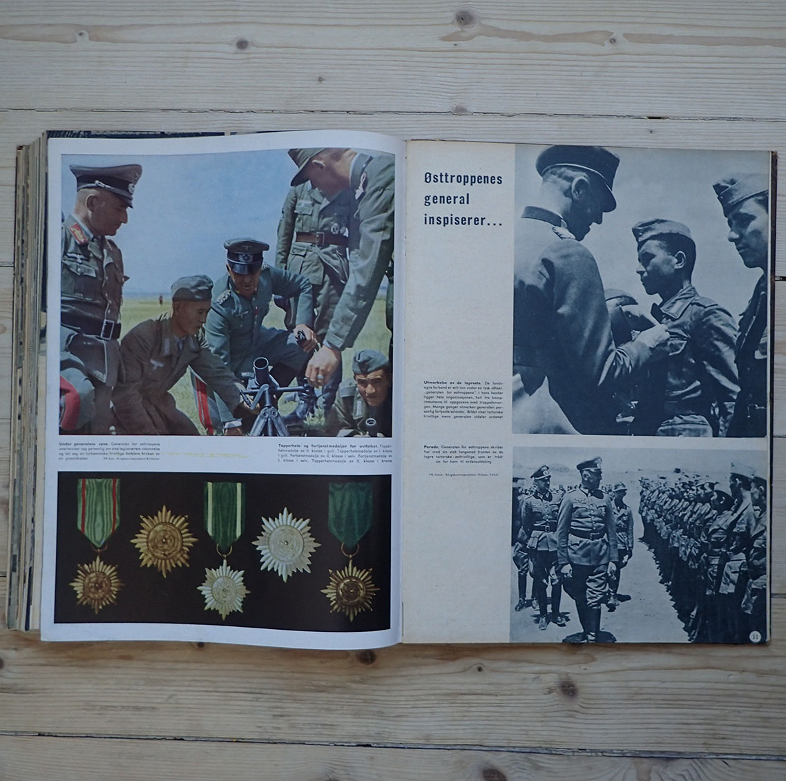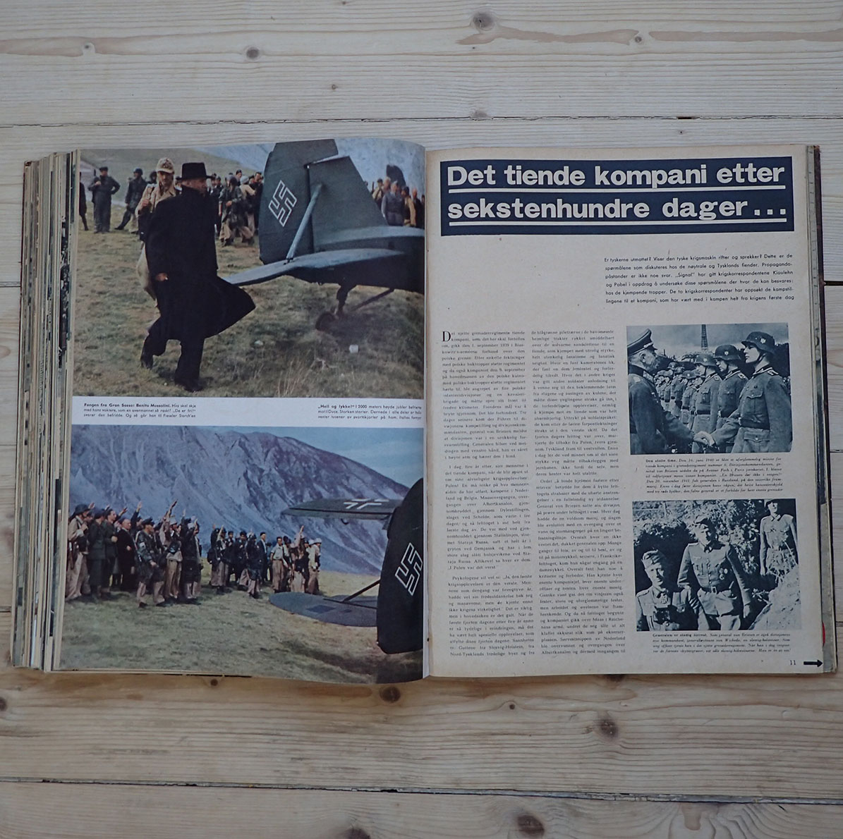 Innbundet 13 blader av «Signal 1943 II». Første blad er datert JULINUMMER 1943. Siste 2 blader er datert DESEMBER NUMMER 1943 + SÆR-NUMMER ØST 1943. Boken inneholder 12 eller 13 blader. Jeg har bladd i hele boken og fant rundt 5-6- blader med små rifter ellers er resten i meget pen stand.