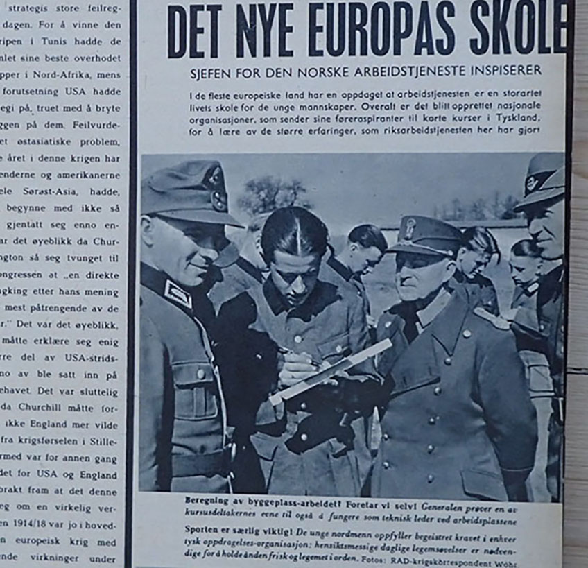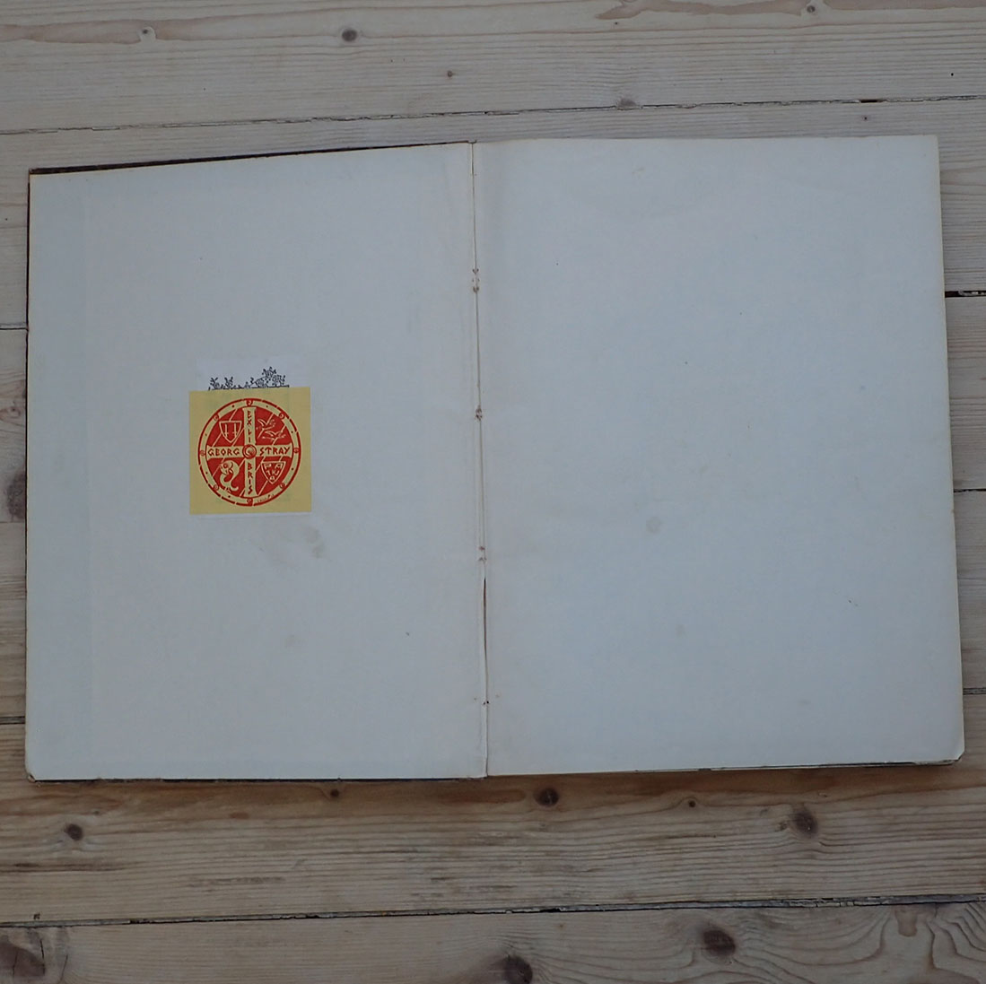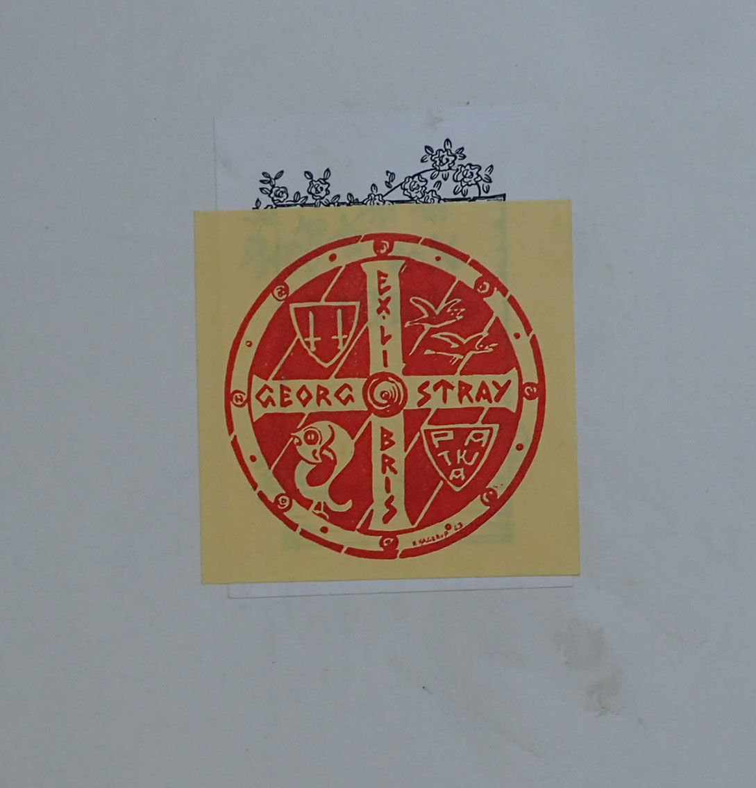 På side 3 EXLIBRIS merke innklebet, over ett annet merke. Har tilhørt den kjente NS mannen GEORG STRAY. Utformet som solkors med motiver inni armene. Bl.a. Rikshird skjold med sverd og Hugin og Munin.