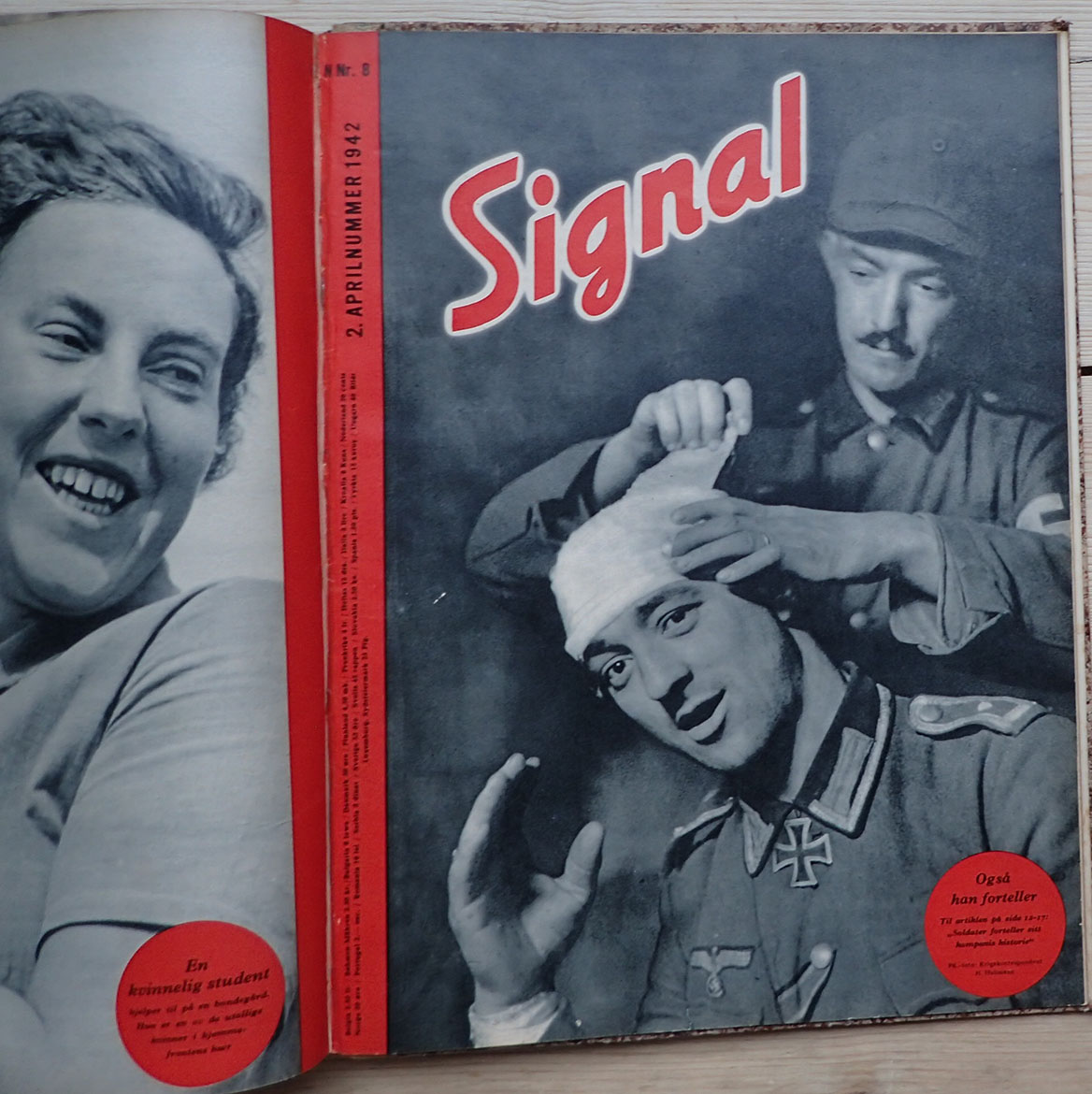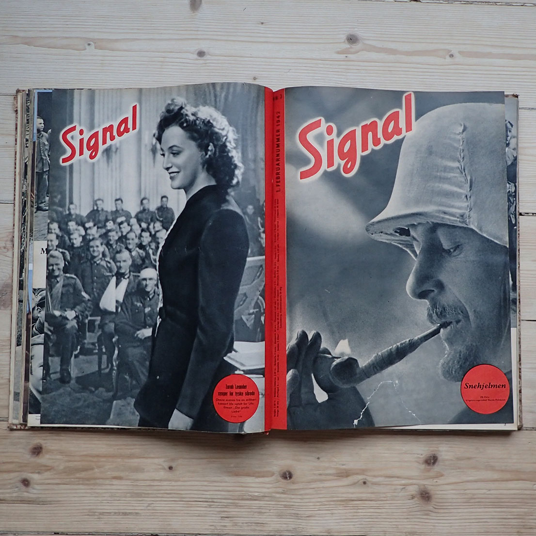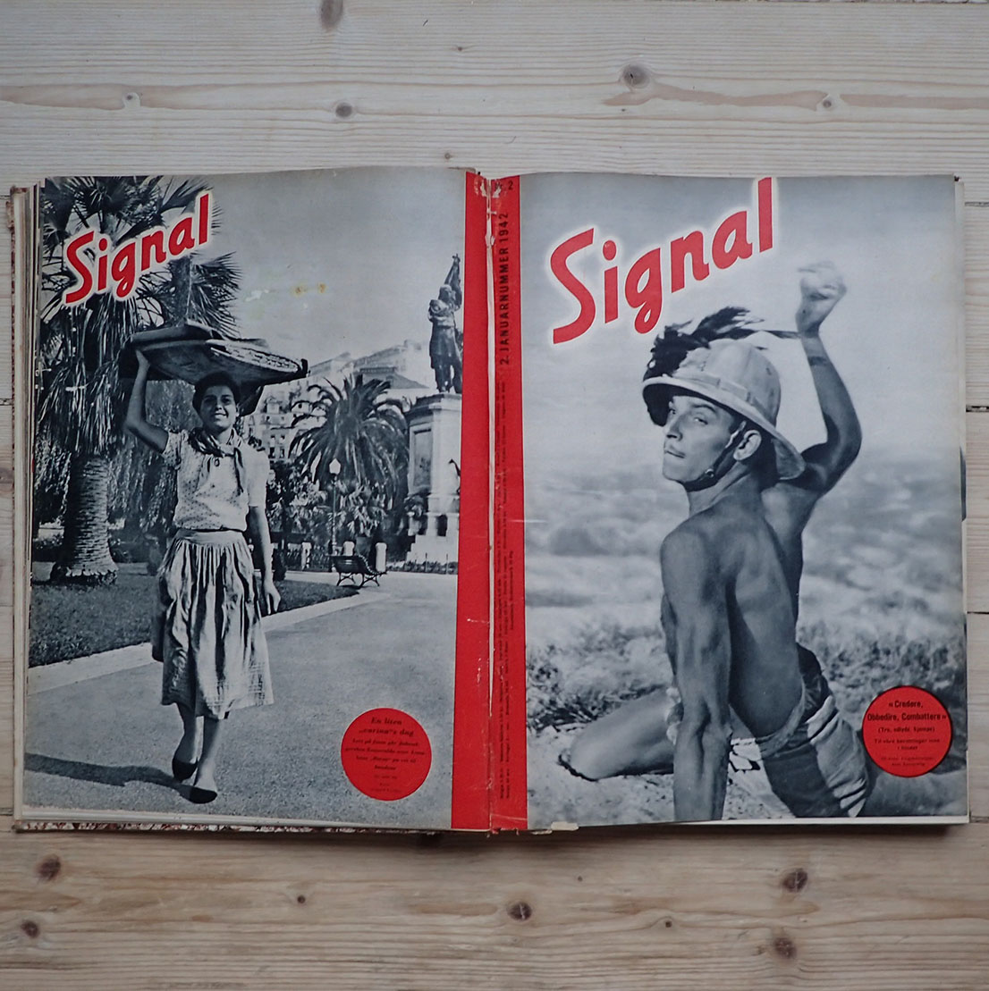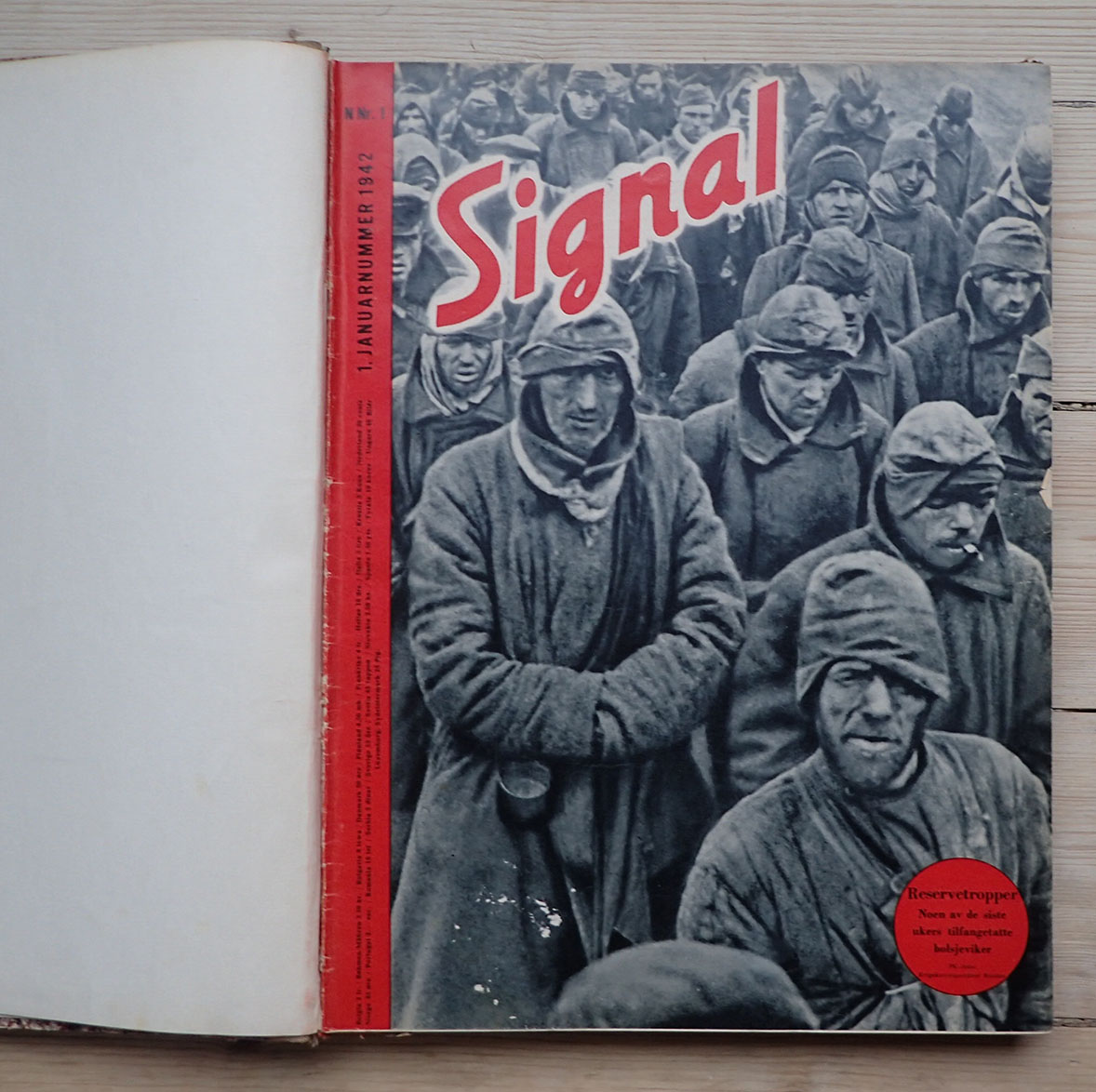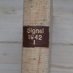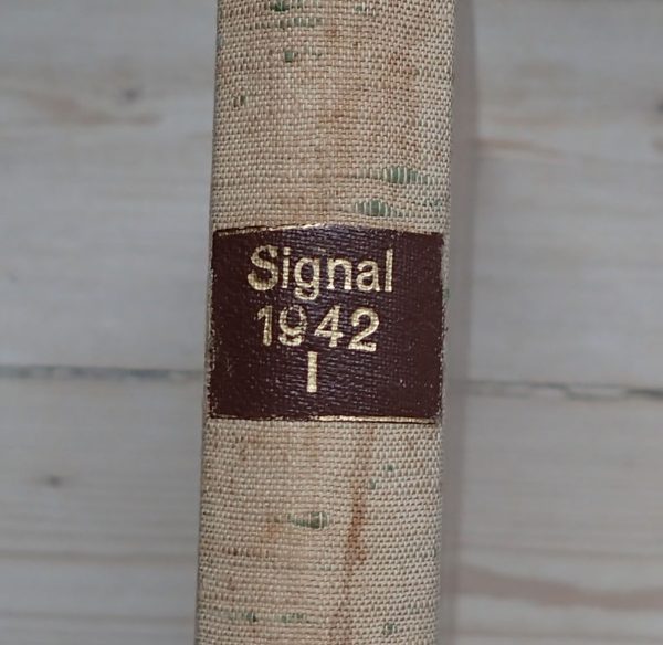 Innbundet 8 blader av «Signal 1942 I». Første blad er datert 1. Januar 1942. Siste blad er datert 2. April 1942. Det vil si at boken inneholder 8 blader og at det kom ut 2 blader i måneden. Jeg har bladd i hele boken og fant rundt 6-7 blader med små rifter og ett med en stor rift ellers er resten i meget pen stand. Ett blad på tysk.