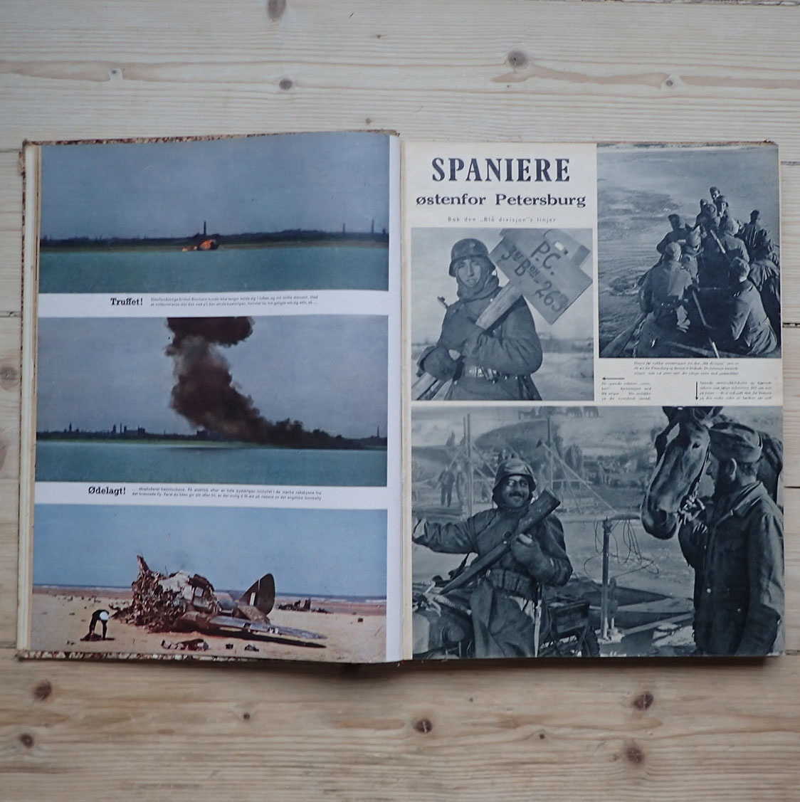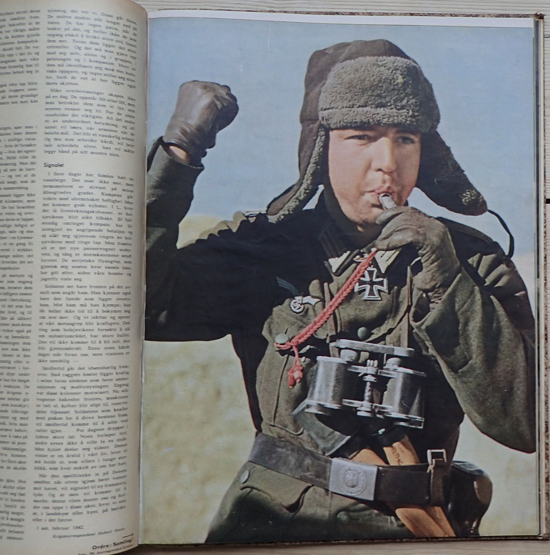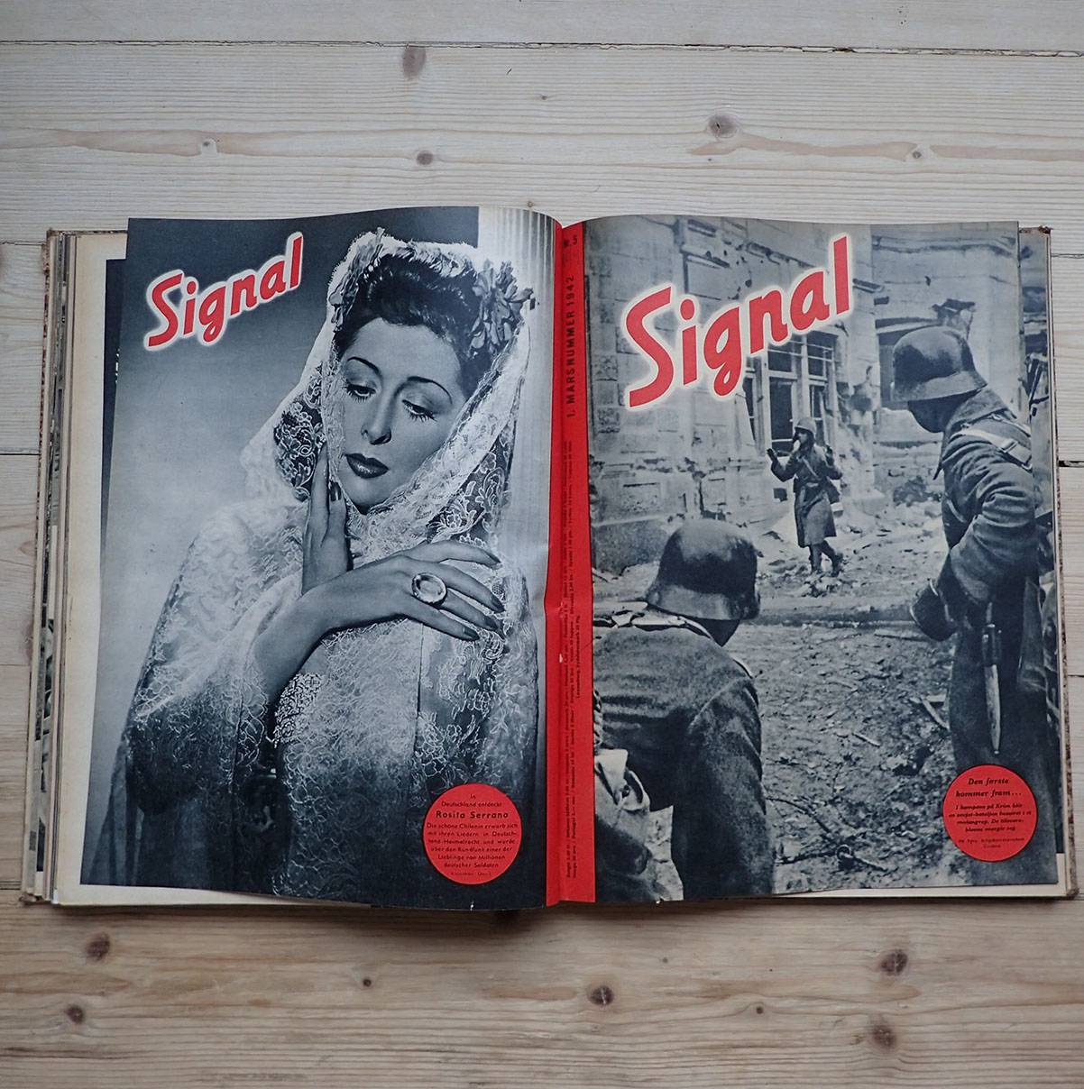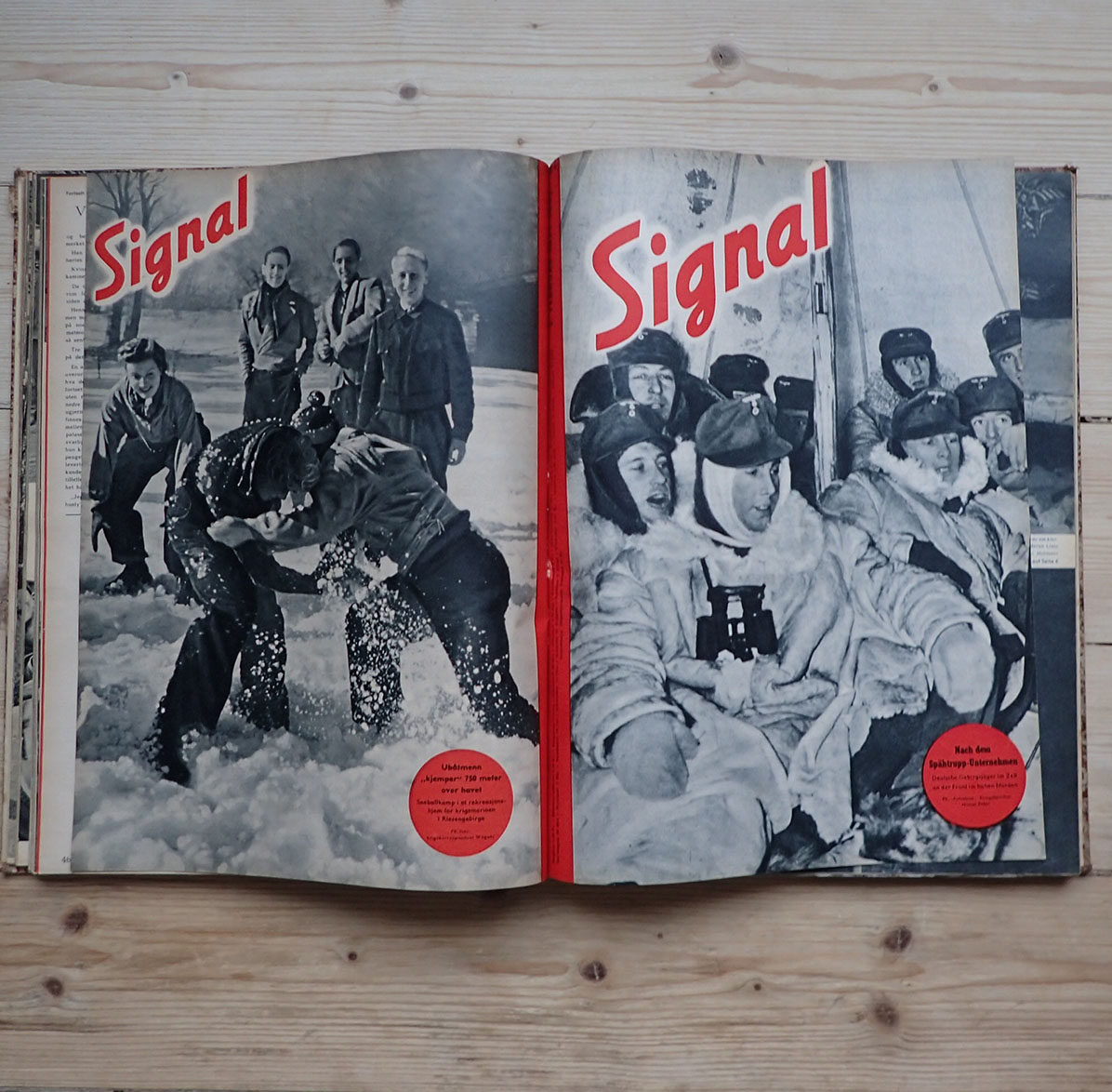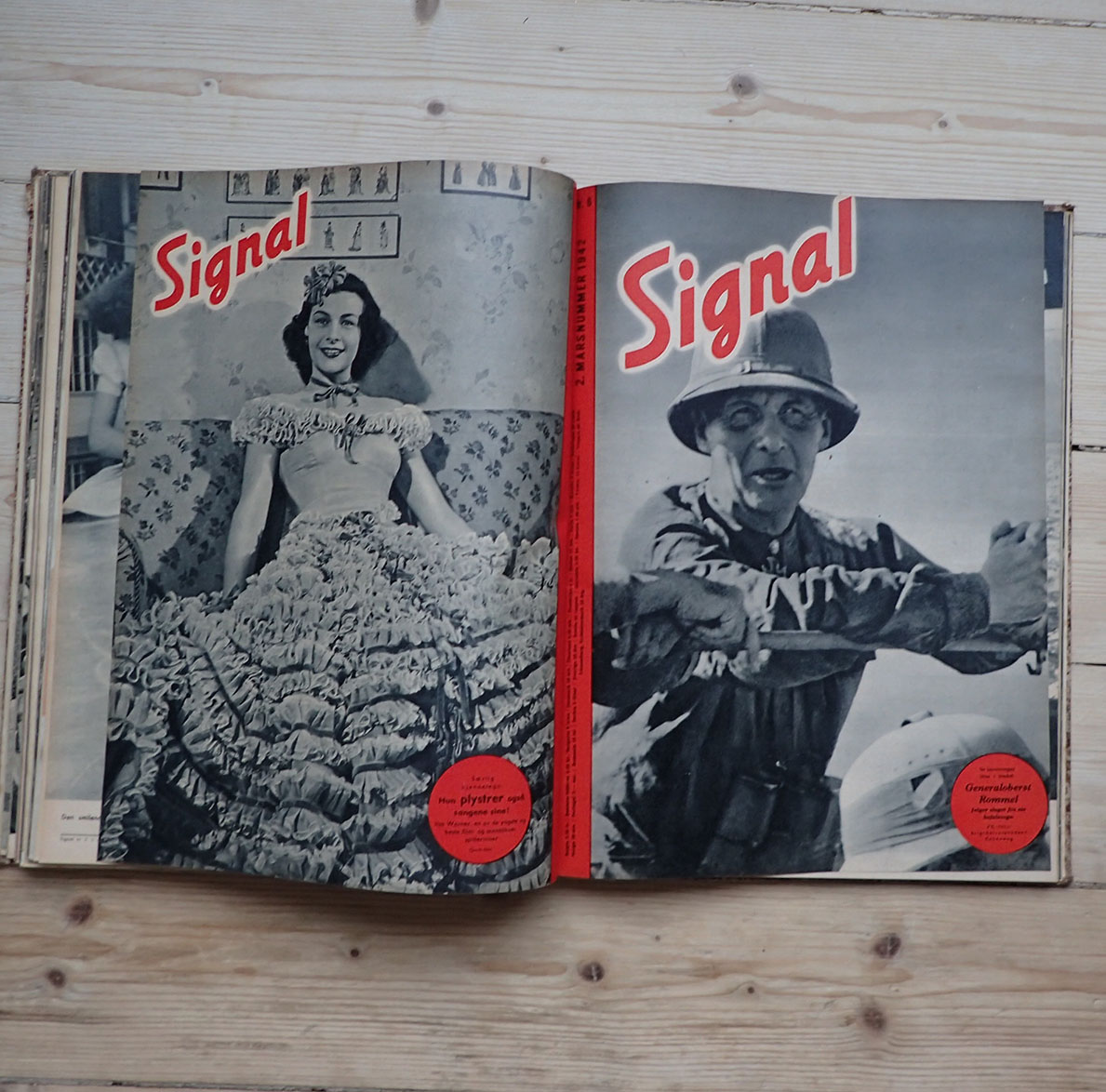 Innbundet 8 blader av «Signal 1942 I». Første blad er datert 1. Januar 1942. Siste blad er datert 2. April 1942. Det vil si at boken inneholder 8 blader og at det kom ut 2 blader i måneden. Jeg har bladd i hele boken og fant rundt 6-7 blader med små rifter og ett med en stor rift ellers er resten i meget pen stand. Ett blad på tysk.