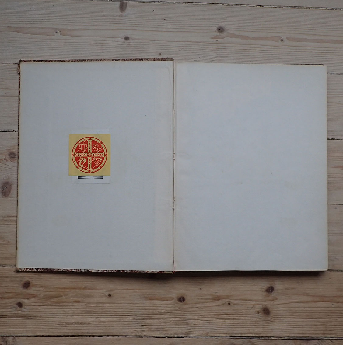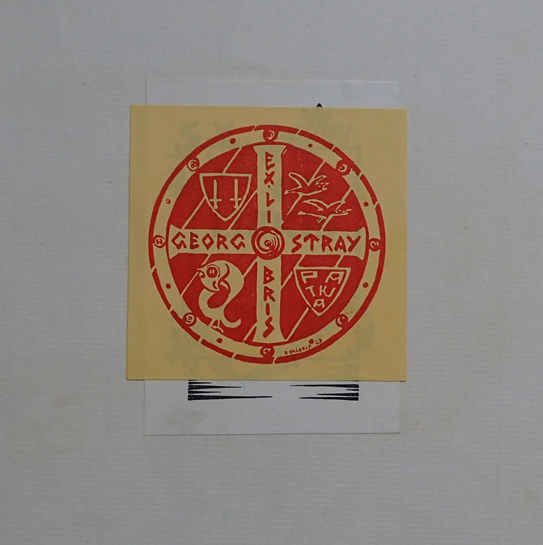 På side 3 EXLIBRIS merke innklebet, over ett annet merke. Har tilhørt den kjente NS mannen GEORG STRAY. Utformet som solkors med motiver inni armene. Bl.a. Rikshird skjold med sverd og Hugin og Munin.