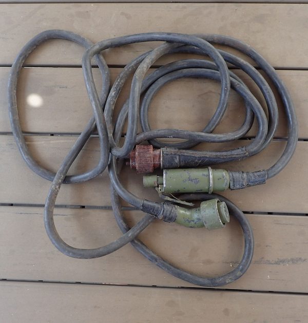 Kabel til 25 cm. Kriegsmarine – Einheits Scheinwerfer (ESw-25). Kabelen har plugg i lys brun bakelitt i den ene enden. Ved pluggen tykk lær forsterkning. Så en plugg en metall-vipper som er fjærbelastet også med lær forsterkning. Så den siste pluggen, som er i metall hvor festet skrår. Også med lær forsterkning.
