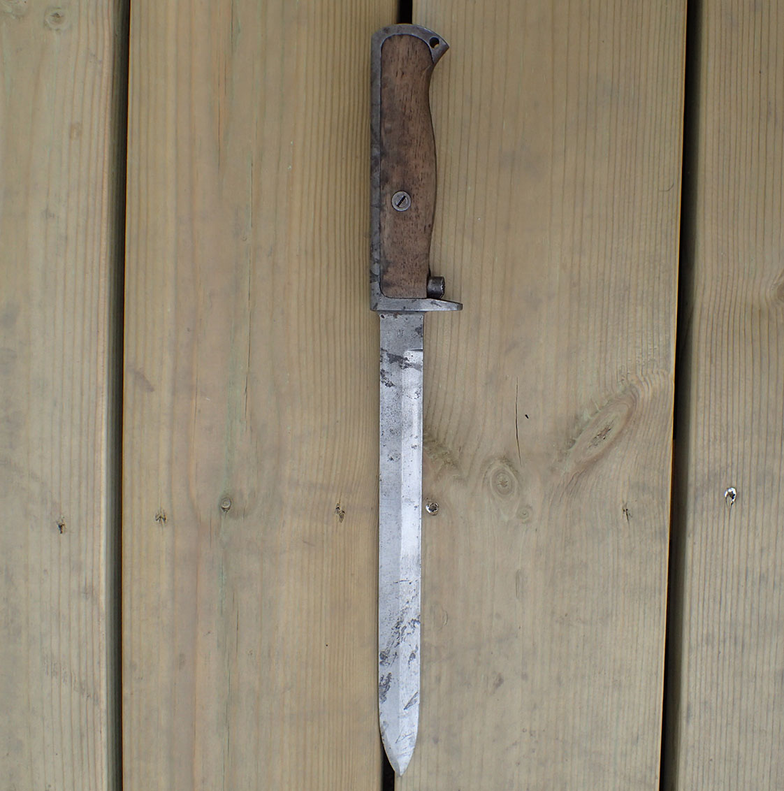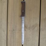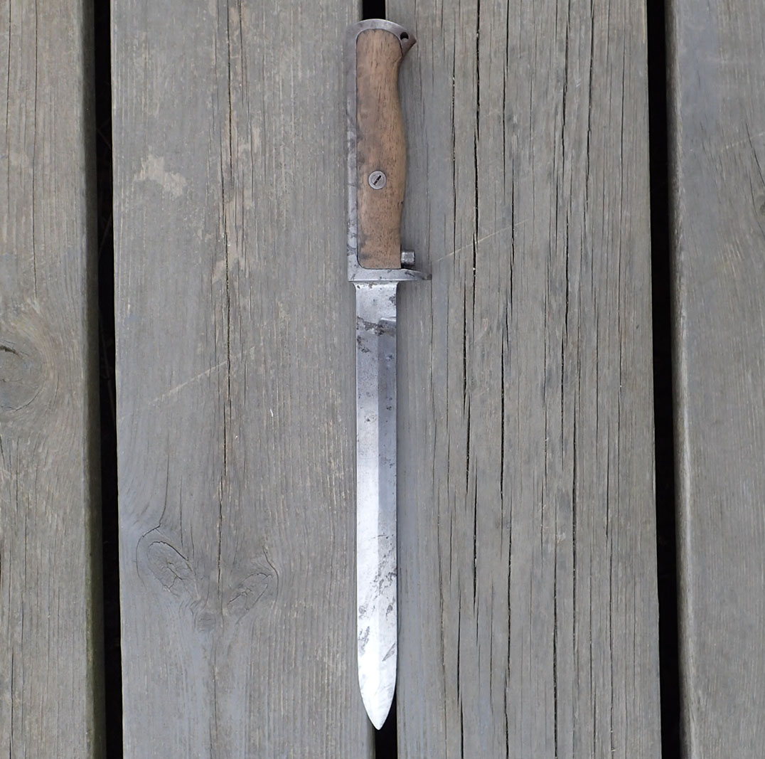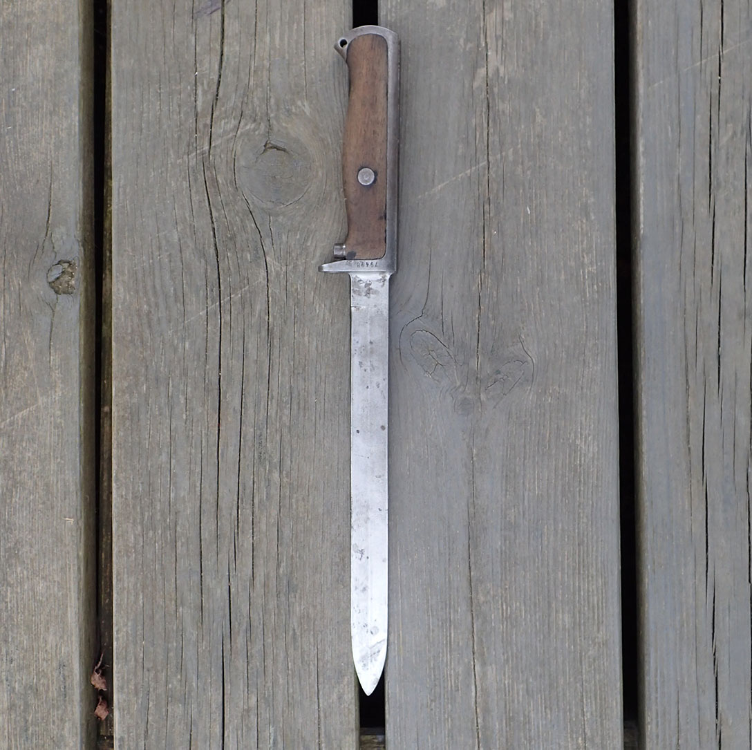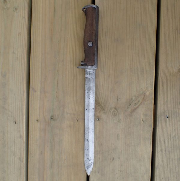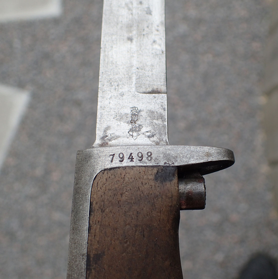 Krag bajonett. Denne er produsert hos Kongsberg våpenfabrikk. Bajonetten er merket med «kronet K» på den ene siden.  På den andre siden merket med kronet H7 og CB. Stemplet med våpennummer 79498. Med grep i lys tre. Utløserknappen virker utmerket. Pent blad.