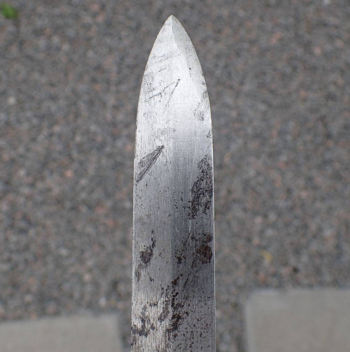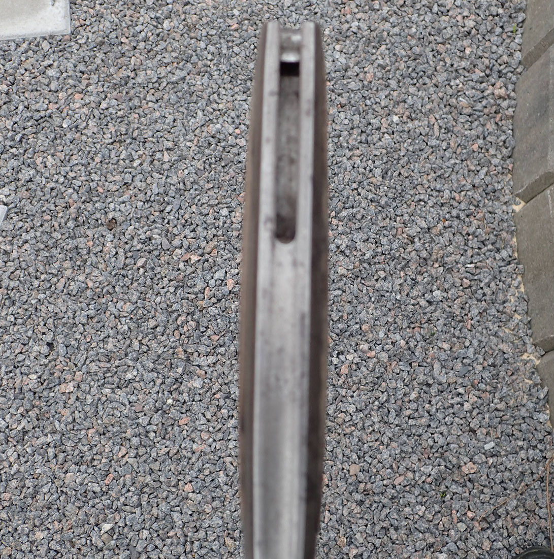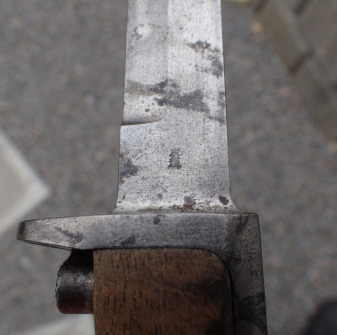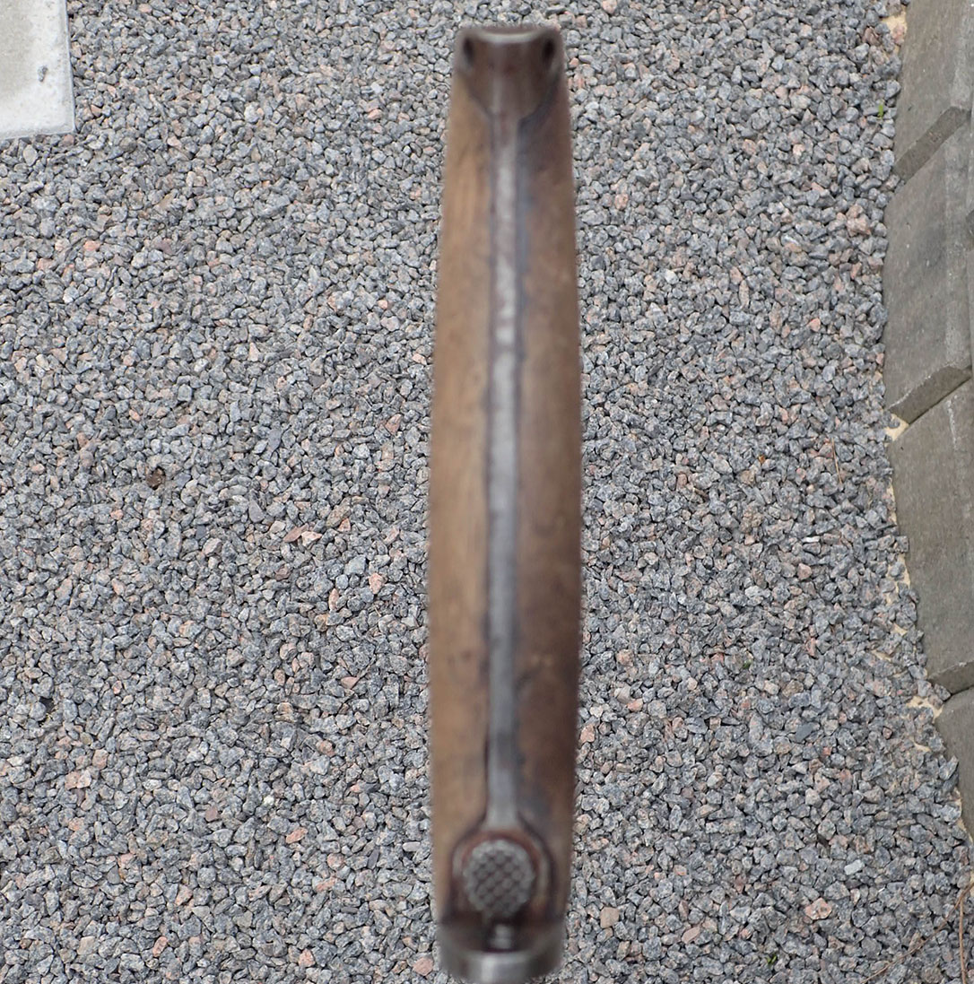 Krag bajonett. Denne er produsert hos Kongsberg våpenfabrikk. Bajonetten er merket med «kronet K» på den ene siden.  På den andre siden merket med kronet H7 og CB. Stemplet med våpennummer 79498. Med grep i lys tre. Utløserknappen virker utmerket. Pent blad.