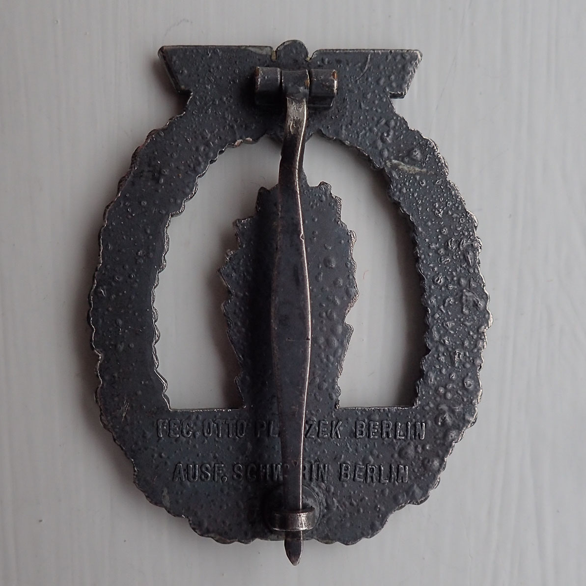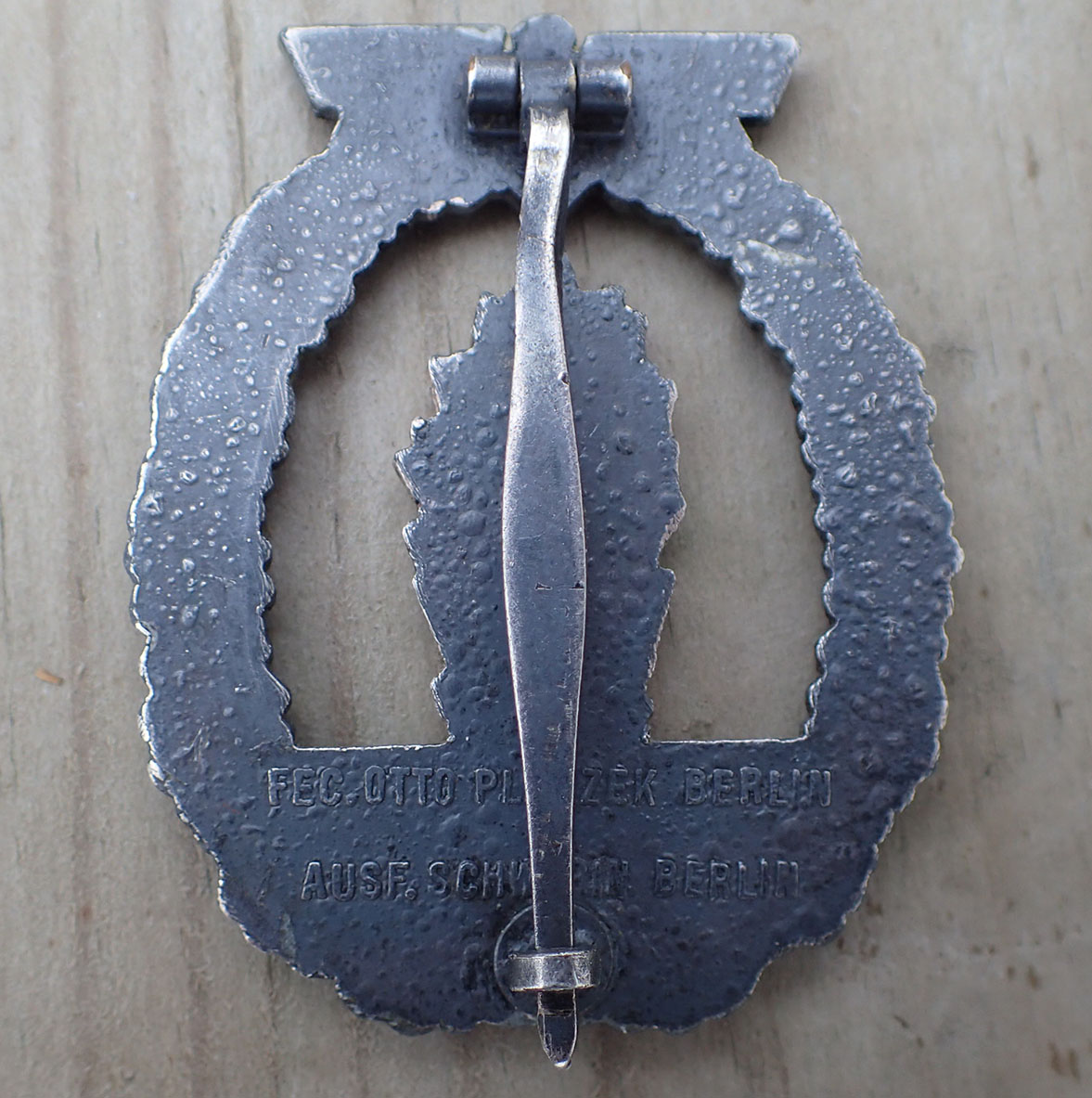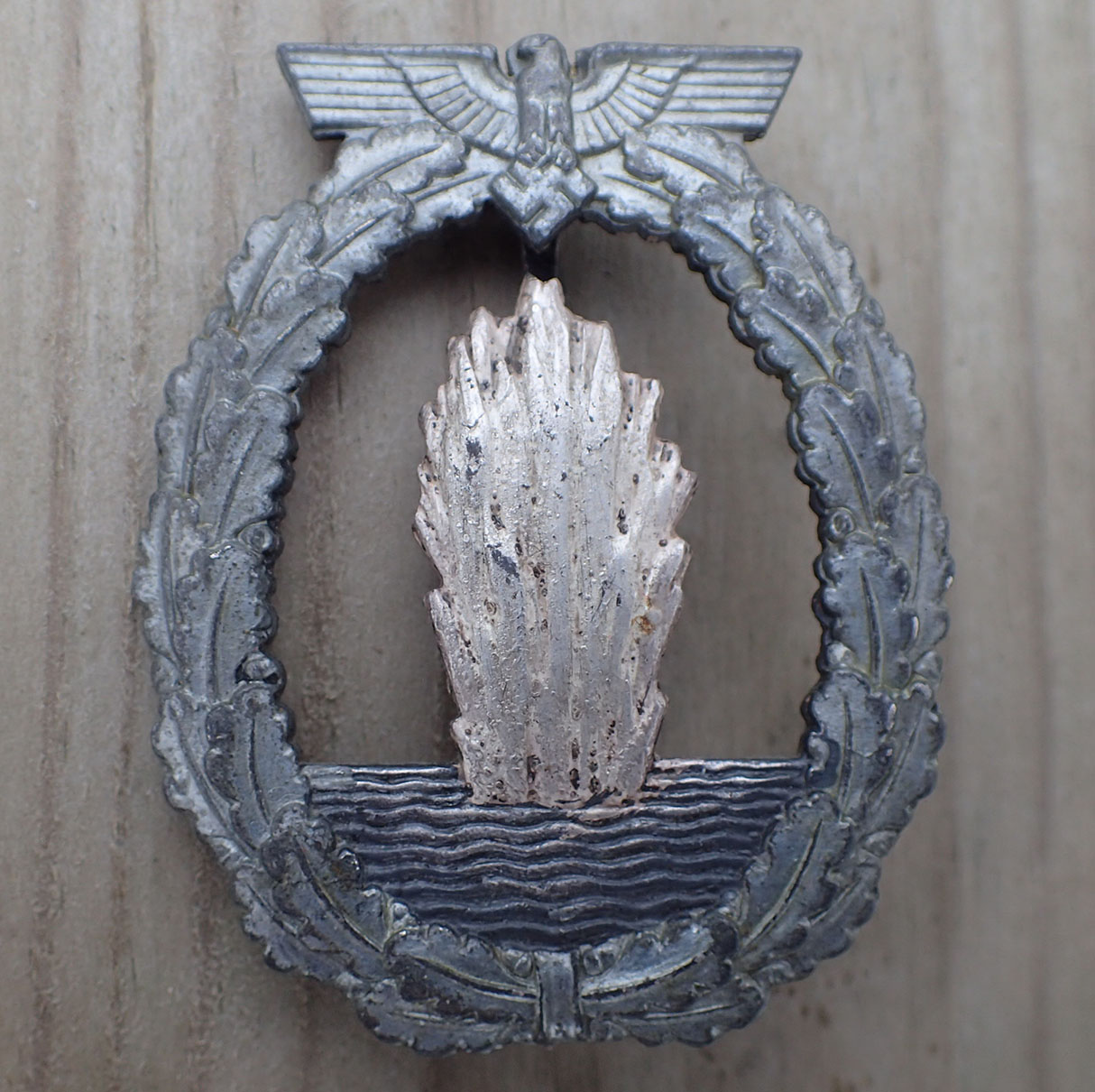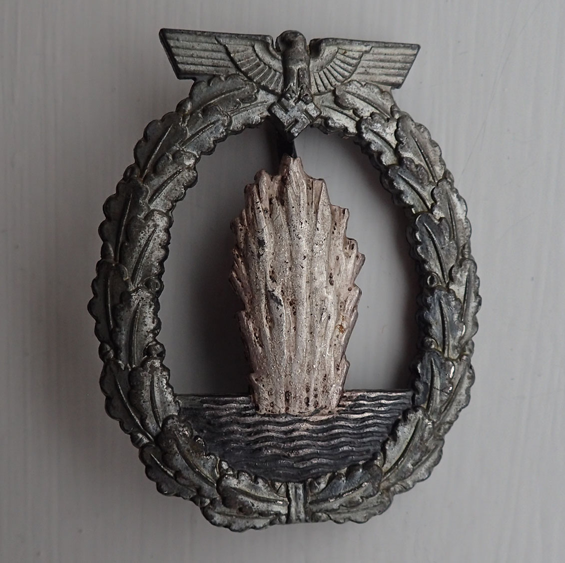 Kriegsmarine Minesøkermerke. Innstiftet 31. august 1940. Produsert i Feinsink. Med forsølvet grå krans og med forsølvet blank vannsøyle. Bak er merke blånert. Med umagnetisk rett flat nål som går ut på midten. Med kraftige nålfester. Nede merket med produsenten FEC. OTTO PLACZEK BERLIN. AUSF. SCHWERIN BERLIN.
