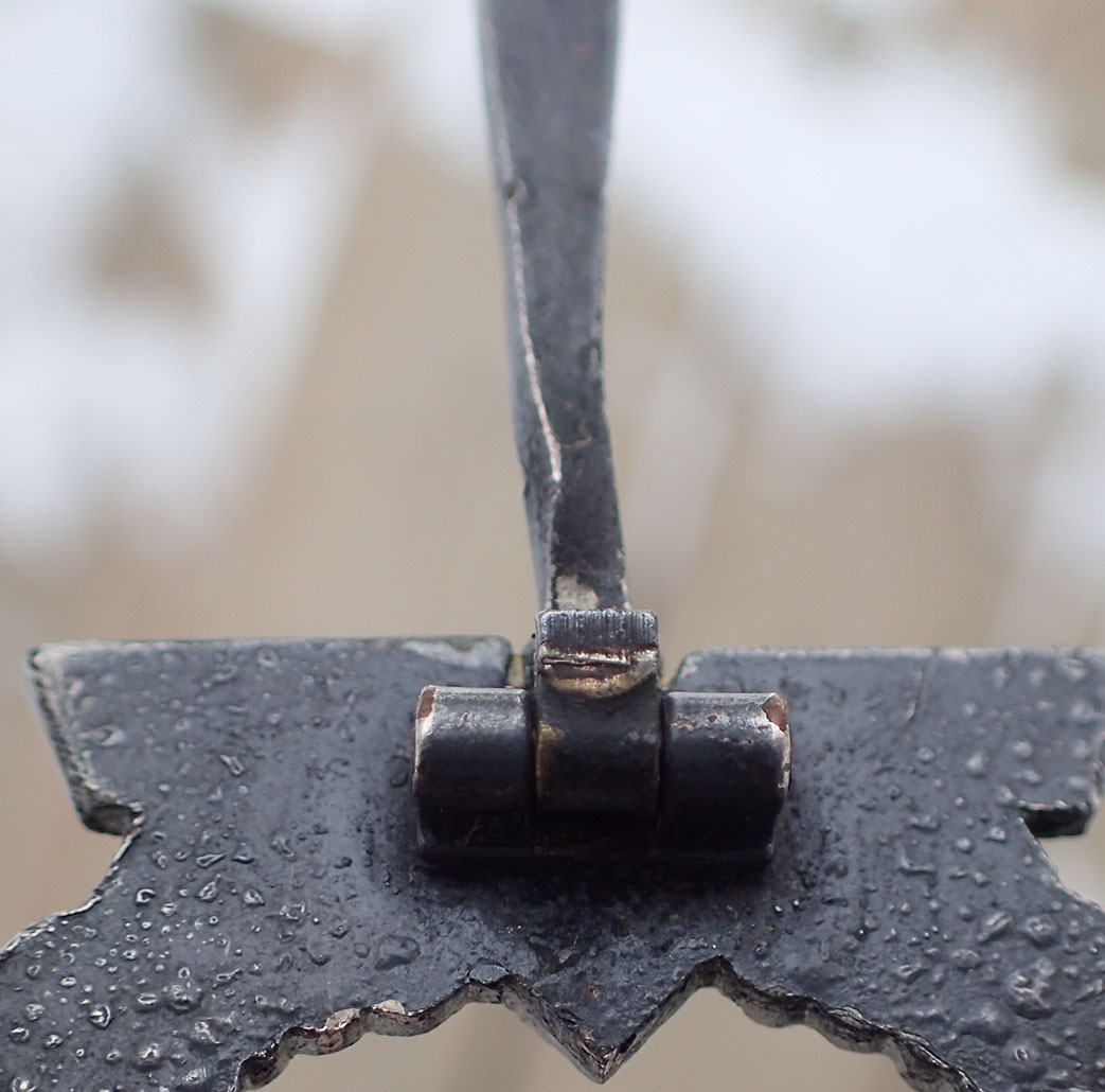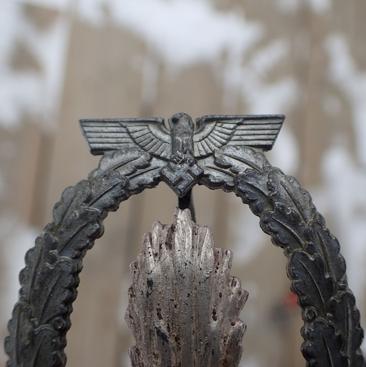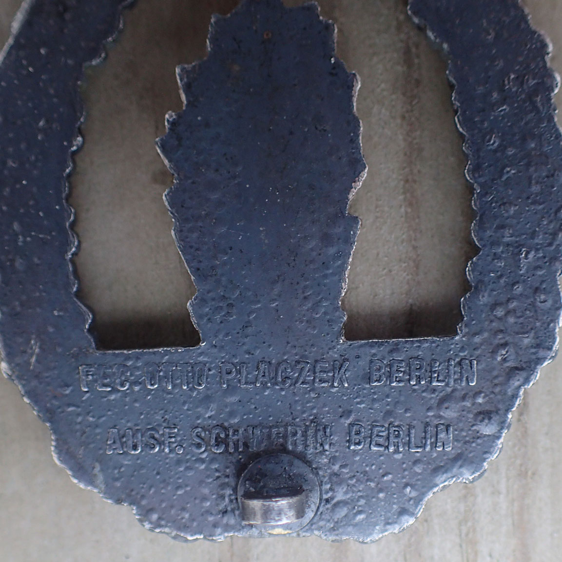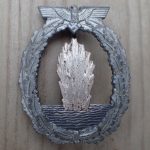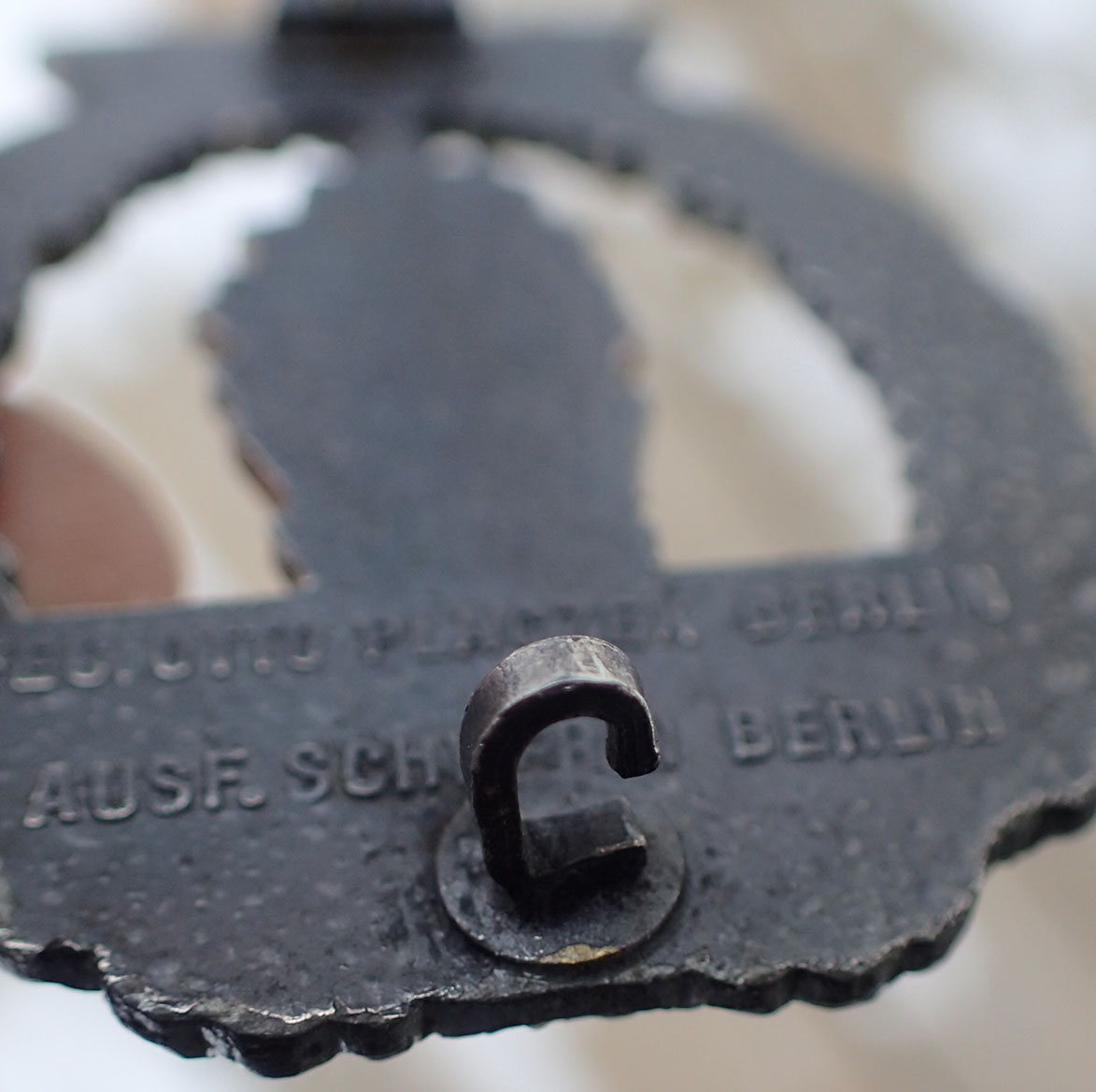 Kriegsmarine Minesøkermerke. Innstiftet 31. august 1940. Produsert i Feinsink. Med forsølvet grå krans og med forsølvet blank vannsøyle. Bak er merke blånert. Med umagnetisk rett flat nål som går ut på midten. Med kraftige nålfester. Nede merket med produsenten FEC. OTTO PLACZEK BERLIN. AUSF. SCHWERIN BERLIN.
