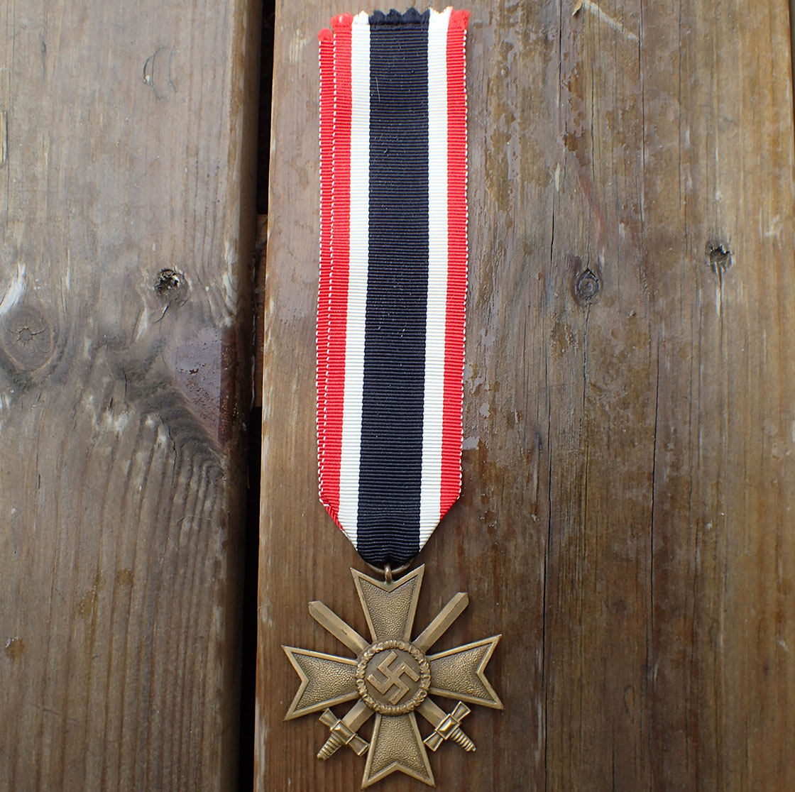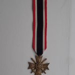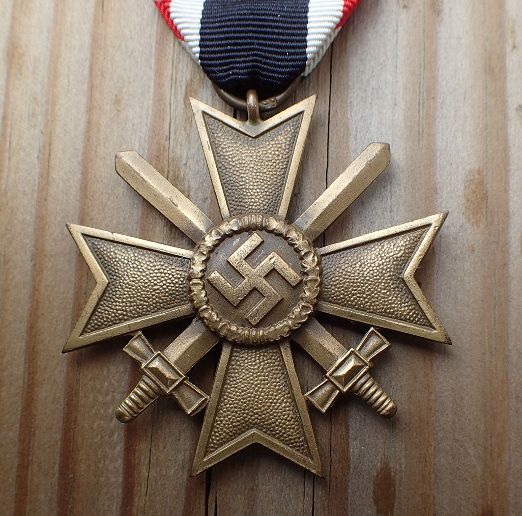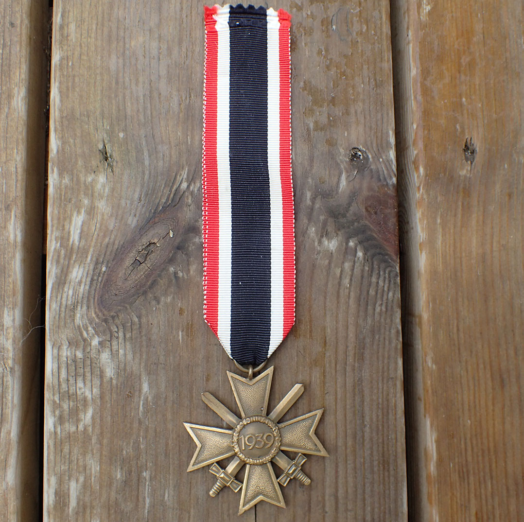 Krigsfortjenestekorset 2 klasse med sverd. Innstiftet 18. oktober 1939. Tidlig utgave i patinert messing. Stemplet med produsenten på ringen 65 (Klein & Quenzar A.G. Idar-Oberstein). Med full lengde bånd.