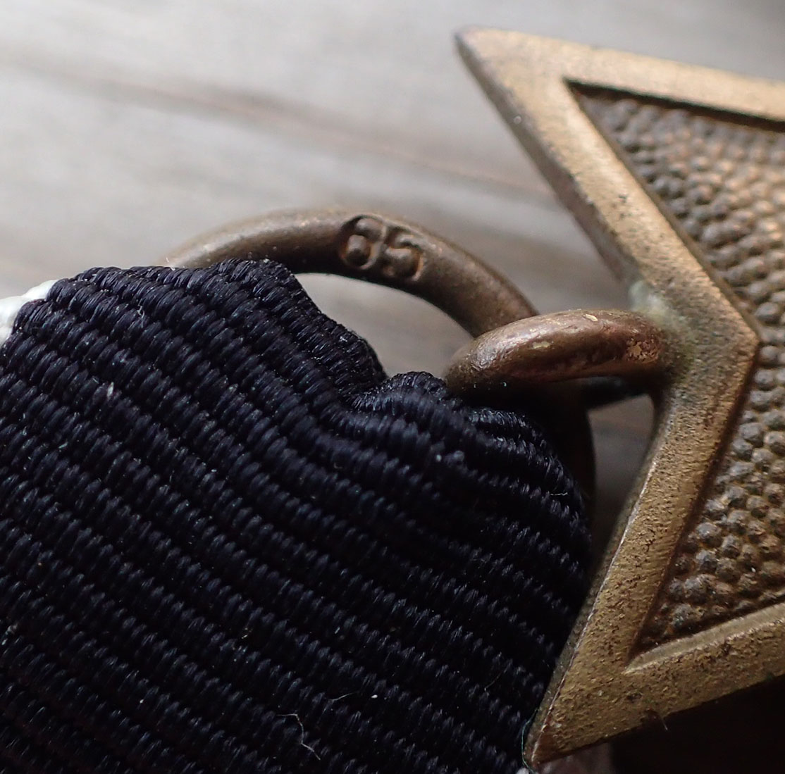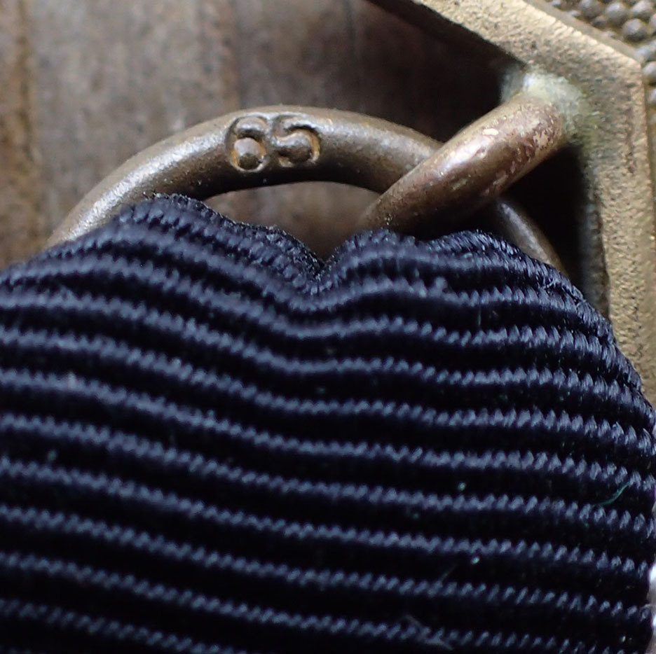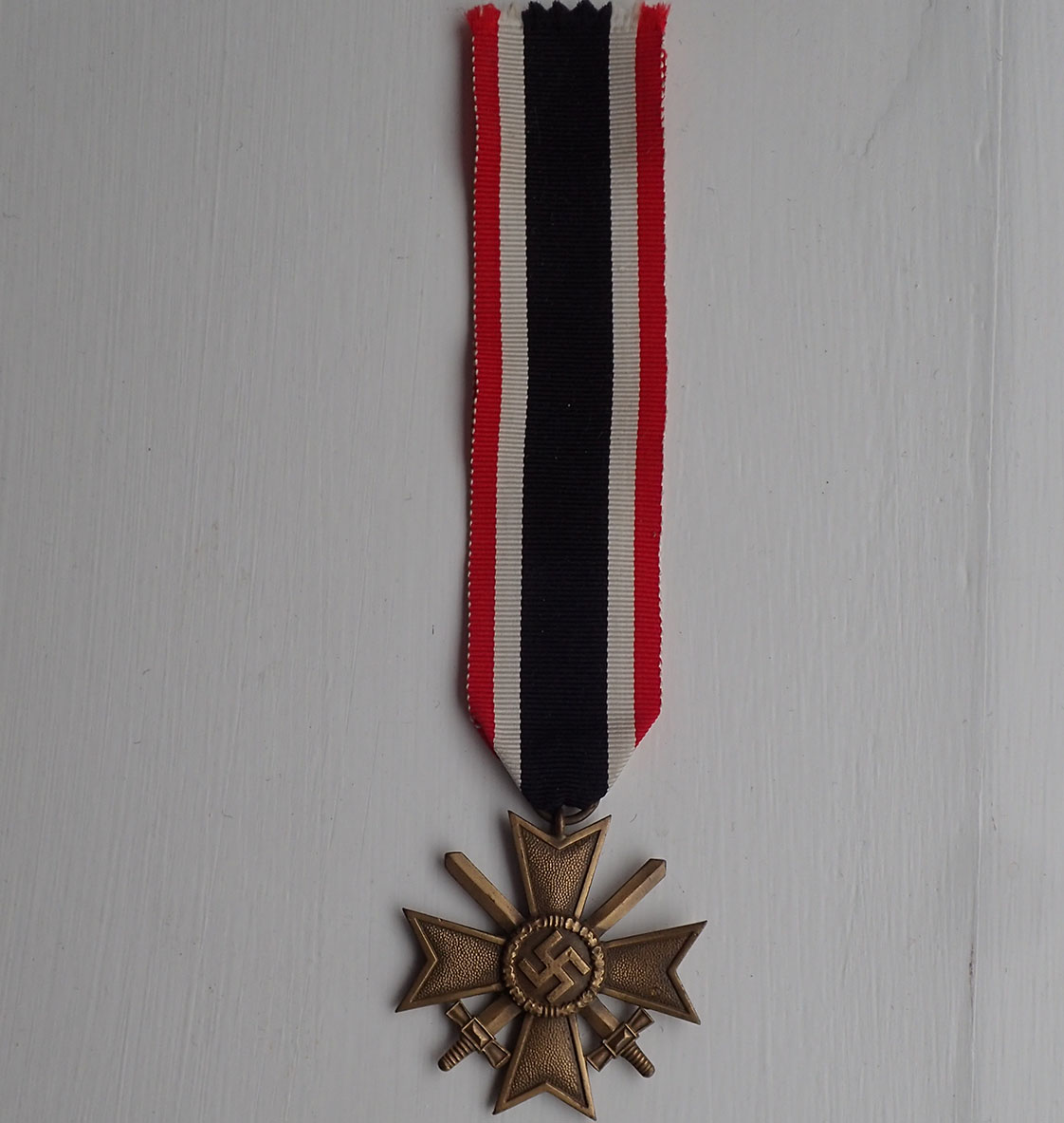 Krigsfortjenestekorset 2 klasse med sverd. Innstiftet 18. oktober 1939. Tidlig utgave i patinert messing. Stemplet med produsenten på ringen 65 (Klein & Quenzar A.G. Idar-Oberstein). Med full lengde bånd.