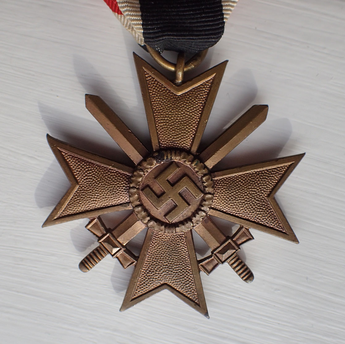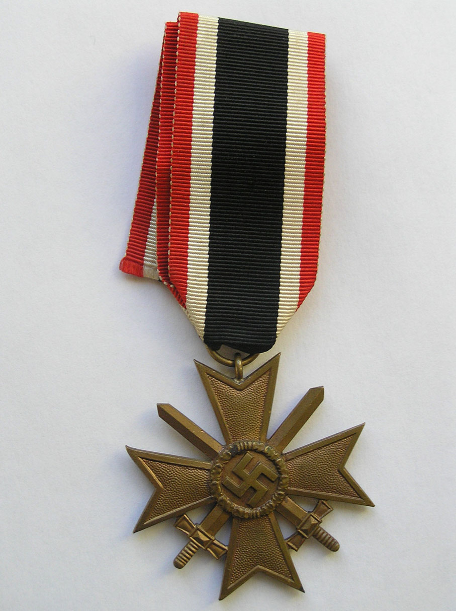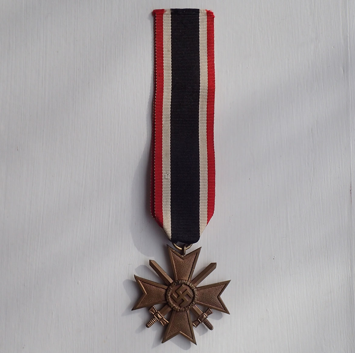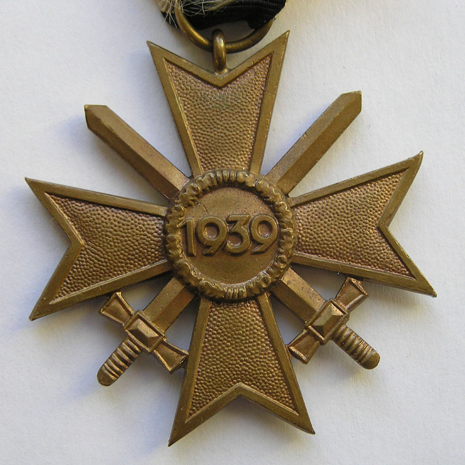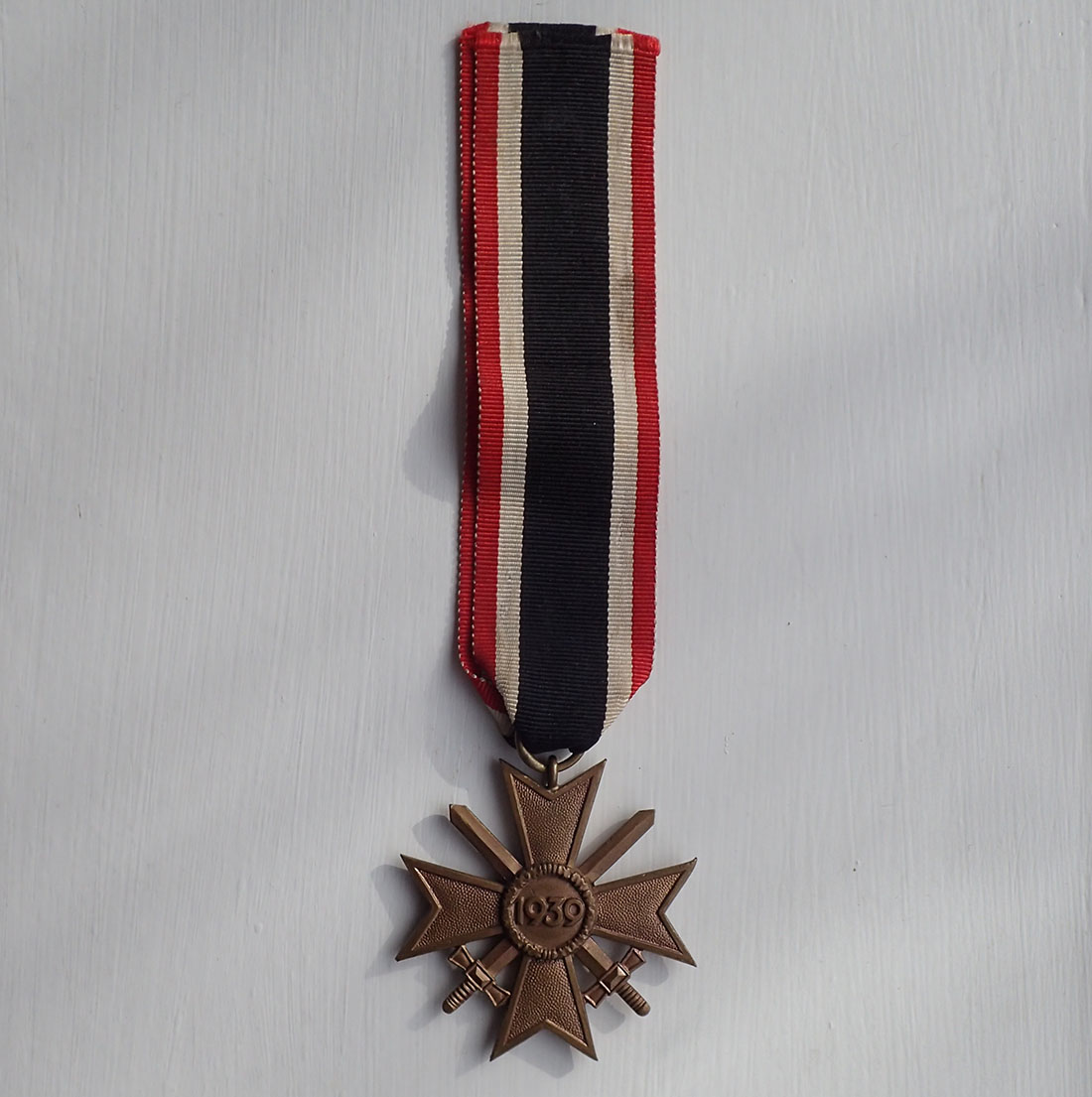 Krigsfortjenestekorset 2 klasse med sverd. Innstiftet 18. oktober 1939. Tidlig utgave i patinert messing. Med langt bånd.