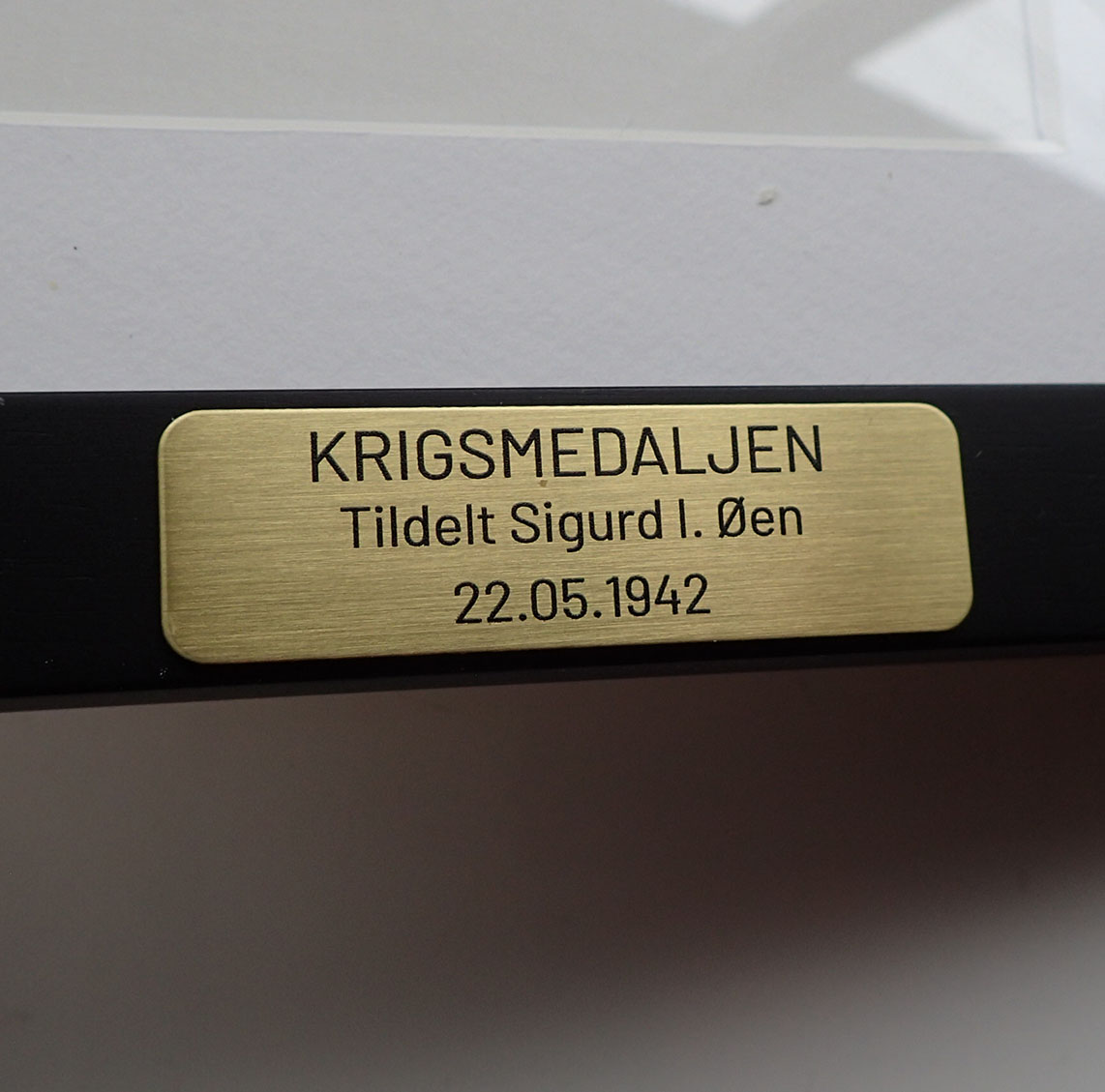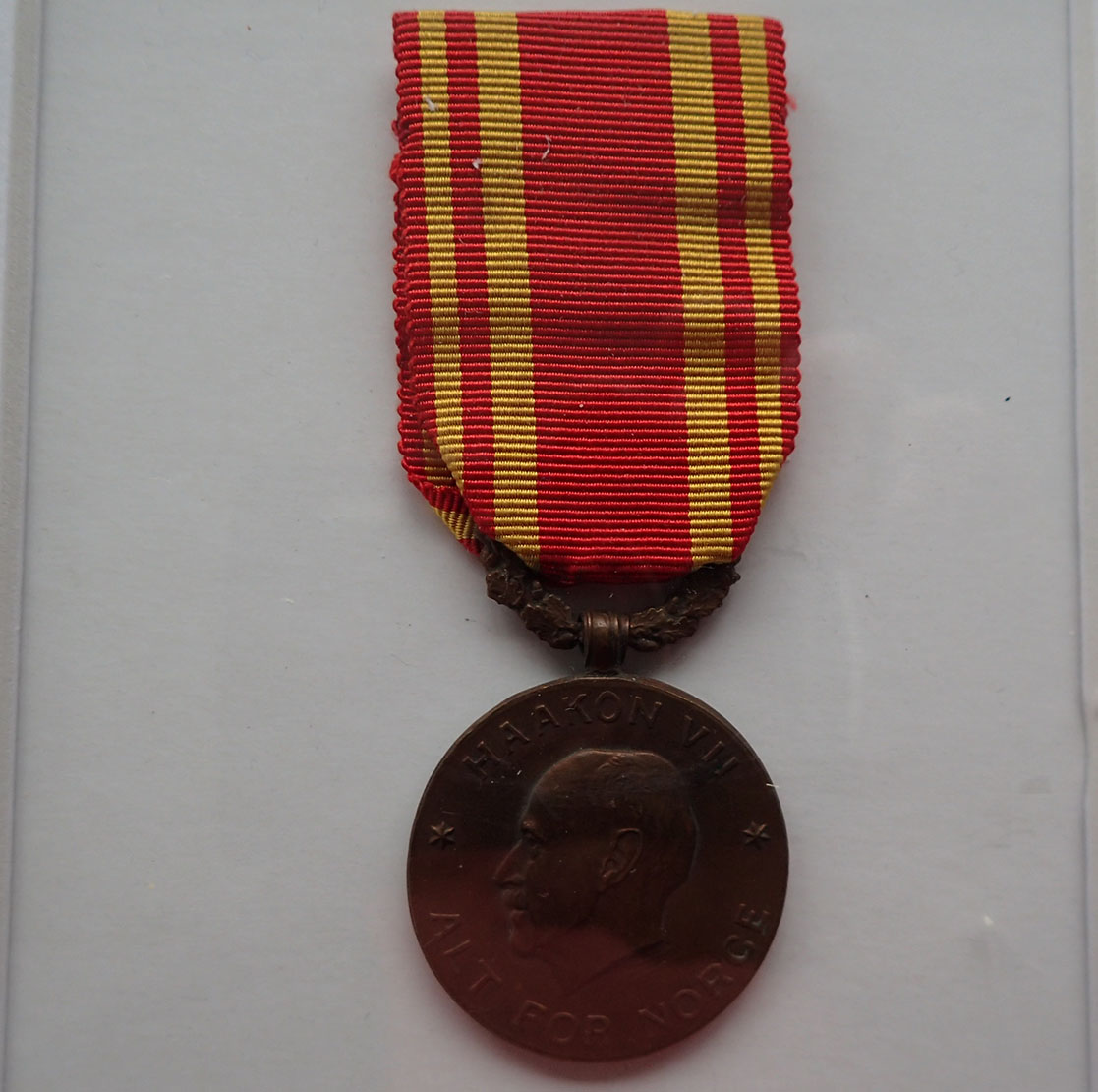 Krigsmedaljen er i patinert messing. Bak merket KRIGSMEDALJE. Bak på båndet nålhempe. Medaljen er i strøken stand. Medaljen er 1945 utgaven. Innrammet og påsatt skilt i messing nede på rammen. Medaljen ble tildelt 22. mai 1942 men ofte fikk man bare båndet under krigen, også fikk man selve medaljen utdelt når man kom hjem til Norge igjen.