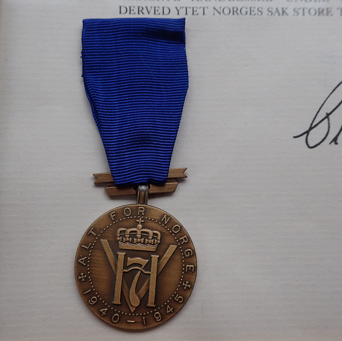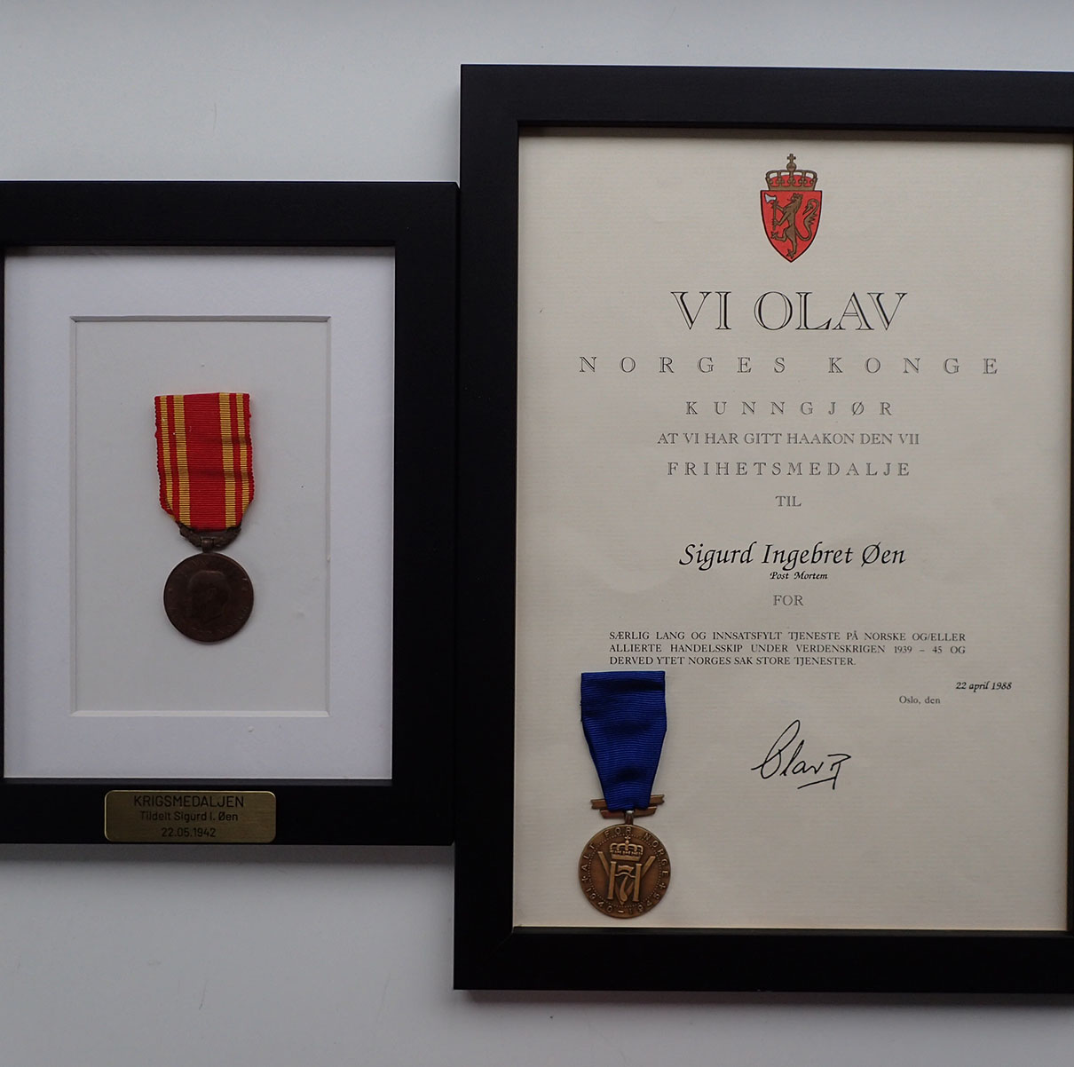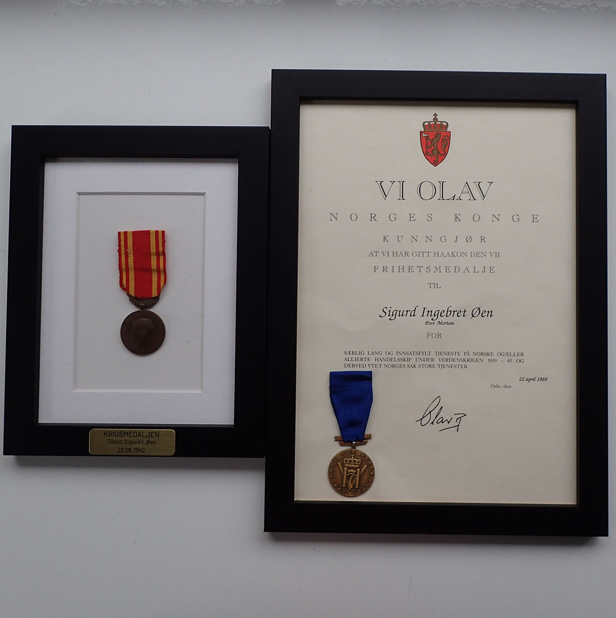 Krigsmedaljen + Frihetsmedaljen med diplom. Begge innrammet.